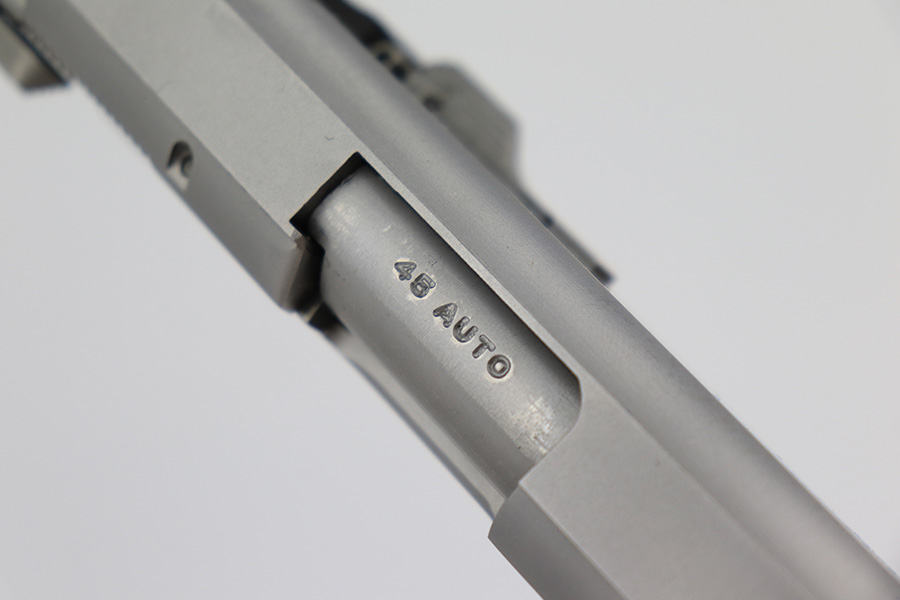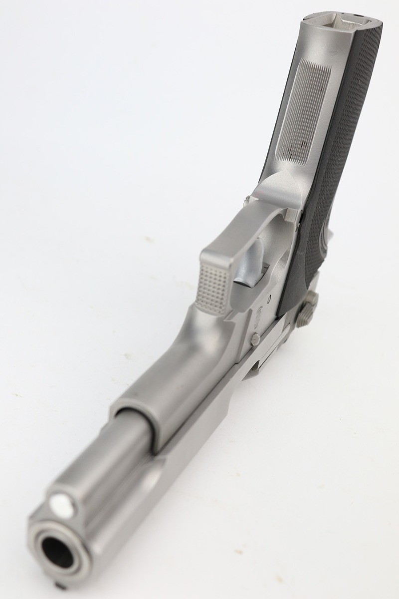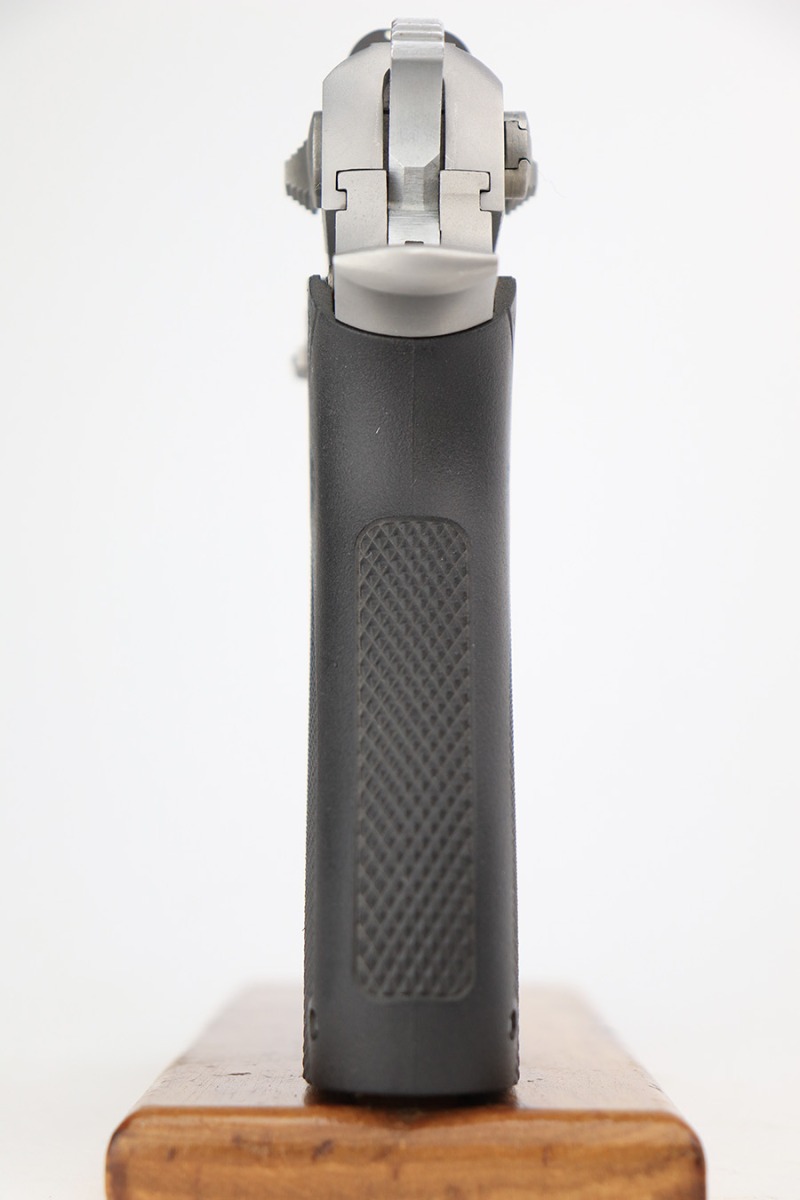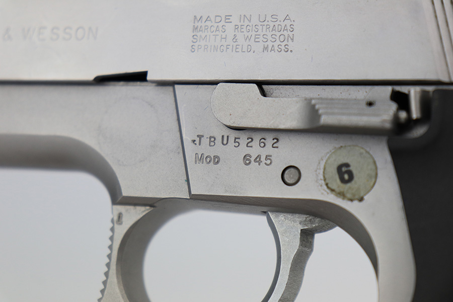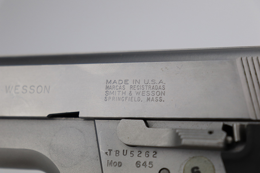 5/25/23 – This is a minty example of a Smith & Wesson Model 645 manufactured in 1985-88 and chambered in .45 ACP. The gun has a really nice matte stainless finish and shows very little sign of wear. There was a small sticker on the left side of the frame that we’ve peeled away. Fitted with excellent black plastic grips and comes with one proper magazine. The bore is near-mint.