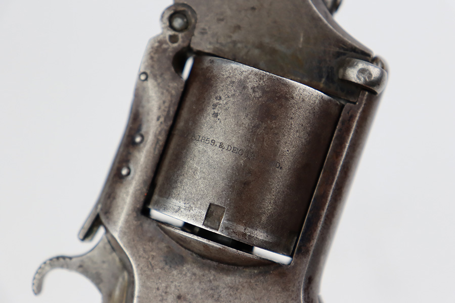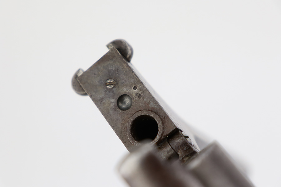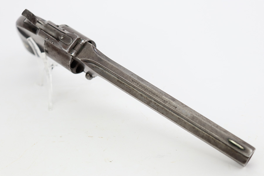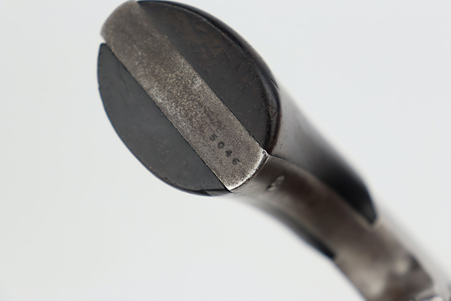8/2/23 – This is an original Smith & Wesson Model No 2 Old Army revolver, chambered in .32 Rimfire and manufactured between 1861-1874. Features a ribbed 6″ octagonal barrel and uses a “tip up” action introduced and patented for the Model 1. This example is the later variation, characterized by the addition of a third pin at the top strap to limit the travel upwards of the cylinder stop. Markings are crisp, with the top of the barrel maker marked, the cylinder showing the patent date, and the serial number stamped on the butt. The gun has retained roughly 30% of its original nickel finish, with signs of oxidation and brown patina throughout. More significant wear and surface scratches in areas around the cylinder and screws/pins on the left side of the frame. Bore has strong rifling but is pitted throughout. Comes with an original set of well-fitted brown wooden grips that have some minor dings and handling marks throughout. Mechanically excellent. Antique, so no licensing required.