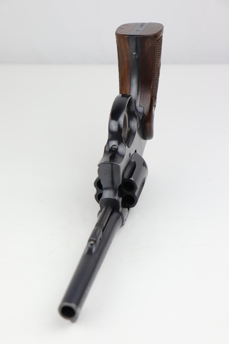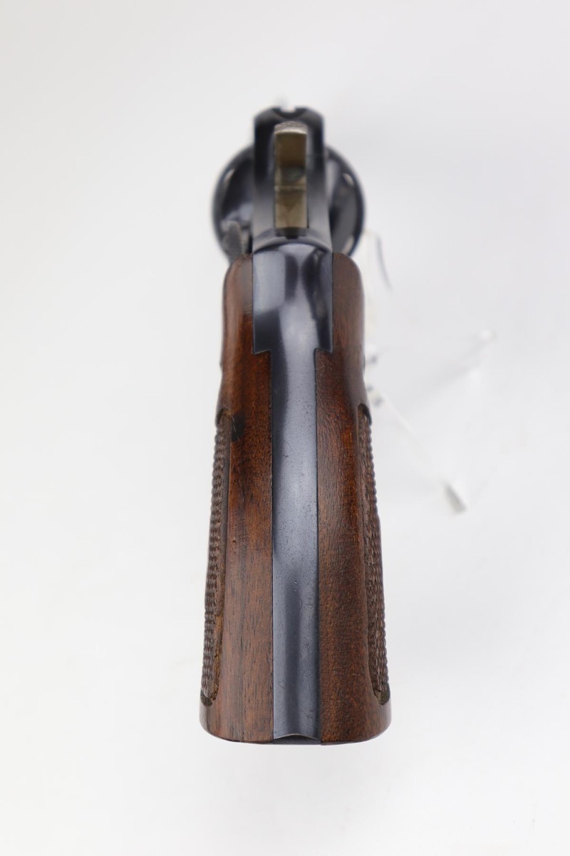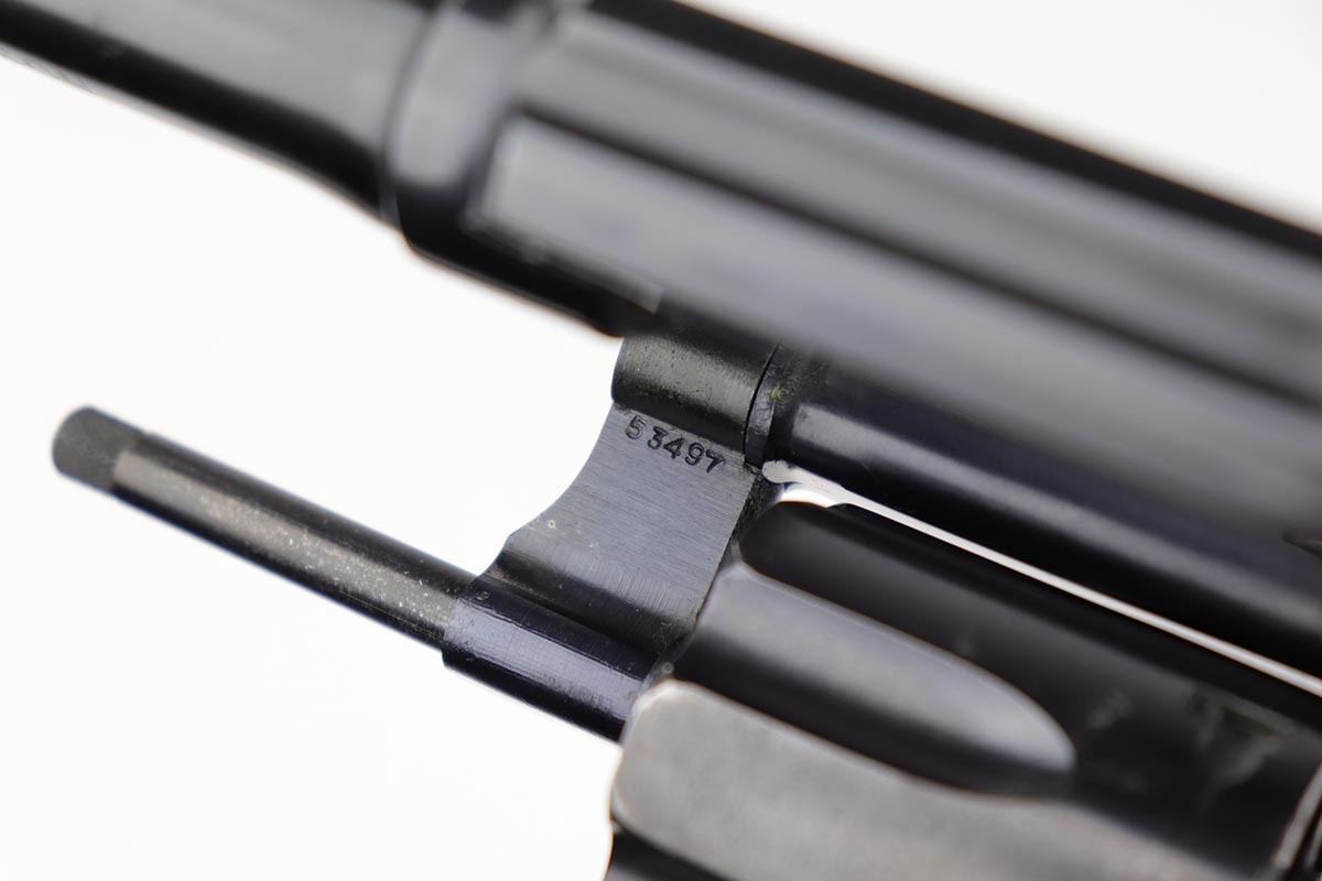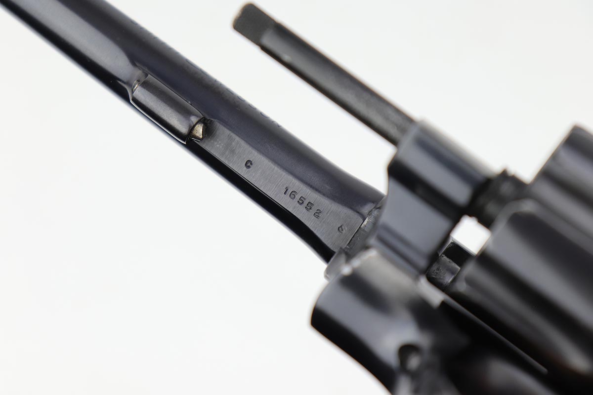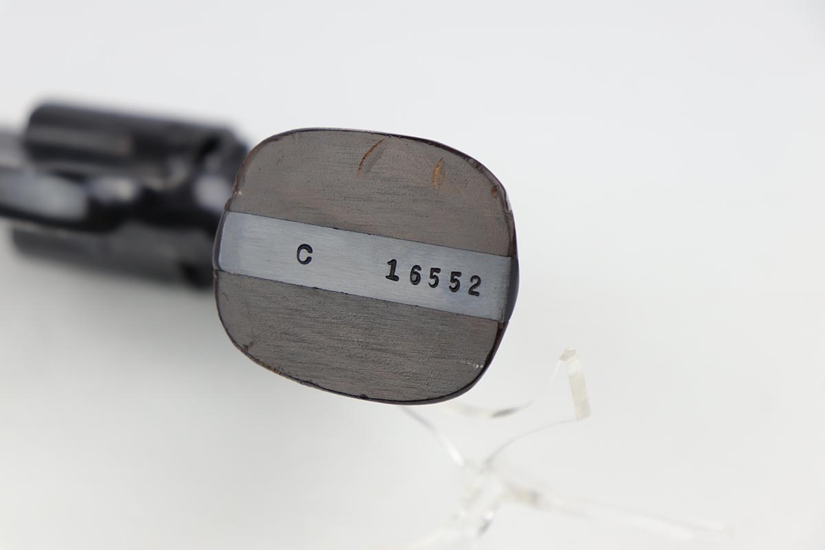 7/9/19 – This six-shot revolver is a great example of the American classic Smith & Wesson M&P revolver, which later evolved into the model 10. Serial records date this gun to the 1950s, likely earlier in the decade. The “C” prefix to the serial number dates this revolver to between 1948 and 1968 when a transition was made to the “D” prefix. Based off the serial, this falls early in the range. It has a five inch barrel and is chambered for .38 S&W special. The gun is all original with 95+% lustrous blue remaining, showing minor muzzle and edge wear, and some finish loss on the cylinder. Strong, shiny bore and good timing/action. The original grips are present, as the right panel is matching numbered to the frame. They are sharp and in very good condition, with a few minor nicks and dings.