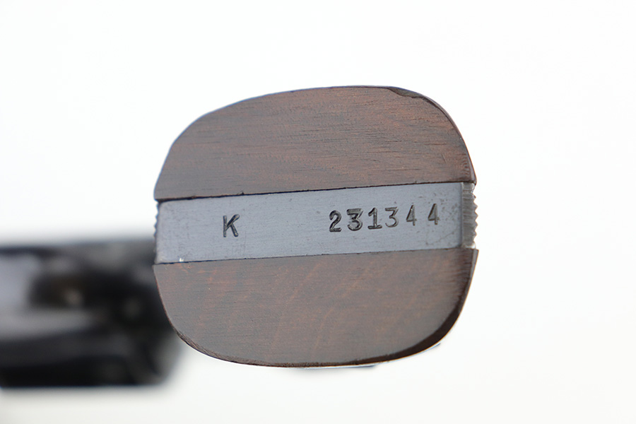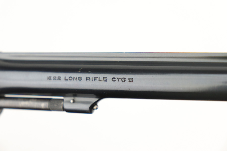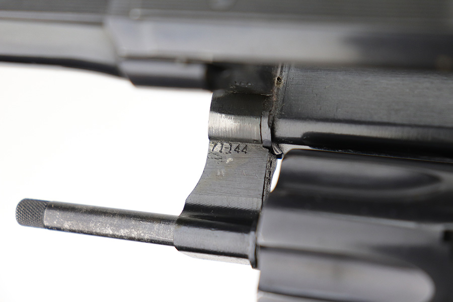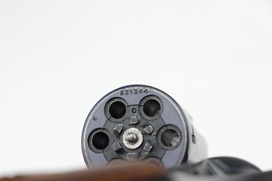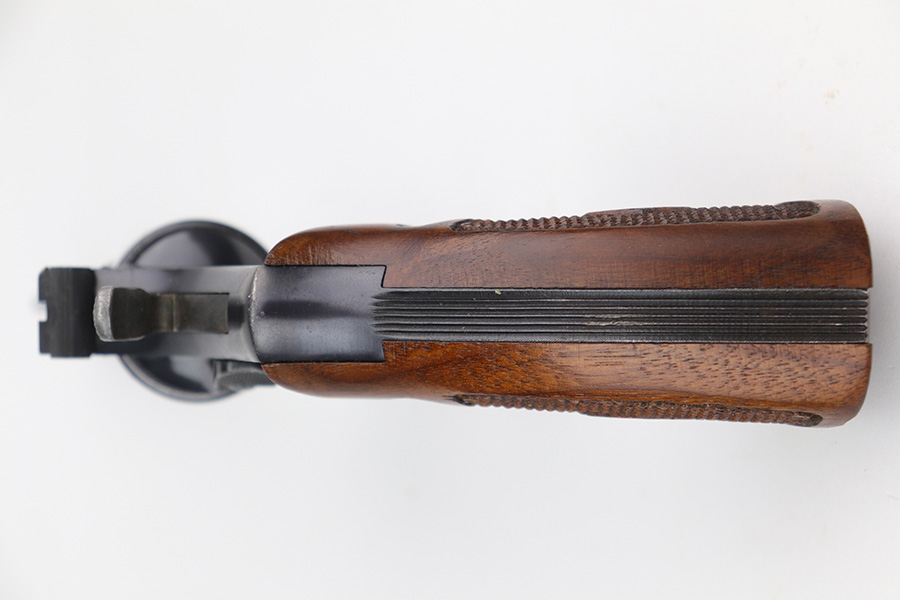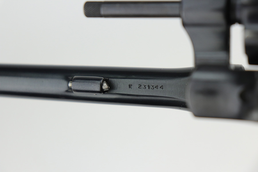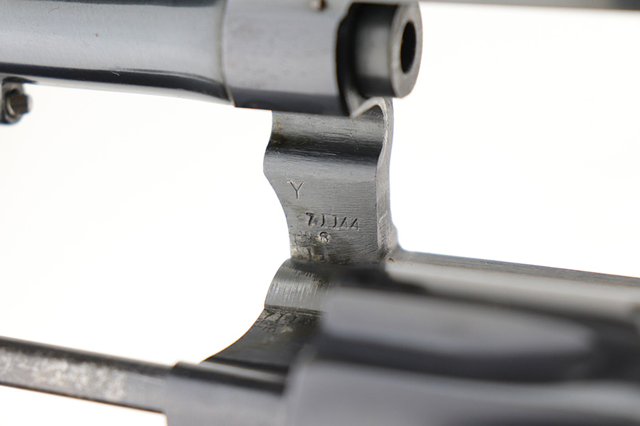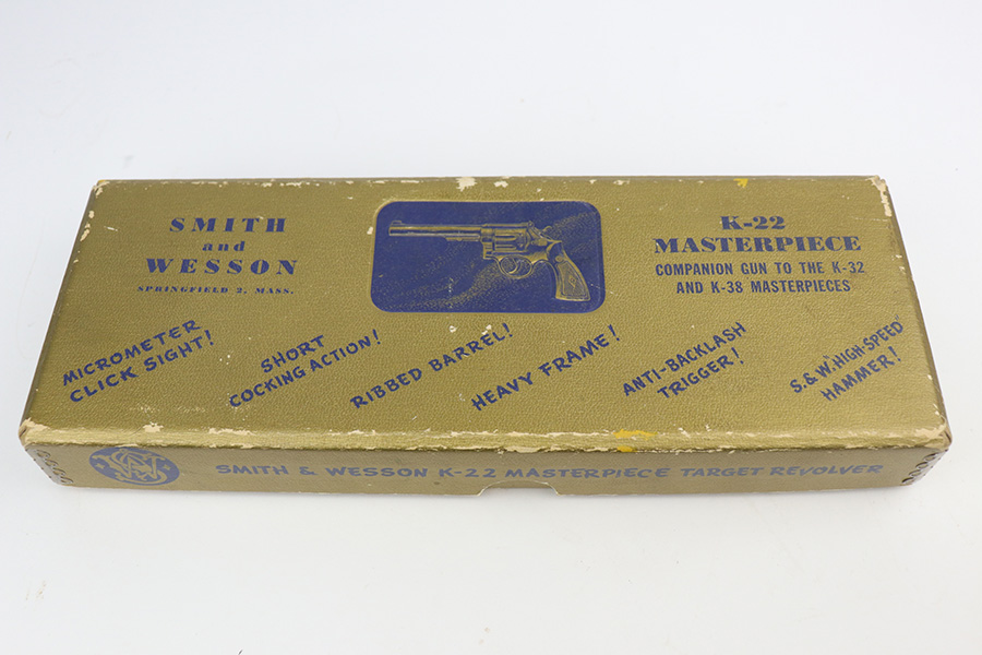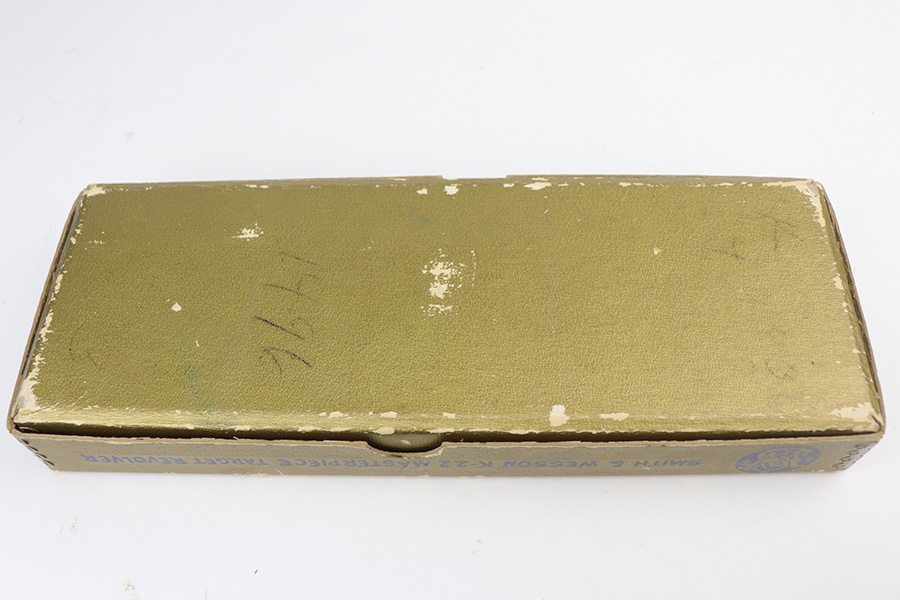 9/21/21 – This is an excellent Smith & Wesson Pre-17 Masterpiece revolver from 1955 in an original S&W box. The gun has 96-97% of the original blue remaining, with most of the thinning on the left side of the barrel, and a standard turn line on cylinder. Matching frame, cylinder and barrel. Minty bore and grips, though right grip panel is a mismatched serial. Box is hand-numbered on bottom but also mismatched. Six inch barrel. Five screw frame design.