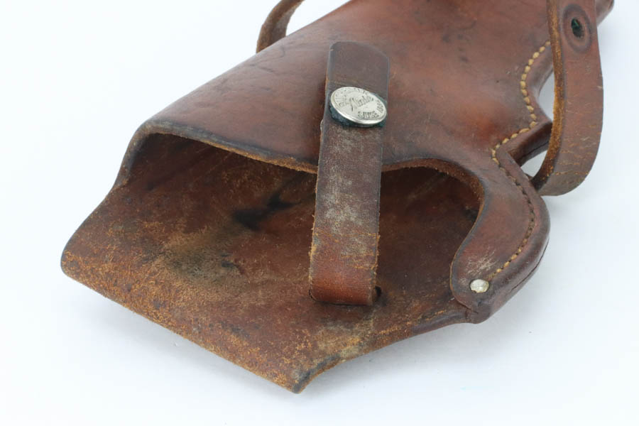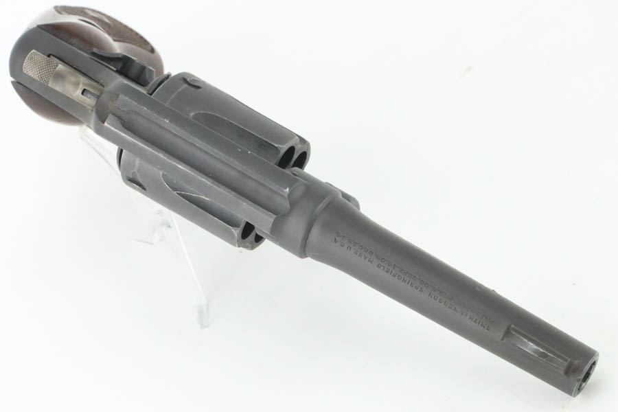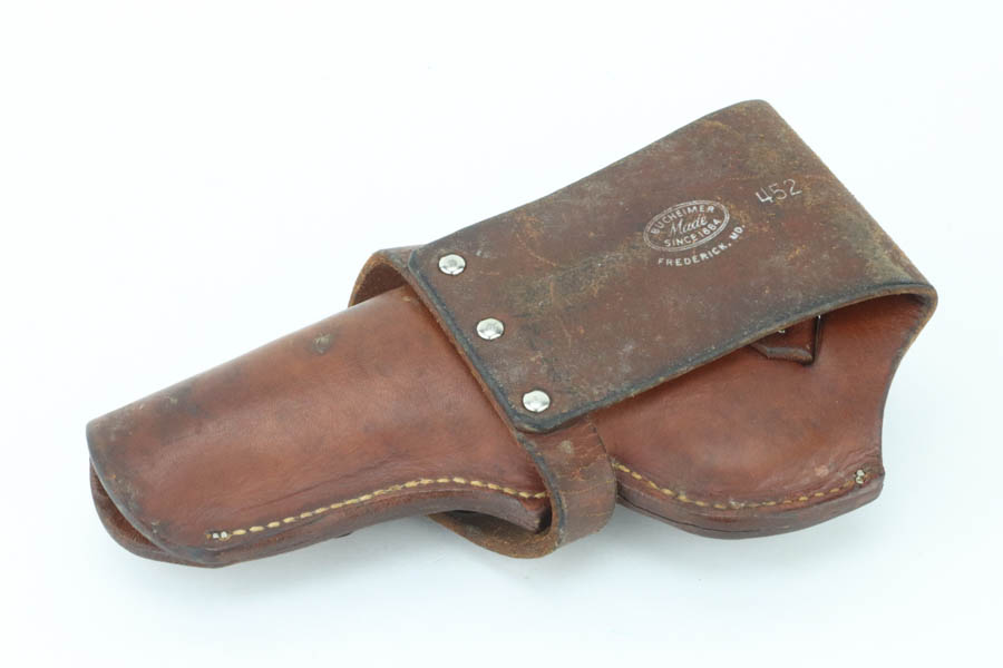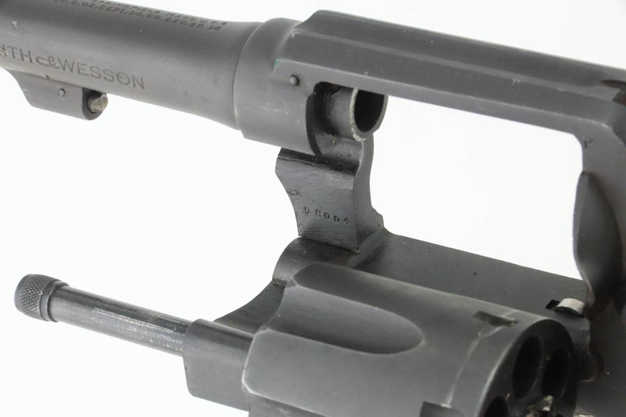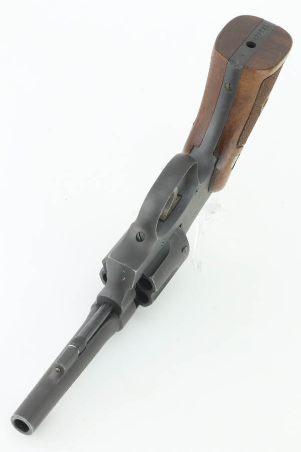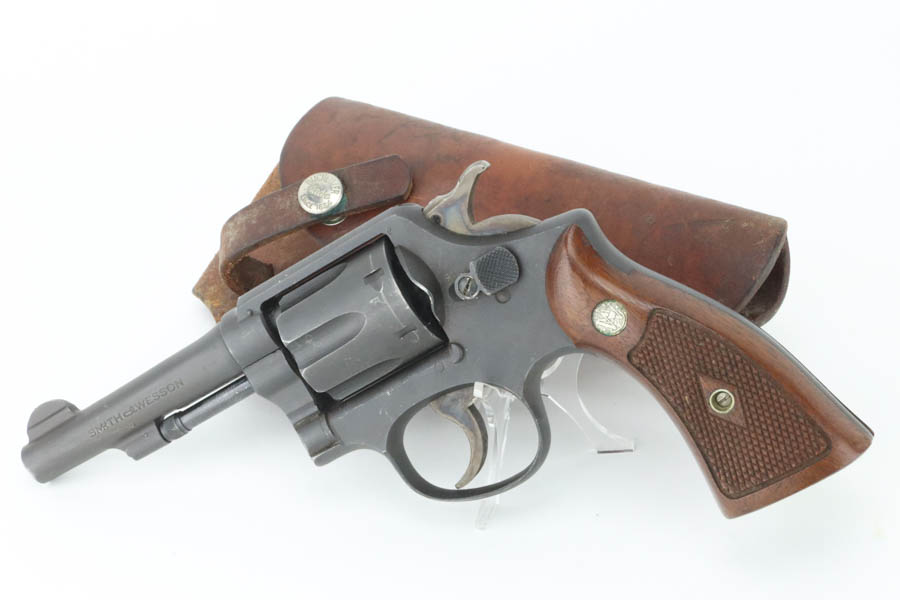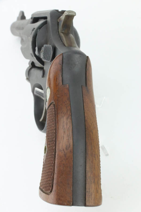 8/7/24 – This is a Smith & Wesson Victory Model rig from World War II. It is U.S. Made from 1942 to 1944, with a production run of ~500,000, these were standard issued side arms for US Navy and Marine air crews due to their size and ease of operation. Property marked and G.H.D (Guy H. Drewry) inspector marked. It is all matching and has the serial number stamped on the butt of the frame, the underside of the barrel, and on the back of the cylinder. Flaming bomb proof is slightly faded but clearly visible on the top strap to the left of the U.S property marking. There are military “P” proofs on the left side of the frame, cylinder, and underside of the barrel. The gun has retained about 95% of its finish, with wear on some of the high edges, and some surface scratches and handling marks here and there. A couple small dings on the left side of the barrel, and some very minor oxidation on the back strap. A bit of muzzle wear, and a roll mark on cylinder. Minty bore, and excellent mechanics. Fitted with an excellent set of hand-checkered commercial grips, and a commercial Bucheimer holster that fits perfectly.