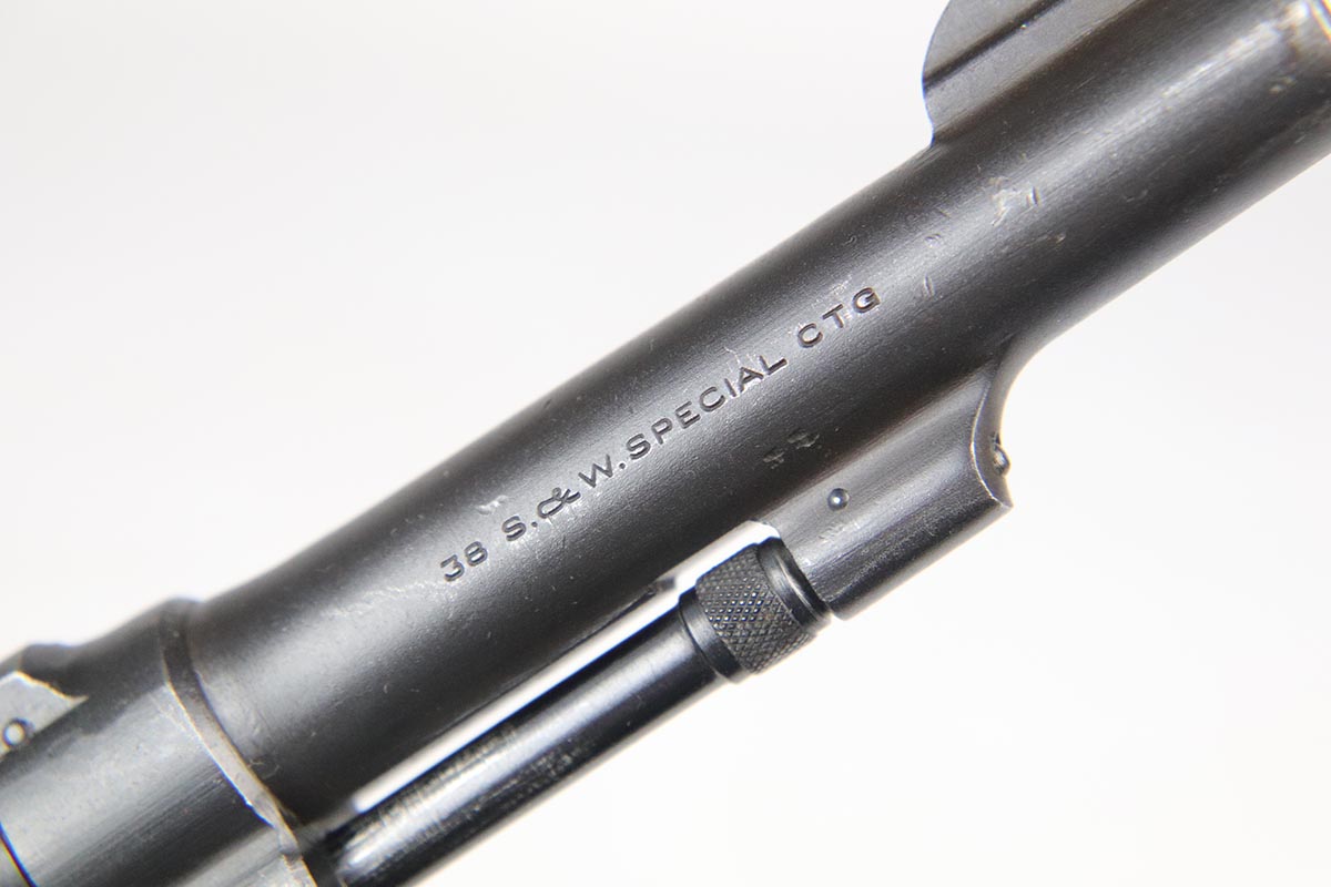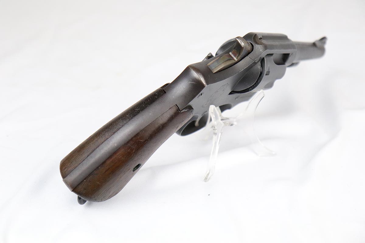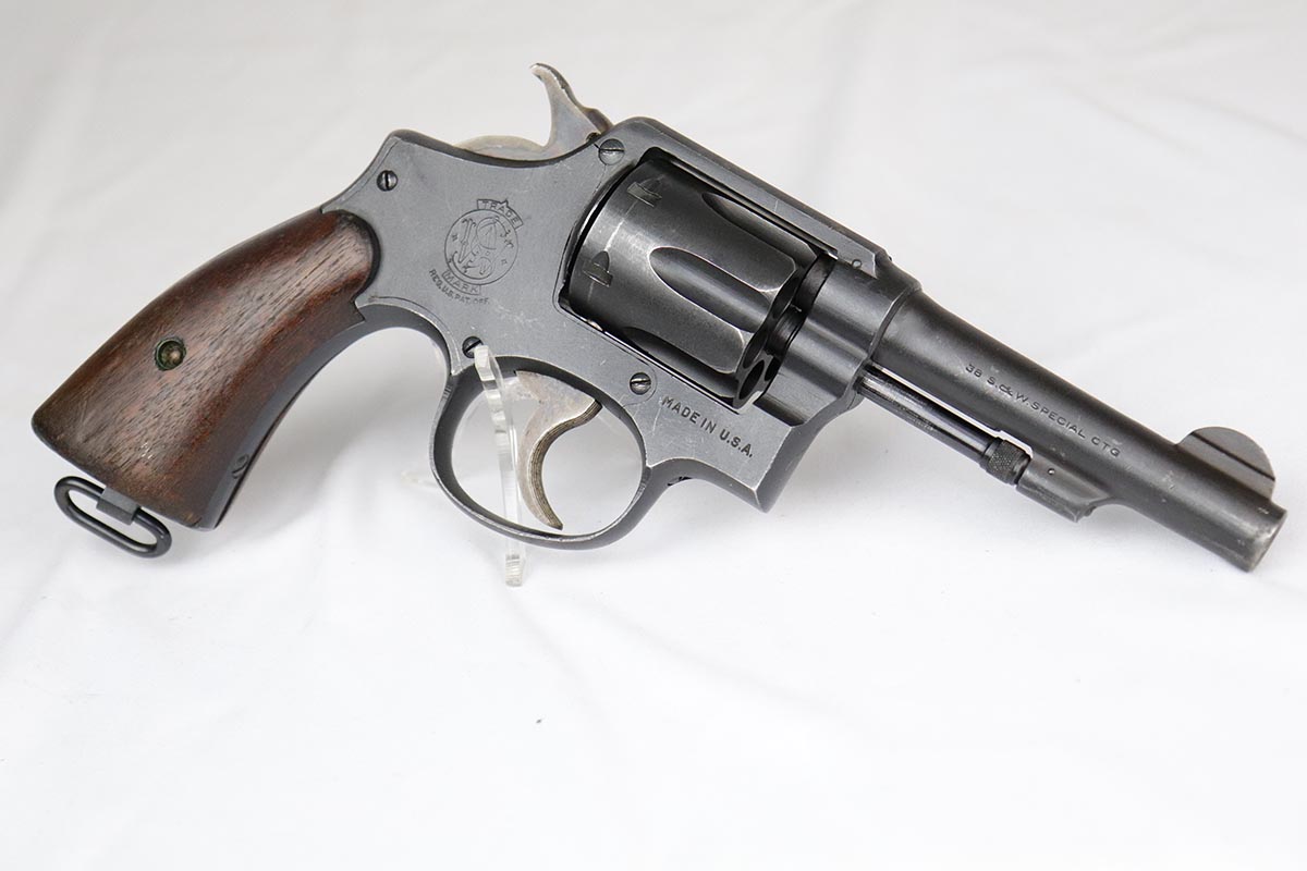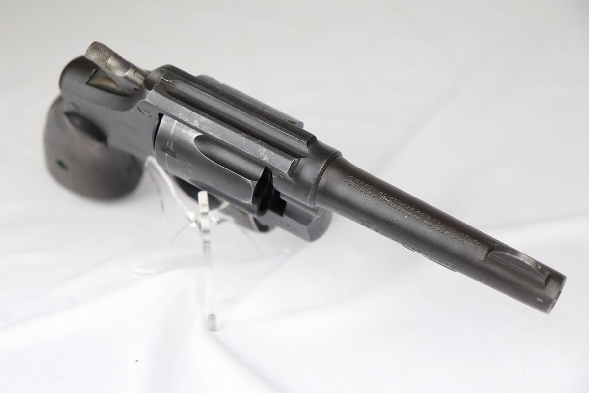 4/25/18 – This is a Smith & Wesson Victory Model from World War II. It is U.S. Property marked and G.H.D (Guy H. Drewry) inspector marked. The original finish is about 97% with some thinning on the frame and roll marks.  Excellent bore. Made from 1942 to 1944. All had a V prefix. There were a little over a half million made. They were standard issued side arms for US Navy and Marine air crews due to their size and ease of operation.  It is .38 S&W special that the U.S. military used.