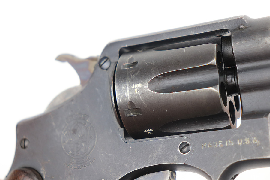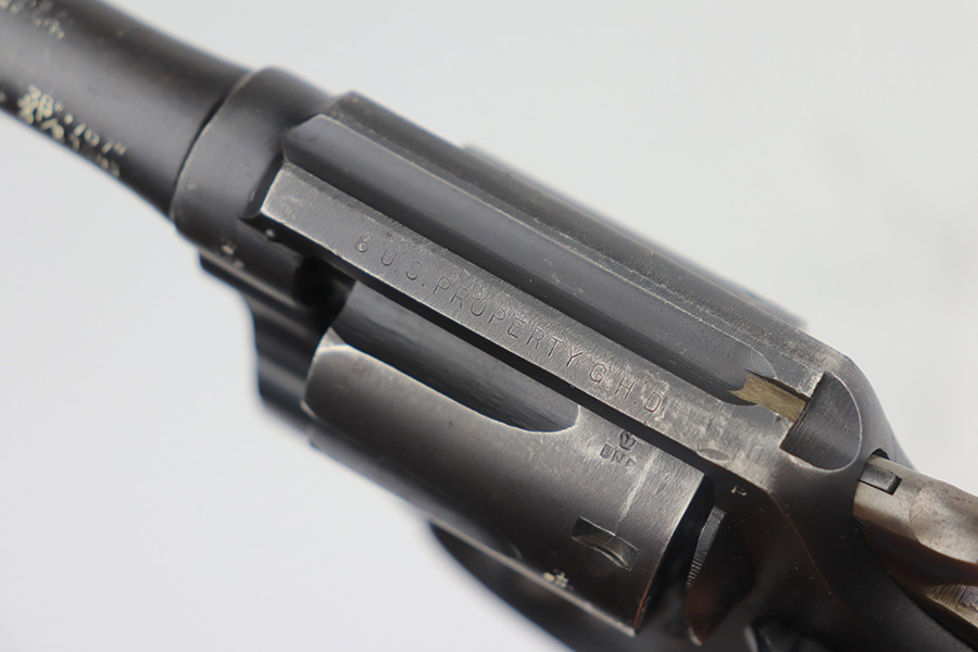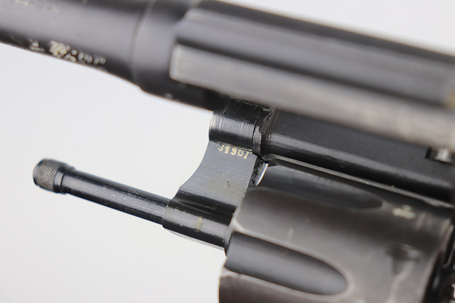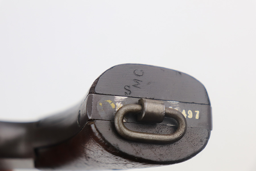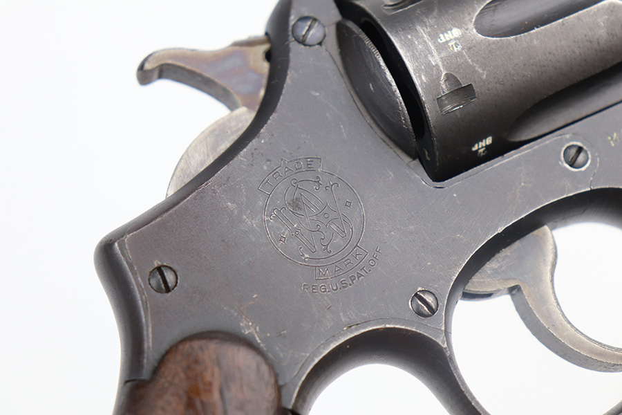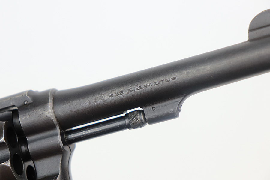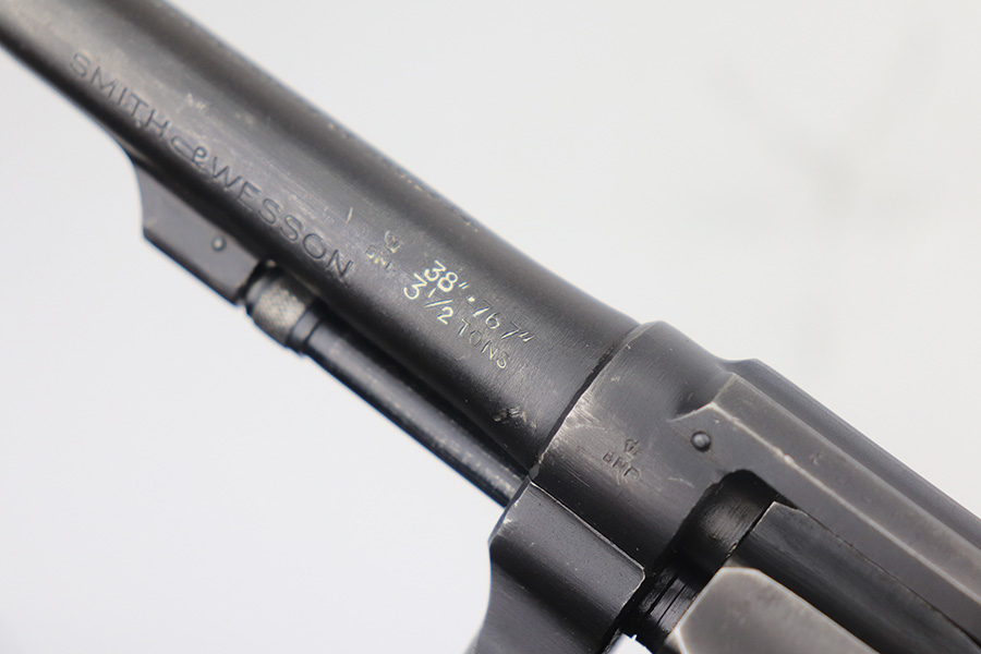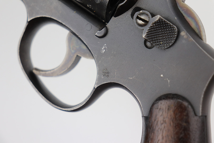 5/26/21 – This is a nice Smith and Wesson Victory Revolver that was part of the British Lend Lease Program with the US during WW2. The gun is all correct, matching, and has the proper “US Property” marking. British proofs throughout. There is an “SMC” marking on the bottom of the grip. What not sure what it means. If someone knows, please feel free to email us. It has retained about 92-93% of its original finish. Generally, there is wear on the high edges and around the muzzle. Small handling marks here and there. Light roll mark on the cylinder. Minor patina on the straps. Case hardening is intact on the trigger and hammer. The cylinder is tight and the action is smooth. Excellent grips. Mint bore.