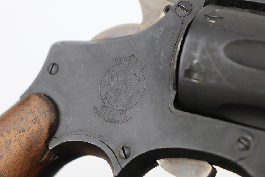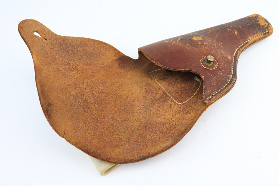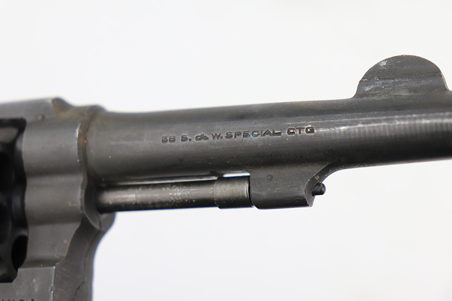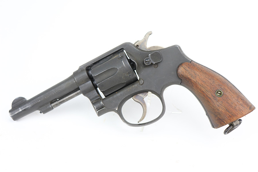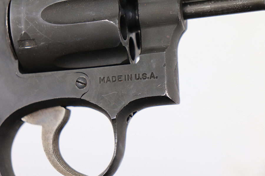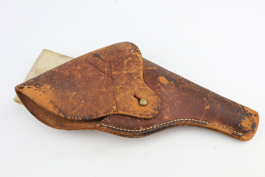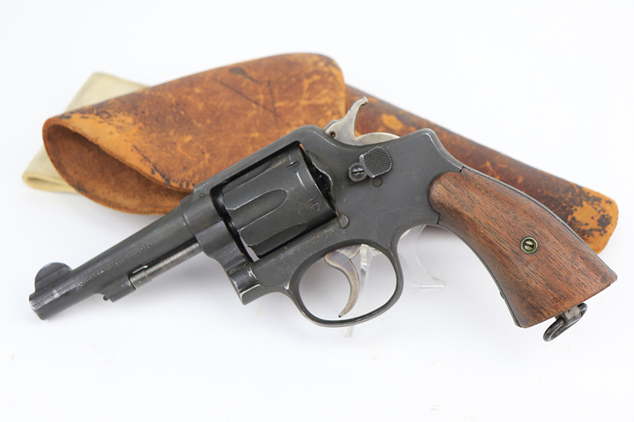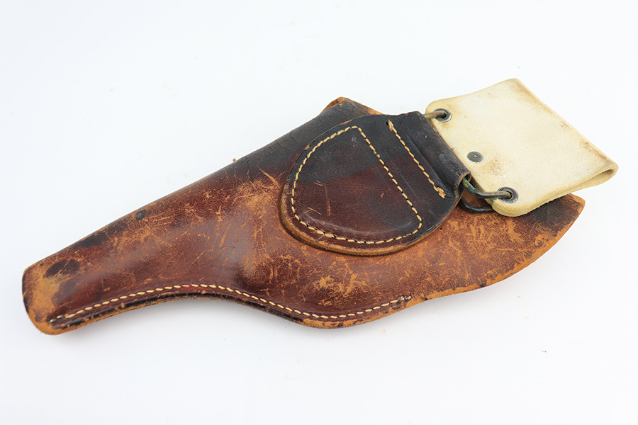 2/17/22 – This is a nice example of a matching and original Smith & Wesson Victory revolver from the World War II era. It has about 93-94% of the original parkerized finish remaining with some wear on the left side of the barrel and trigger guard. Excellent bore and good mechanics. Original Victory grips but right panel is mismatched to the gun. Comes with a leather holster that has notable cracking but is intact.