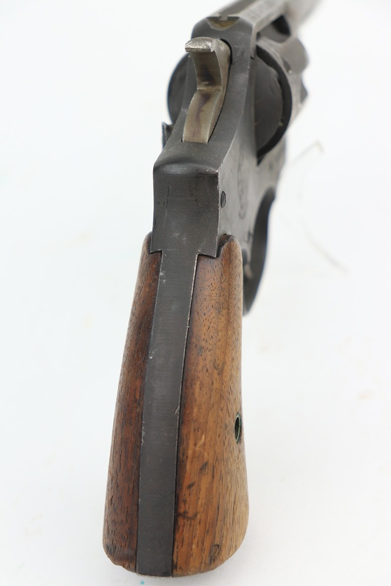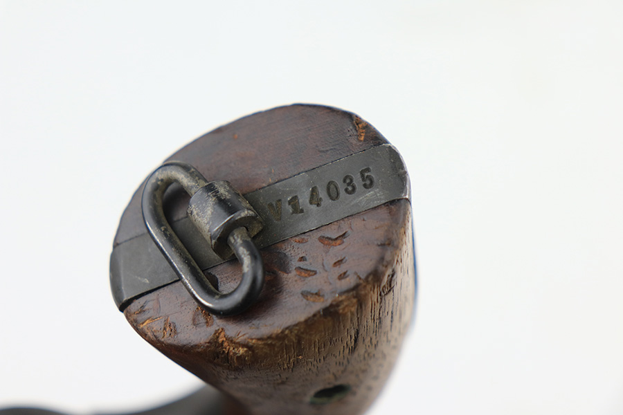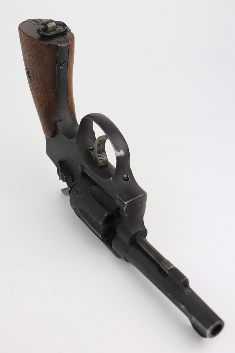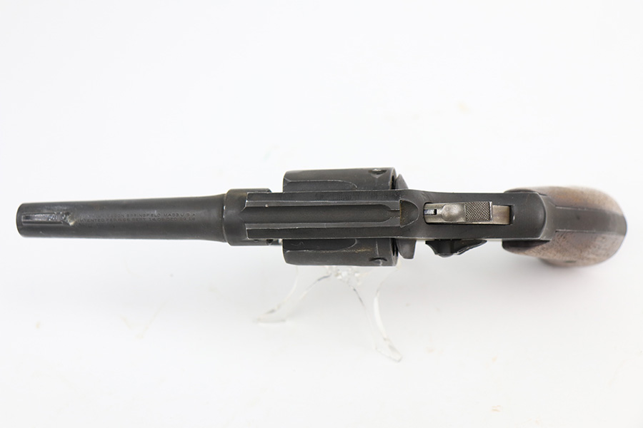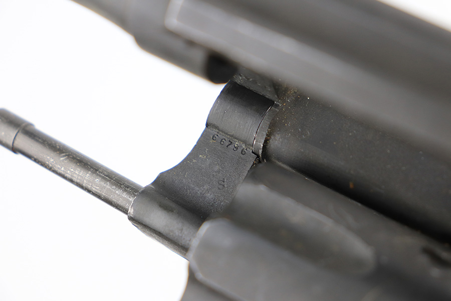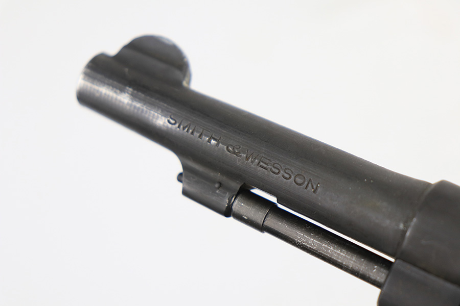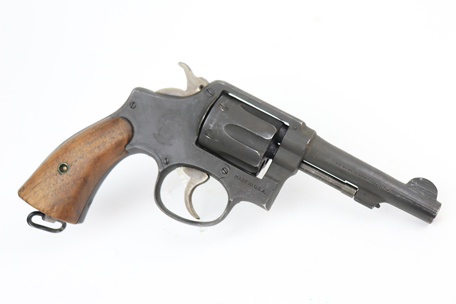 2/17/22 – This is a nice example of a matching and original Smith & Wesson Victory revolver from the World War II era. It has about 93-94% of the original parkerized finish remaining with some wear on the left side of the barrel and trigger guard. Excellent bore and good mechanics. Original Victory grips but right panel is mismatched to the gun. Comes with a leather holster that has notable cracking but is intact.
