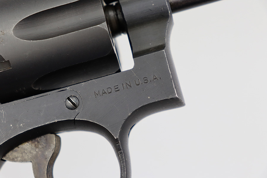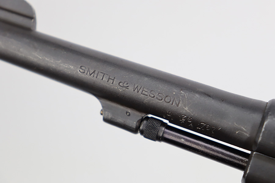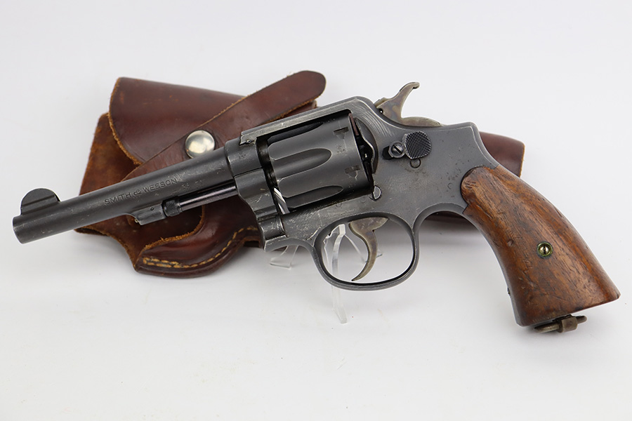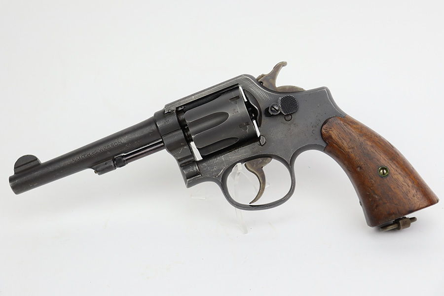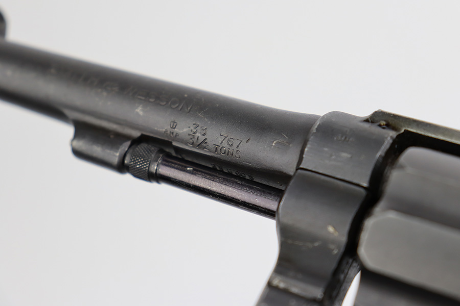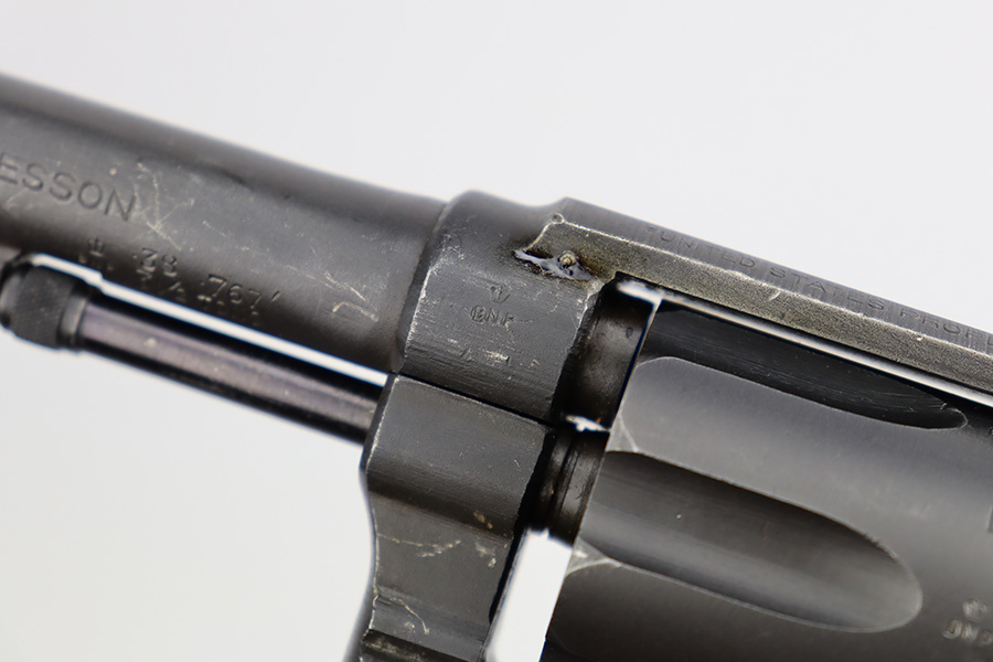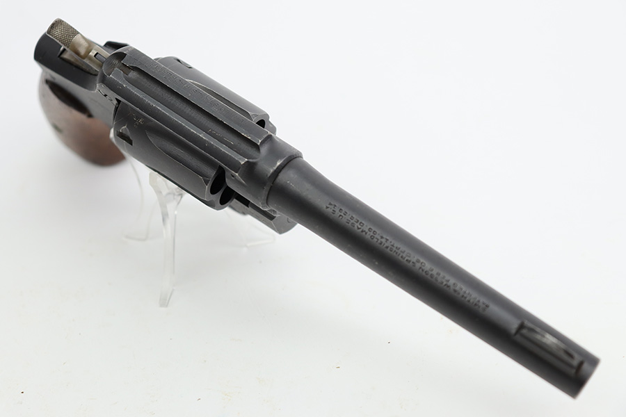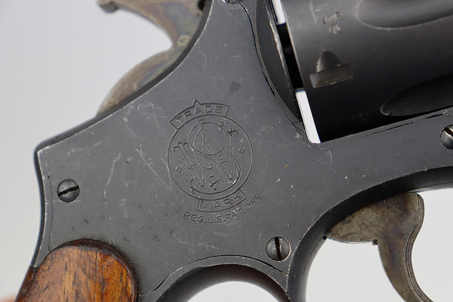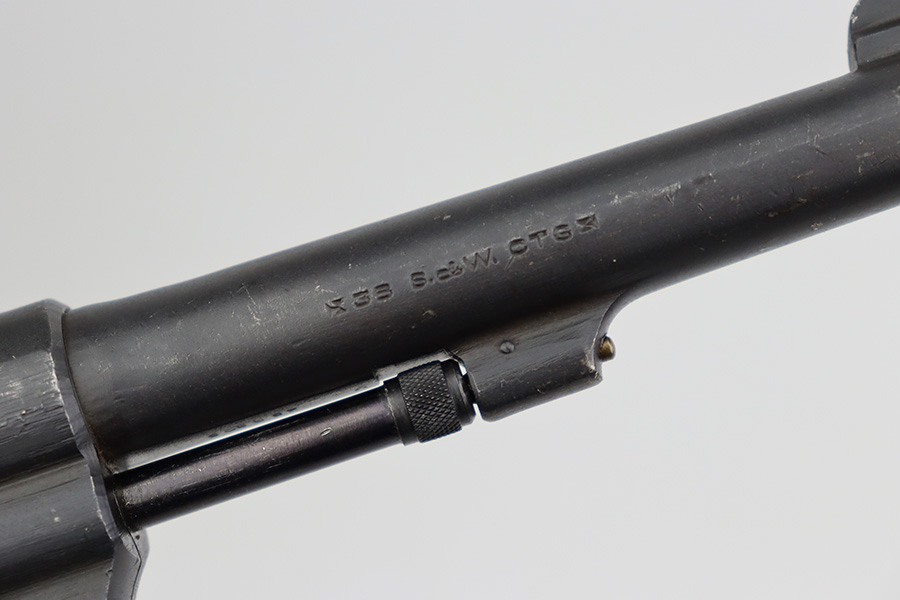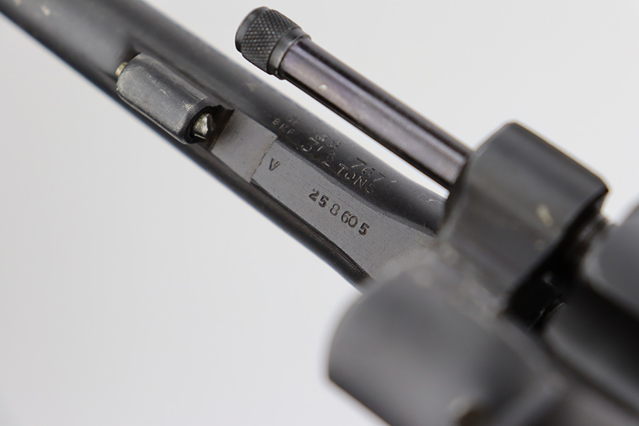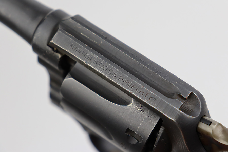 8/16/23 – This is an excellent example of a Smith & Wesson Victory revolver from WW2. It is matching and has British military proofs, indicating it was part of the Lend-Lease Program between the US and England. The top strap is “United States Property” marked, and the butt of the frame has a “GHD” military inspection stamp and a flaming bomb proof. It comes with an excellent modern leather holster. The gun itself has retained about 94-95% of its original parkerized finish. There is general minor high edge wear, some light surface scuffs here and there, and a few small spots of dark discoloration on the left side of the frame. Fitted with correct wood grips – the right panel is numbered and matching. Bruising on both sides. Mint bore.