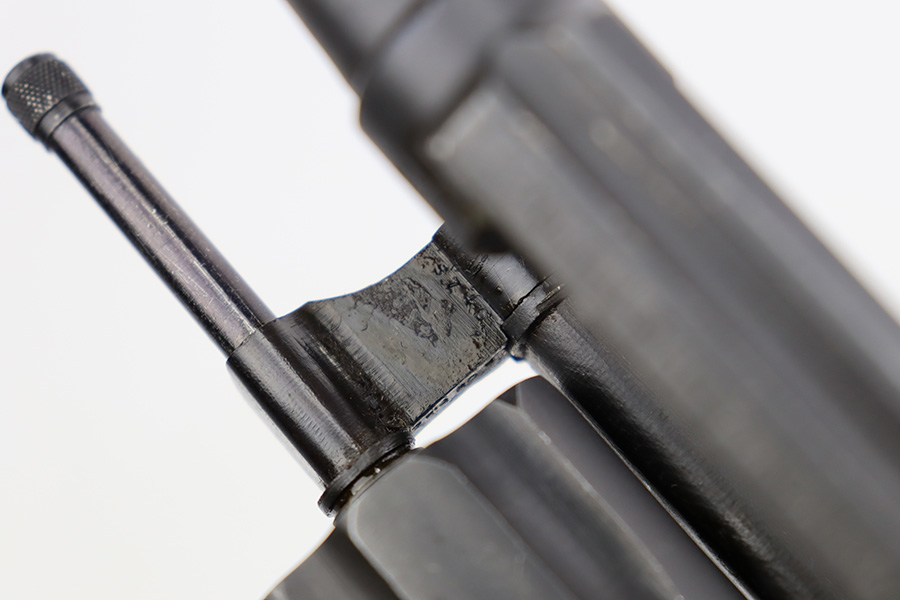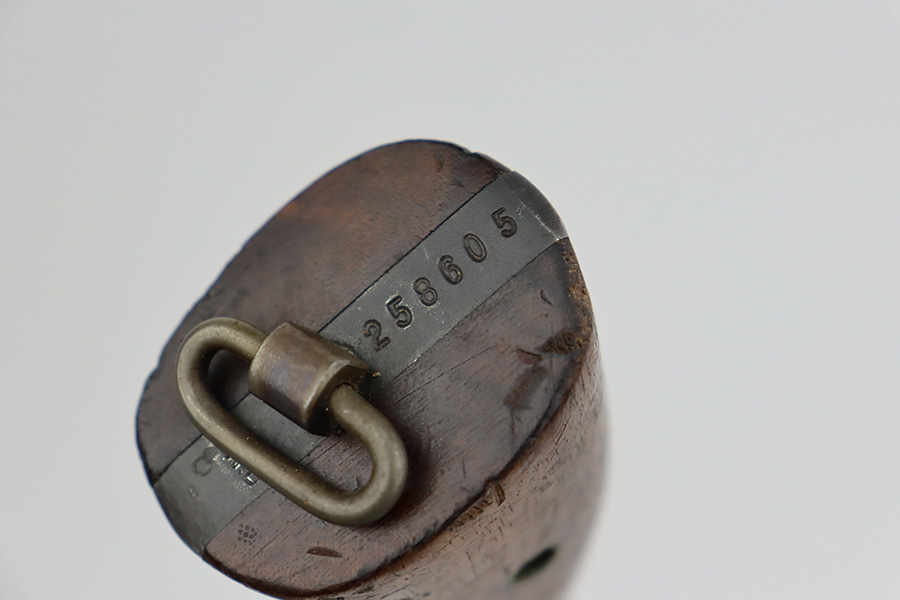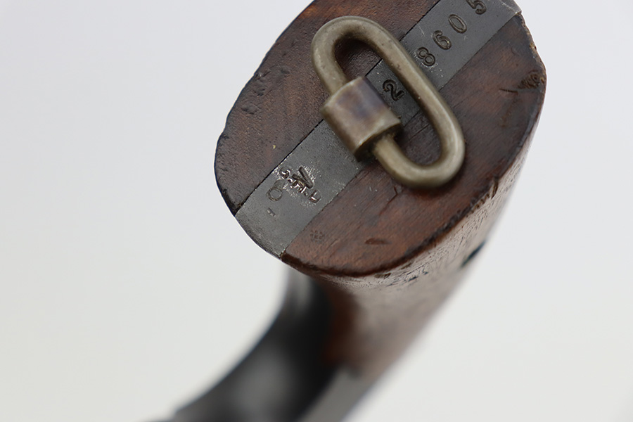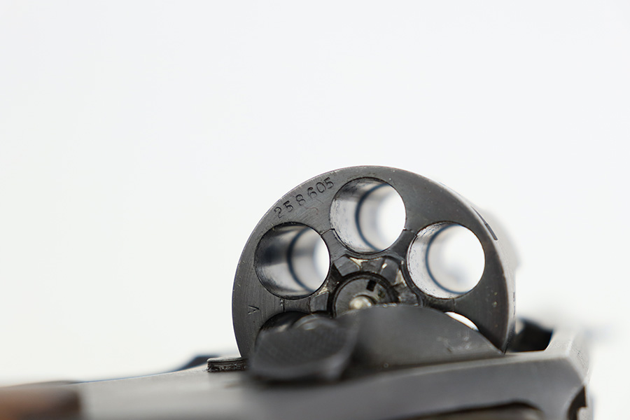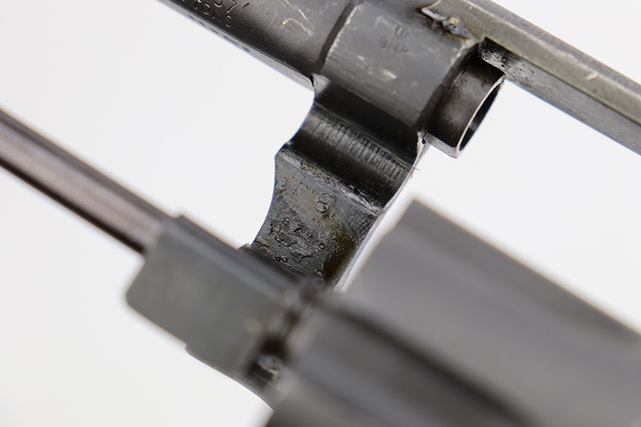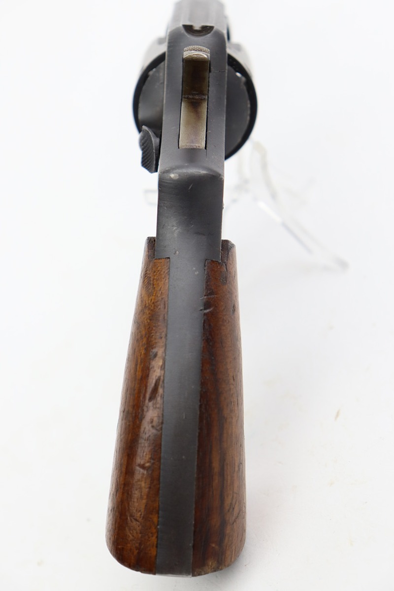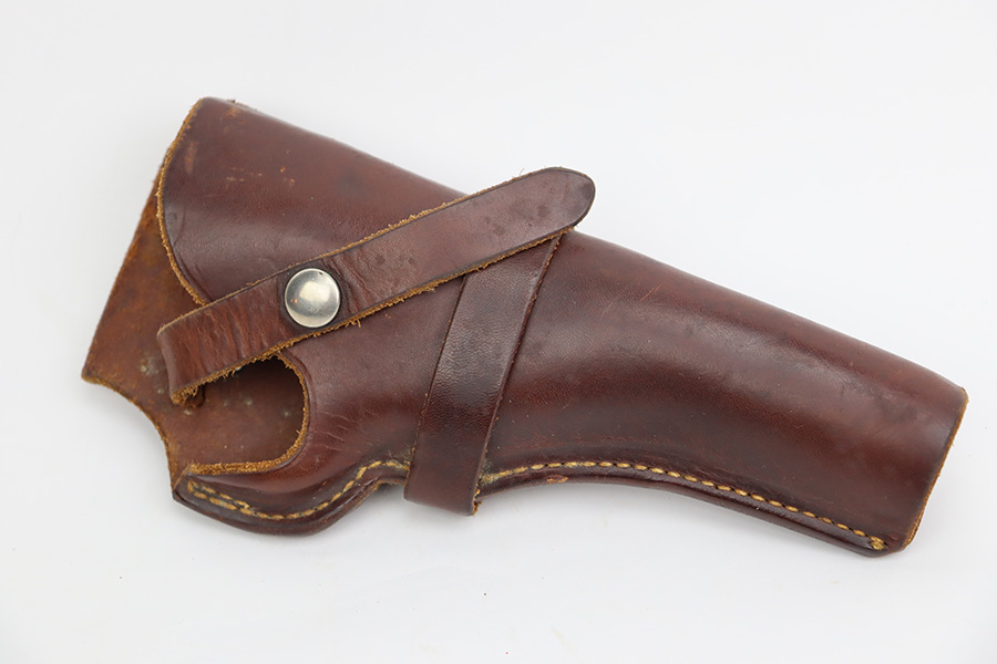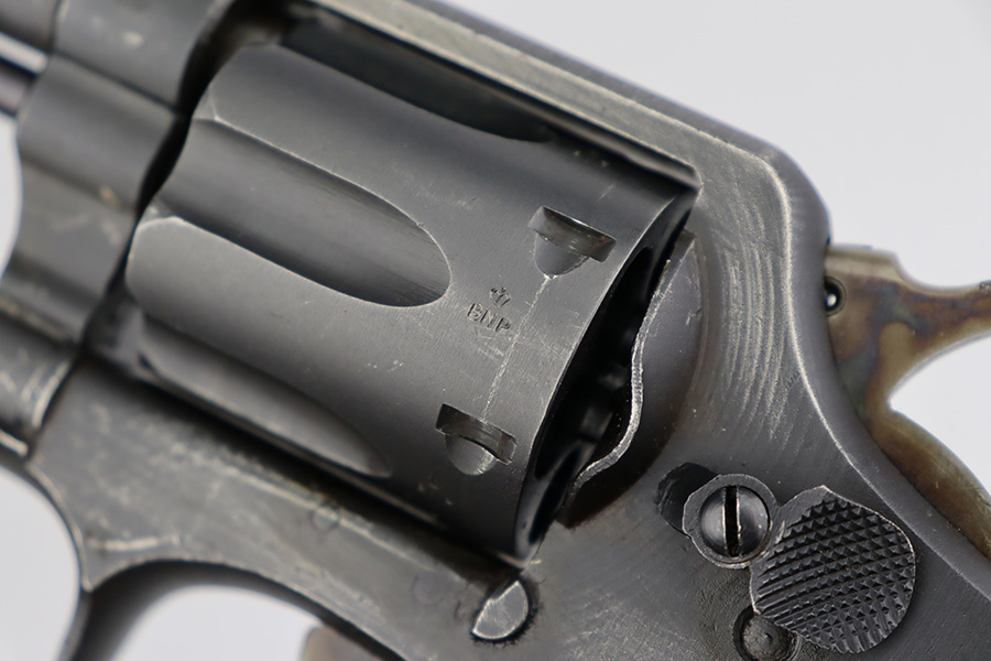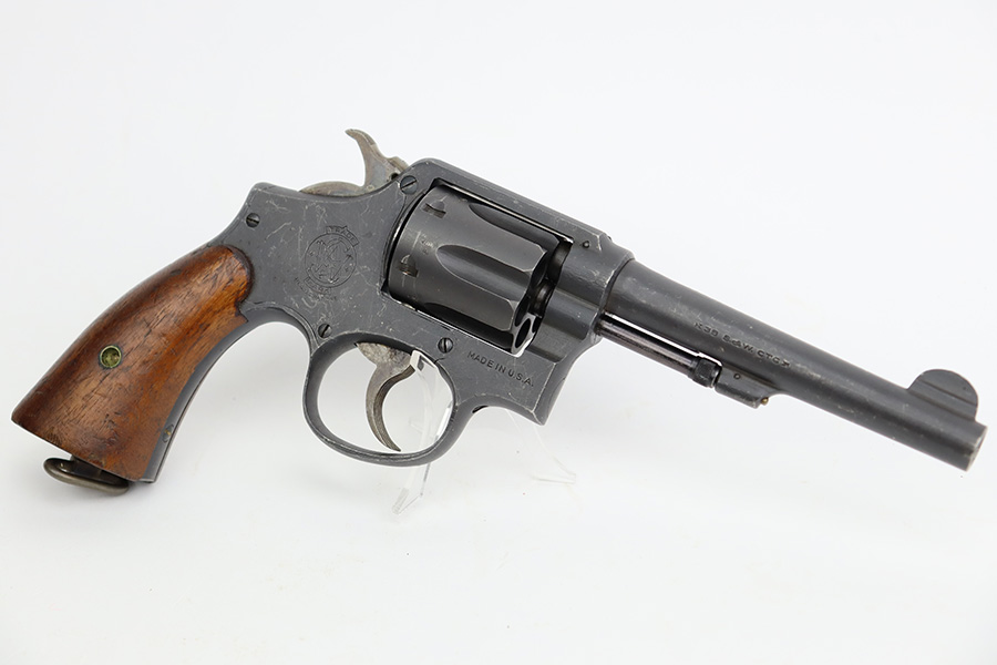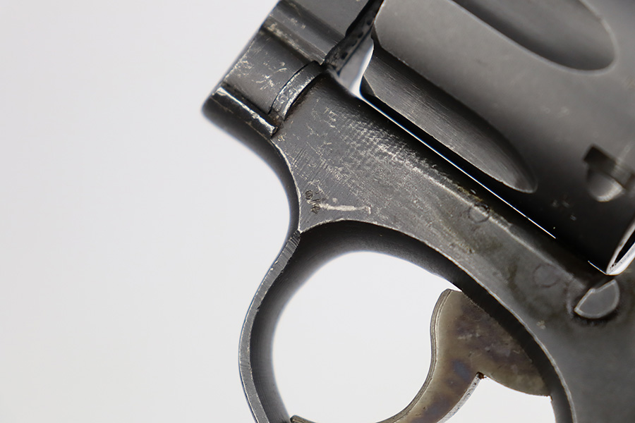 8/16/23 – This is an excellent example of a Smith & Wesson Victory revolver from WW2. It is matching and has British military proofs, indicating it was part of the Lend-Lease Program between the US and England. The top strap is “United States Property” marked, and the butt of the frame has a “GHD” military inspection stamp and a flaming bomb proof. It comes with an excellent modern leather holster. The gun itself has retained about 94-95% of its original parkerized finish. There is general minor high edge wear, some light surface scuffs here and there, and a few small spots of dark discoloration on the left side of the frame. Fitted with correct wood grips – the right panel is numbered and matching. Bruising on both sides. Mint bore.