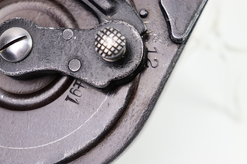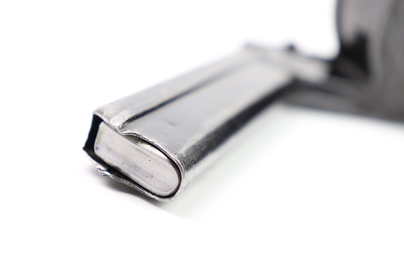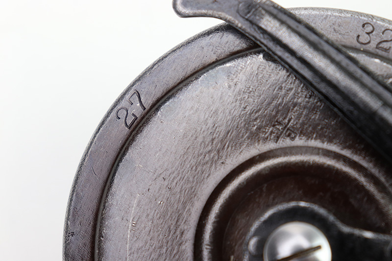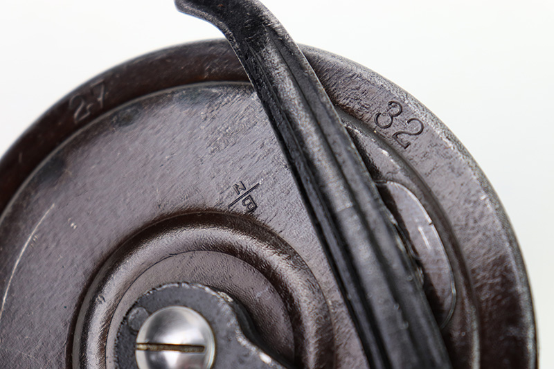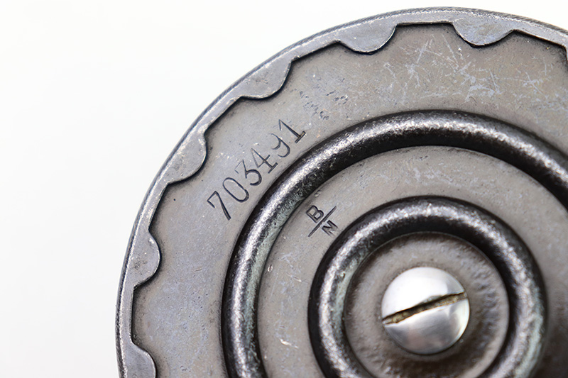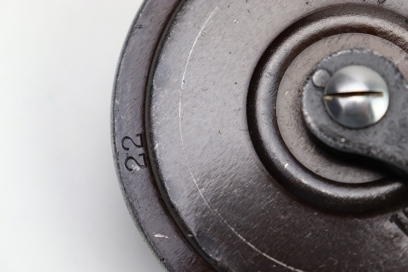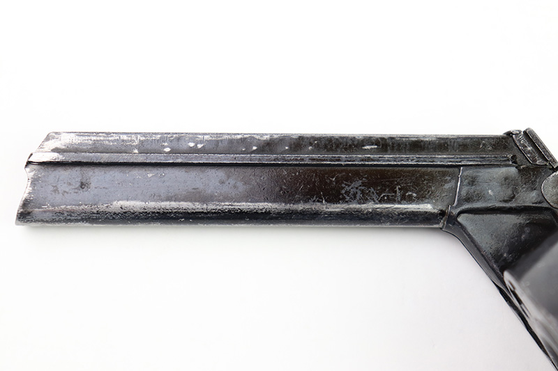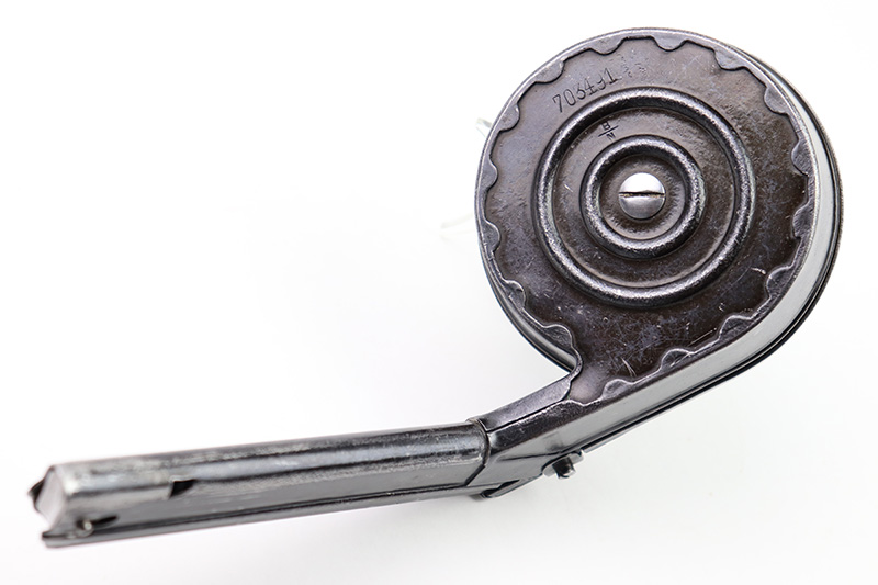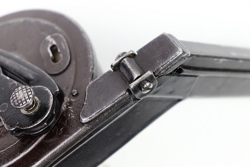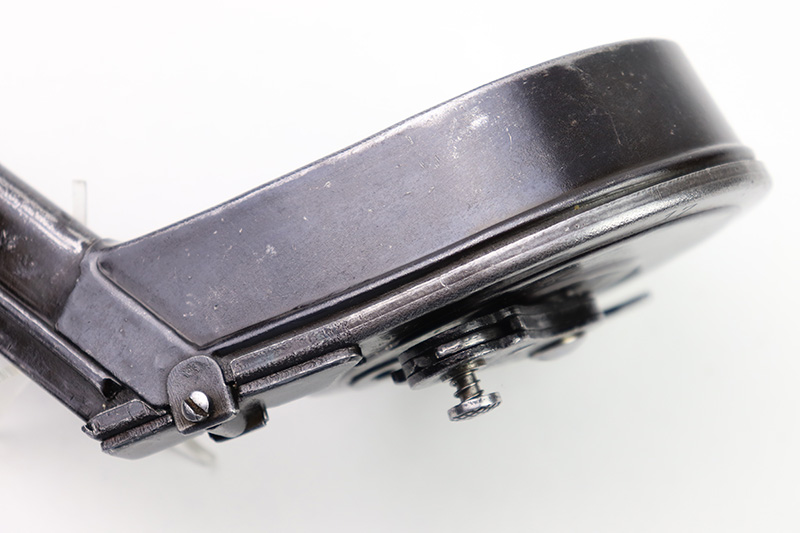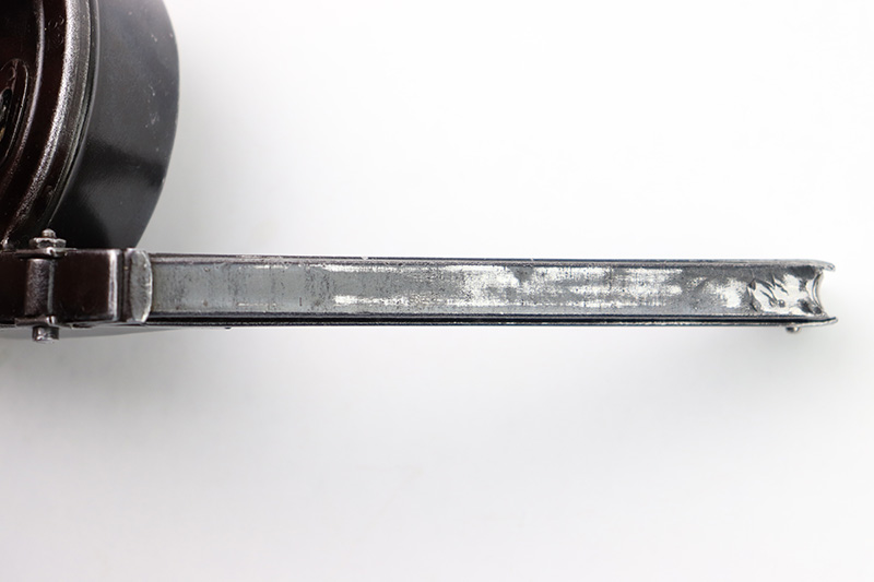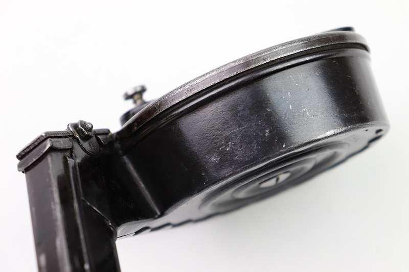 8/24/22 – This is an original WW1 production Snail Drum Luger Magazine. The magazine is in great overall condition with most of the original finish still intact. There’s some finish loss on the tube of the magazine, as well as general edge wear and mild surface patina / dark browning mixed in with the blued finish. The top and base plates are matching numbered and maker stamped by Bing. The spring and winding arm are fully functional.