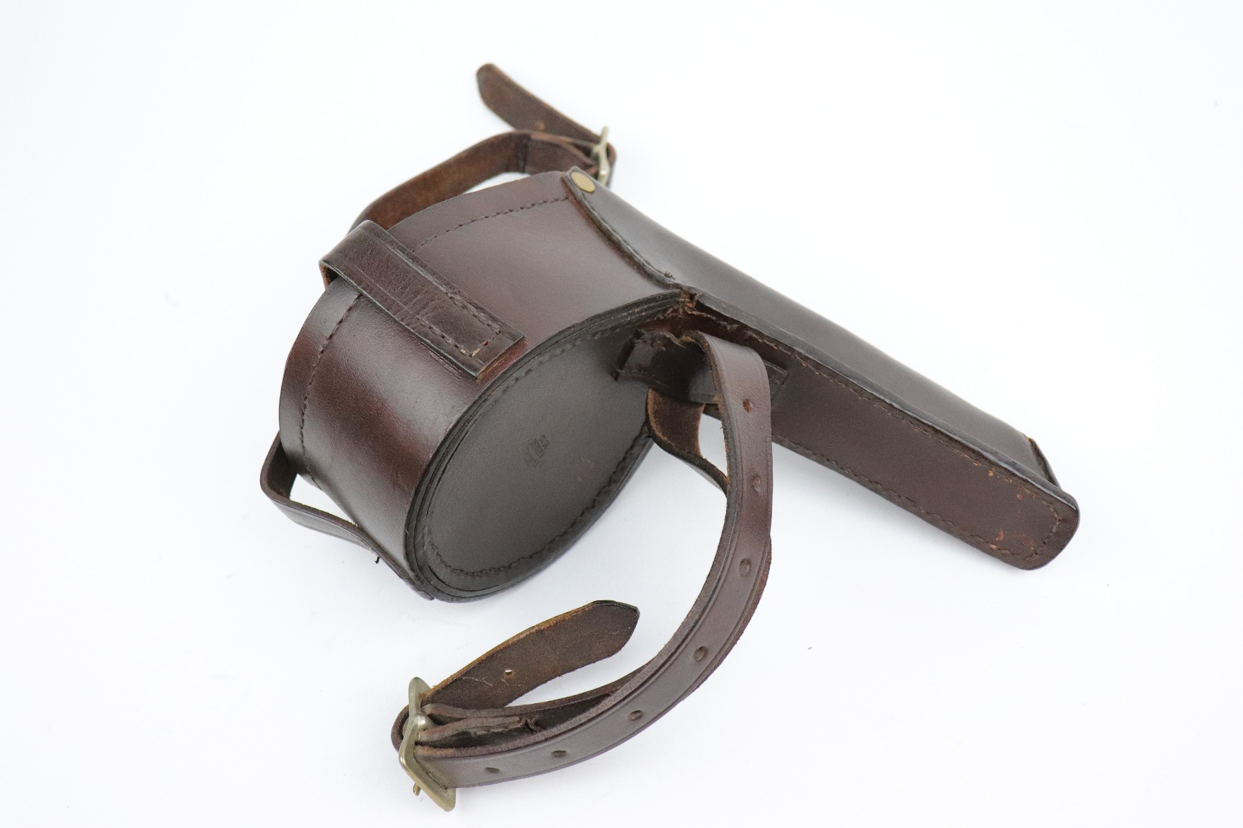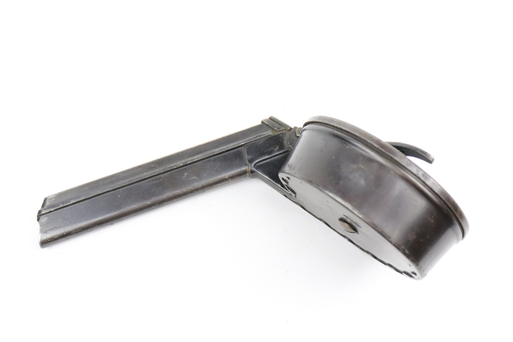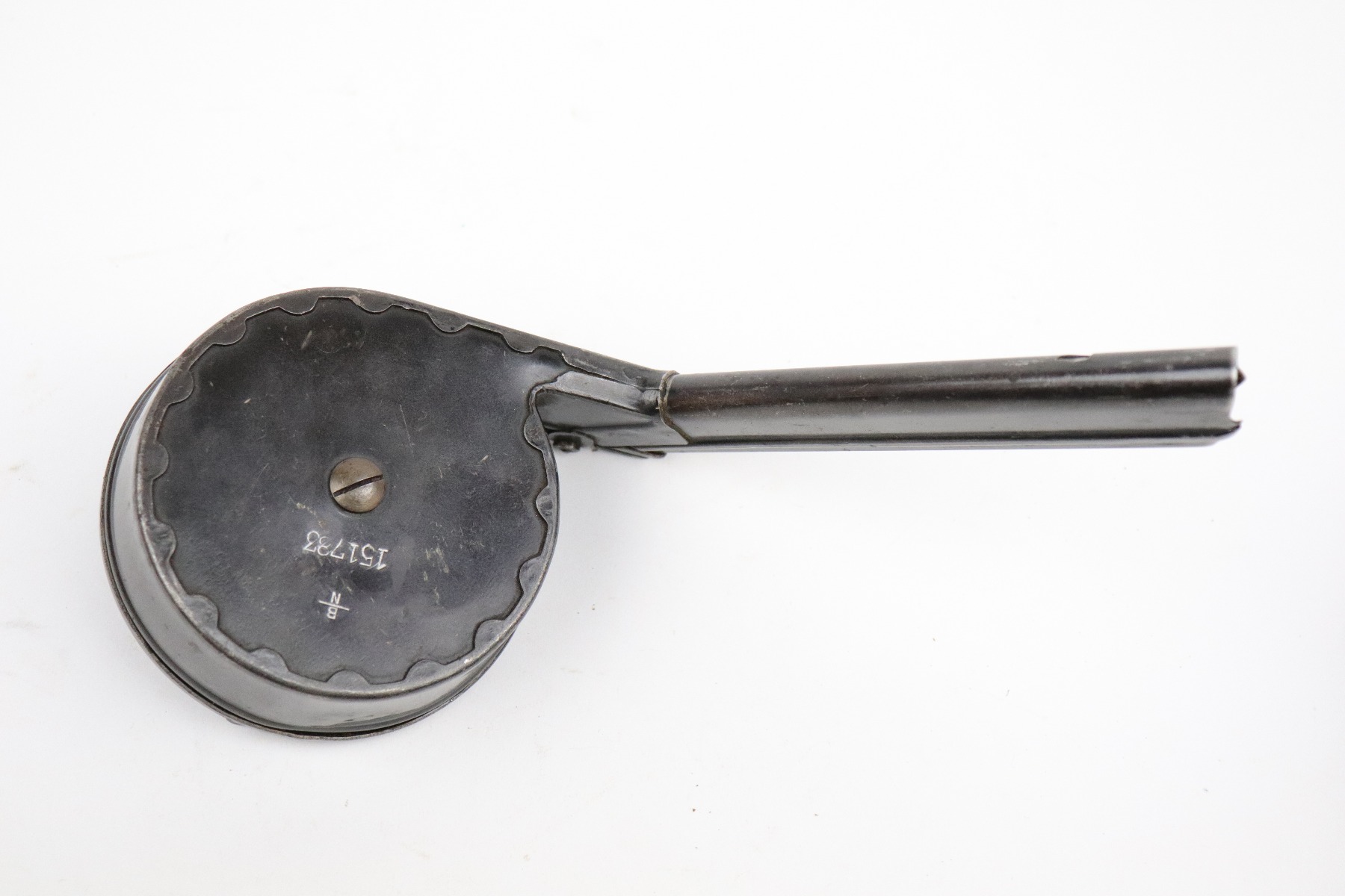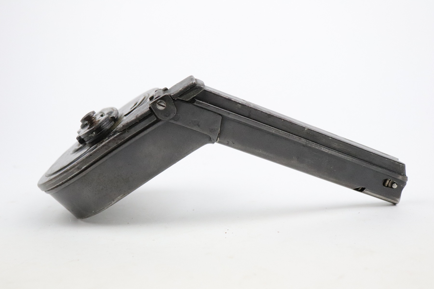 8/18/20 – This is a WW1-era Luger snail drum magazine that comes in a high-quality reproduction leather case. The leather case is dated 1915. The magazine is “B/N” (Bing) makers marked on both sides. There is also an “M” marking on the bottom. Most of the finish is in tact but there is very minor wear along some of the high edges and areas of minor freckling and oxidation here and there. The magazine is still fully functional.