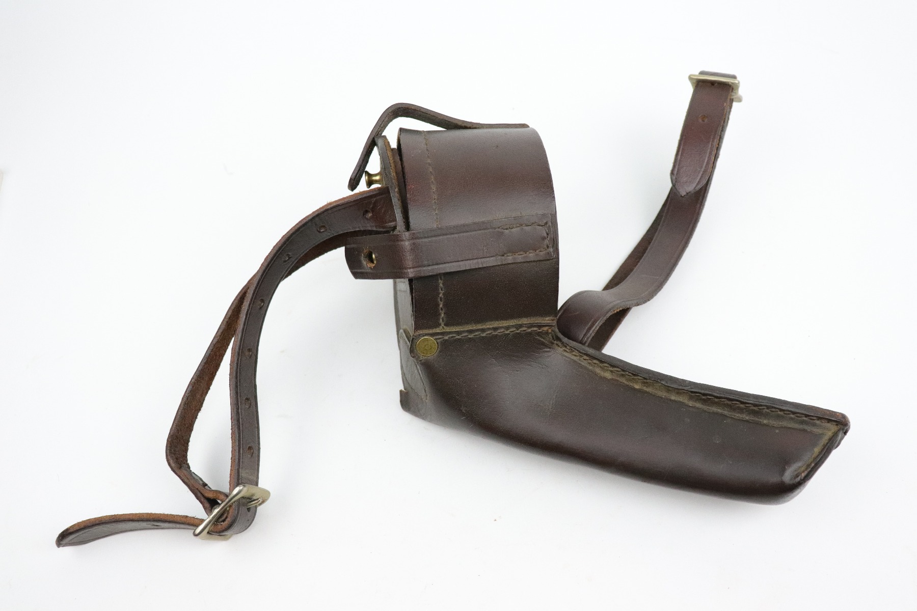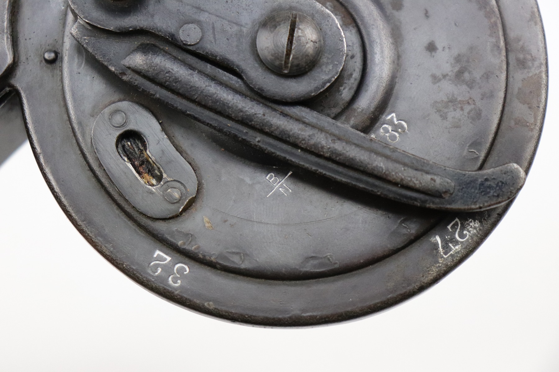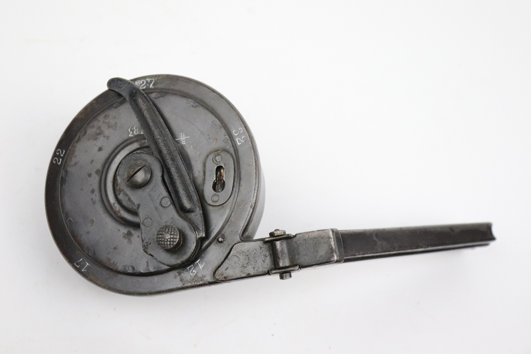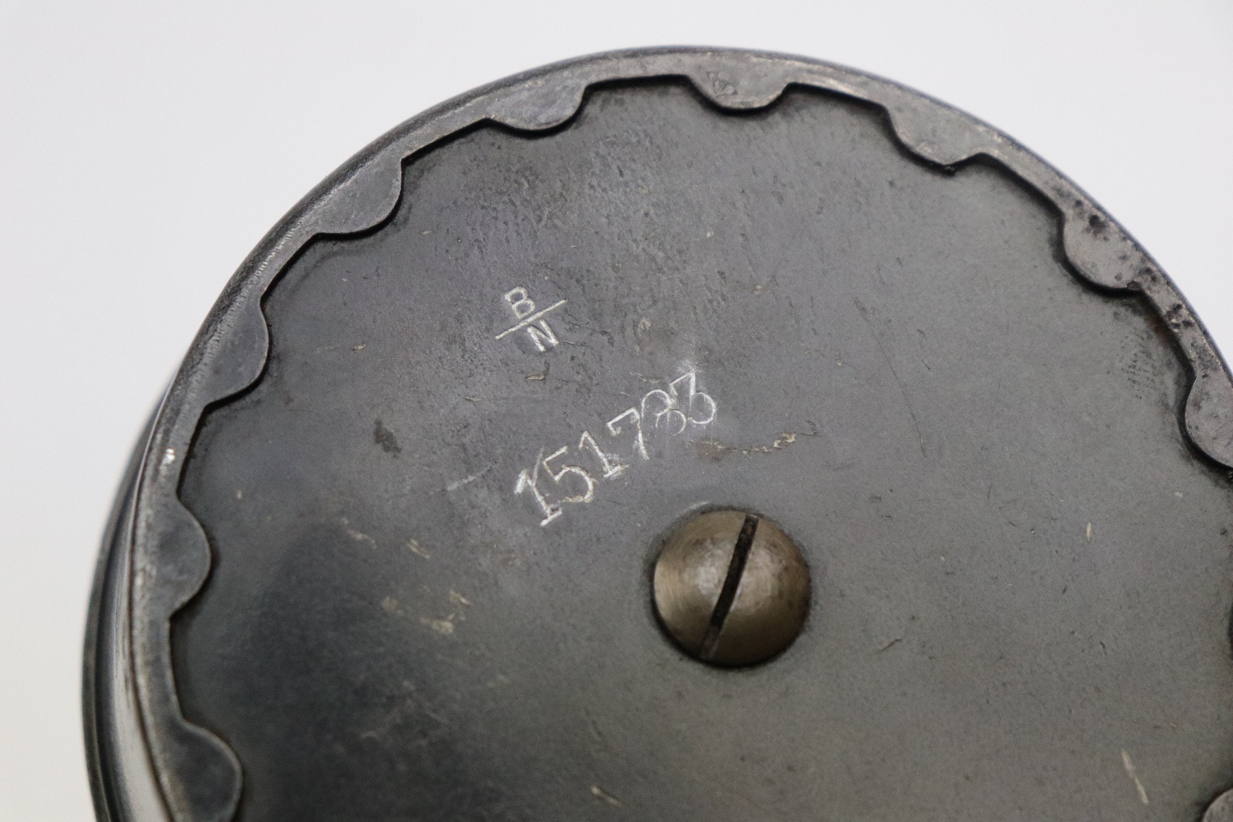 8/18/20 – This is a WW1-era Luger snail drum magazine that comes in a high-quality reproduction leather case. The leather case is dated 1915. The magazine is “B/N” (Bing) makers marked on both sides. There is also an “M” marking on the bottom. Most of the finish is in tact but there is very minor wear along some of the high edges and areas of minor freckling and oxidation here and there. The magazine is still fully functional.