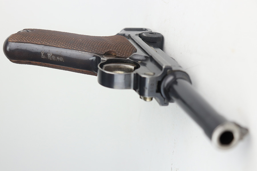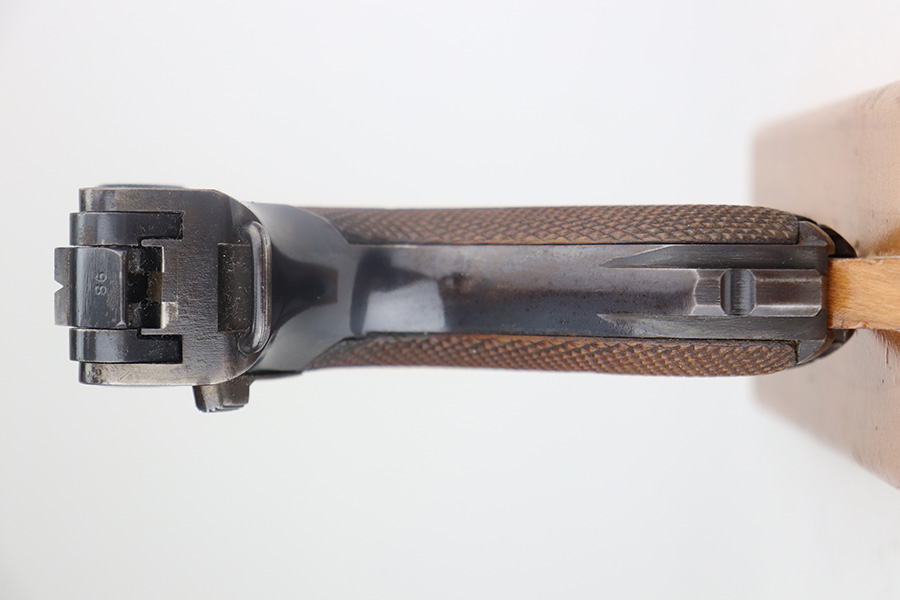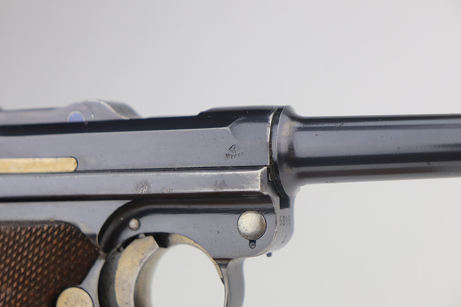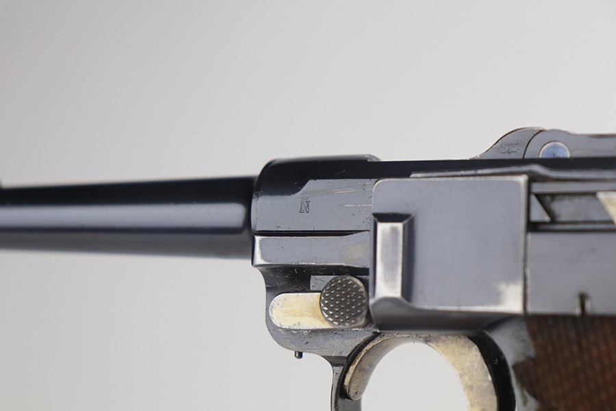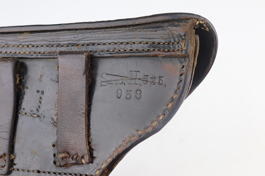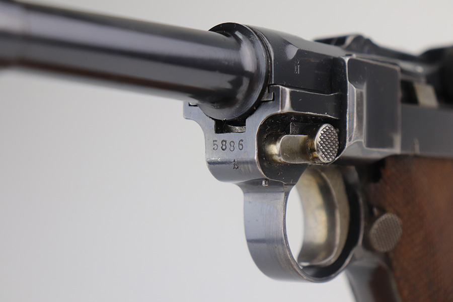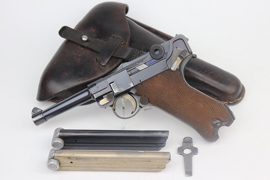 5/19/21 – This is an interesting example of a “between the wars” luger rig. It started out as a 1920’s era commercial gun- crown/N commercial proofs indicate that. Also, it would have been made by DWM, but later reworked during the Nazi era (See WaA66 proof on right side). This rework was most likely done in the 1930’s when the Nazi’s were in power and trying to sneak guns into inventory which violated the Treaty of Versailles. They added the police sear safety, and the extra magazine safety. They also removed the DWM toggle for some reason, and added the police unit marking “L.Ka.78.” or “Rural Police of Kasel”. The gun comes with two mismatched magazines, a generic Luger tool, and a 1915-dated police-style holster. The gun has retained about 94% of its finish. There are small areas of discoloration and spotty oxidation on the straps. Minor wear on the side plate, side rails, and around the muzzle. One very small area of minor pitting on the right side rail. Excellent un-numbered grips. The bore is excellent – shiny with strong rifling.