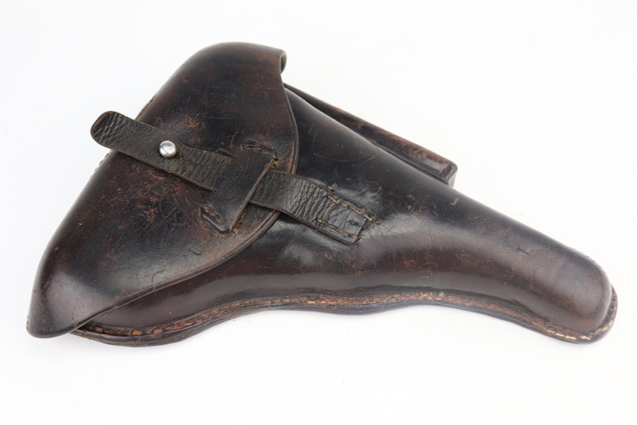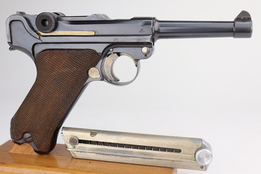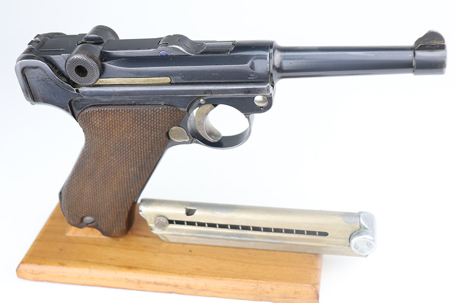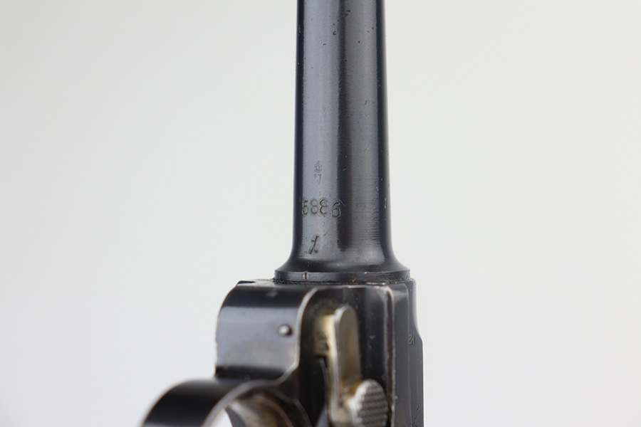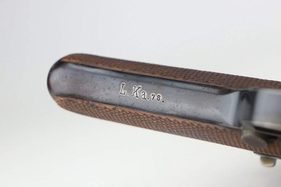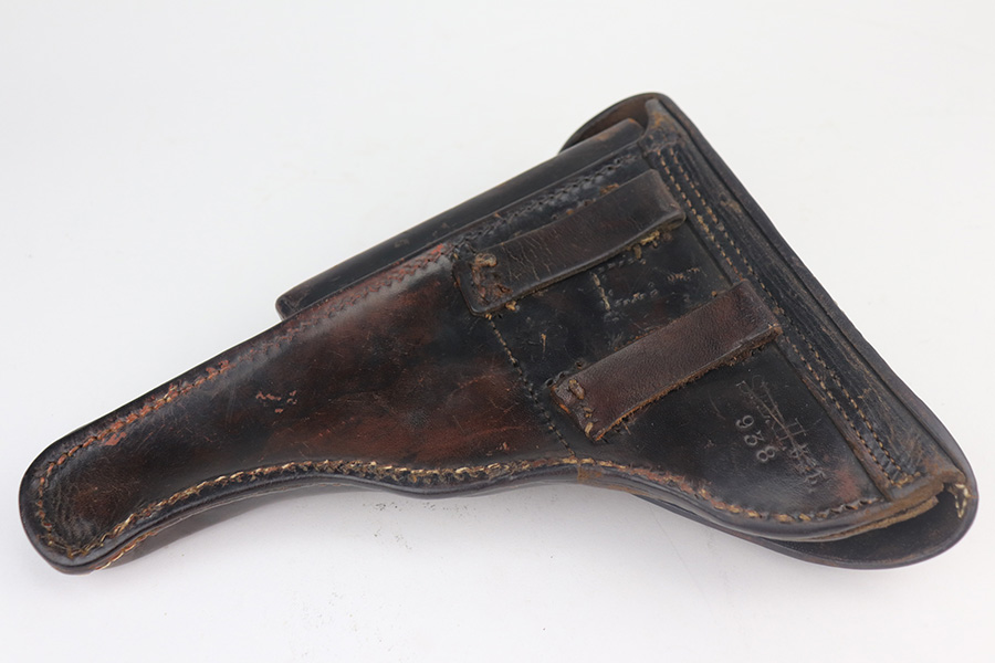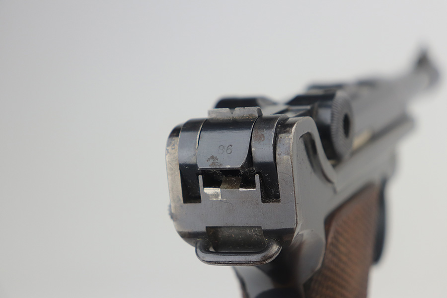 5/19/21 – This is an interesting example of a “between the wars” luger rig. It started out as a 1920’s era commercial gun- crown/N commercial proofs indicate that. Also, it would have been made by DWM, but later reworked during the Nazi era (See WaA66 proof on right side). This rework was most likely done in the 1930’s when the Nazi’s were in power and trying to sneak guns into inventory which violated the Treaty of Versailles. They added the police sear safety, and the extra magazine safety. They also removed the DWM toggle for some reason, and added the police unit marking “L.Ka.78.” or “Rural Police of Kasel”. The gun comes with two mismatched magazines, a generic Luger tool, and a 1915-dated police-style holster. The gun has retained about 94% of its finish. There are small areas of discoloration and spotty oxidation on the straps. Minor wear on the side plate, side rails, and around the muzzle. One very small area of minor pitting on the right side rail. Excellent un-numbered grips. The bore is excellent – shiny with strong rifling.