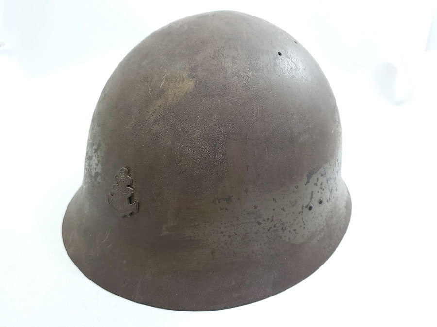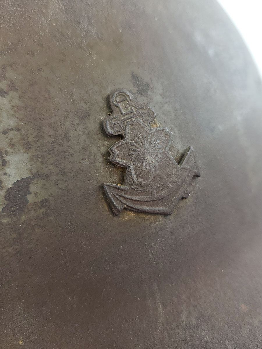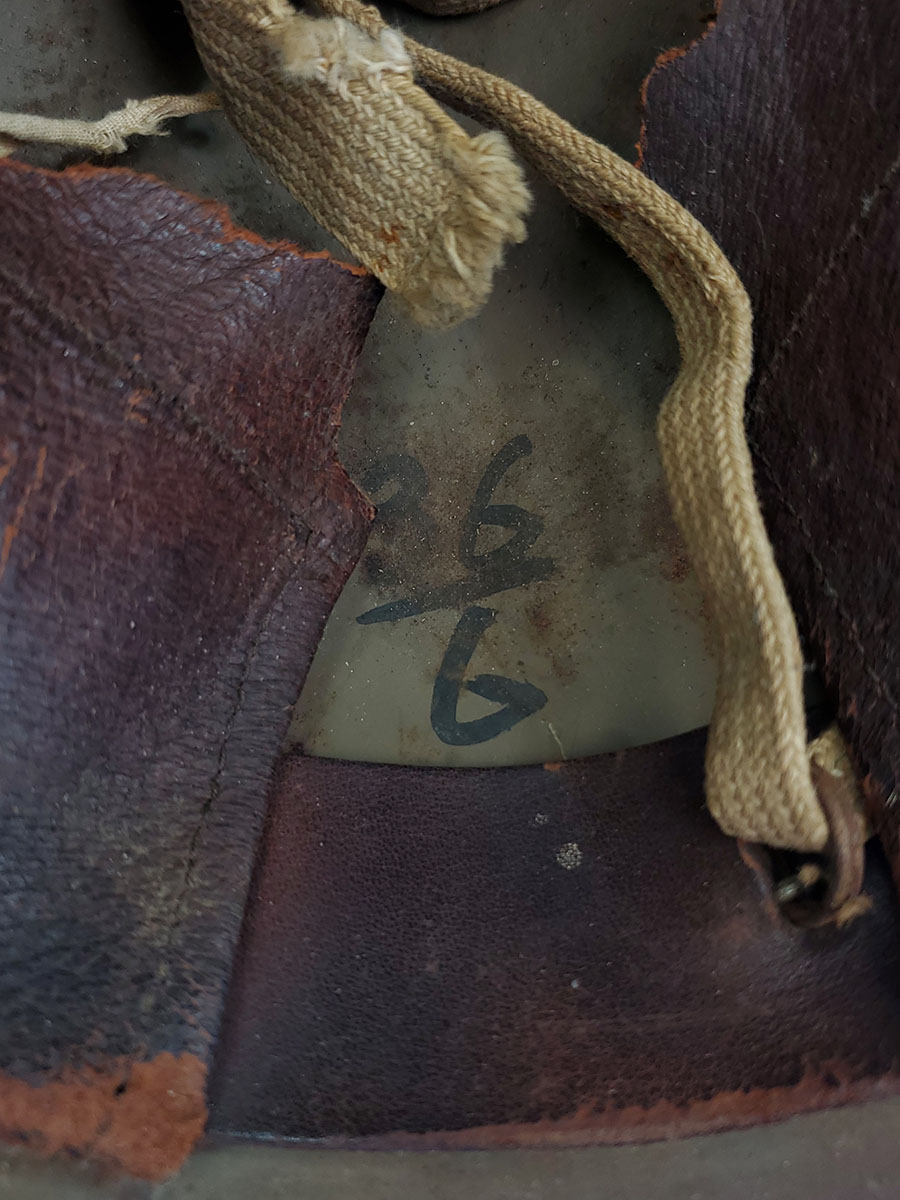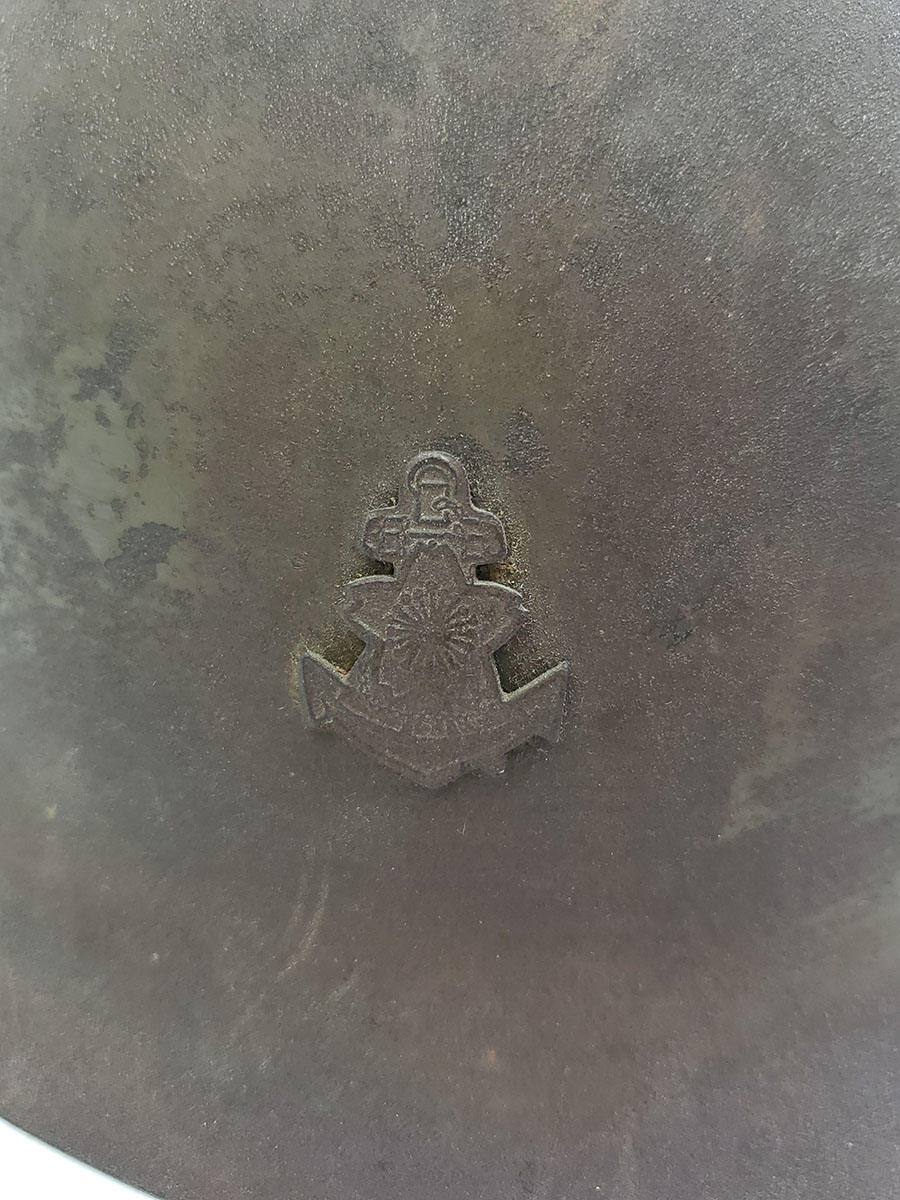 7/17/20 – This is an original WW2 Japanese Naval Landing Forces helmet. These are fairly rare and the equivalent of the USMC for the Japanese military. The helmet is in good overall condition with some typical exterior wear, but no dents or major issues. The interior has two fairly faint stamps into the shell, and has 36/6 in ink. The interior liner is fairly worn, as shown in photos.
