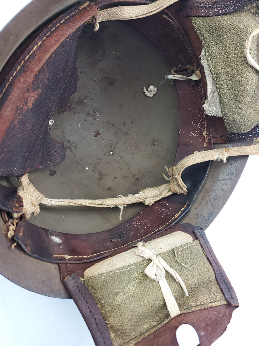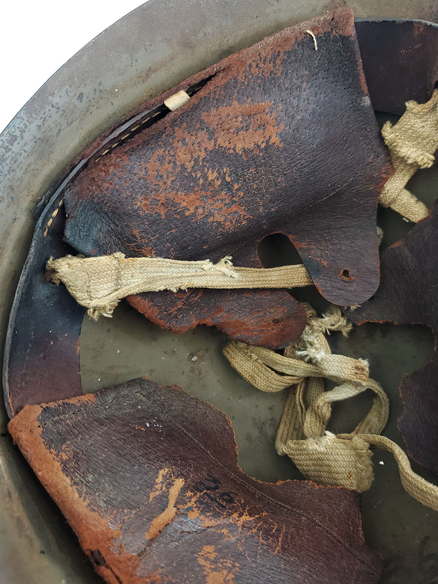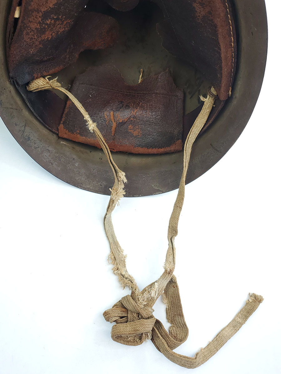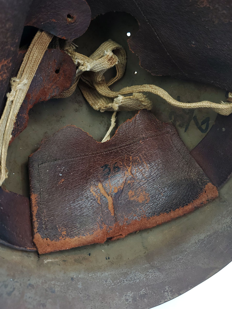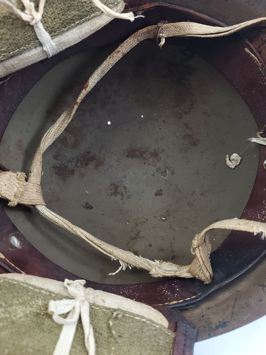 7/17/20 – This is an original WW2 Japanese Naval Landing Forces helmet. These are fairly rare and the equivalent of the USMC for the Japanese military. The helmet is in good overall condition with some typical exterior wear, but no dents or major issues. The interior has two fairly faint stamps into the shell, and has 36/6 in ink. The interior liner is fairly worn, as shown in photos.