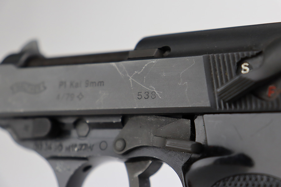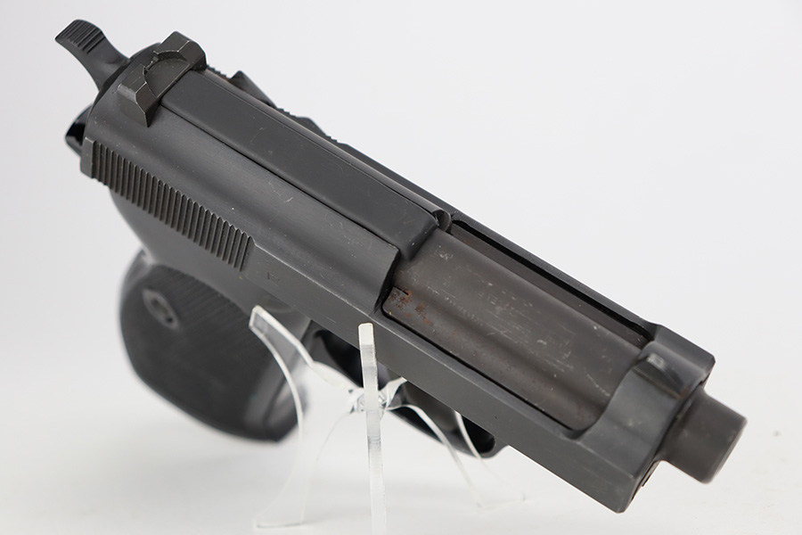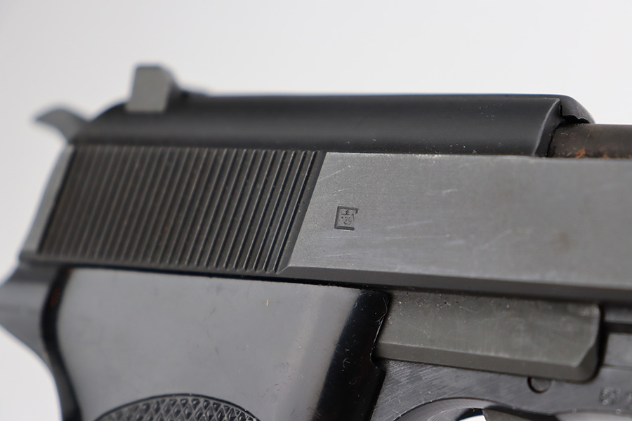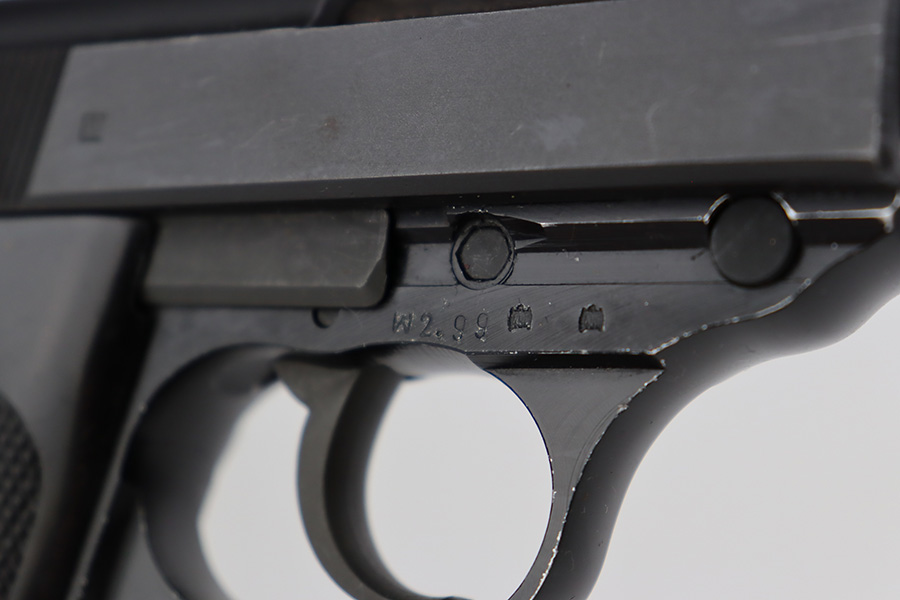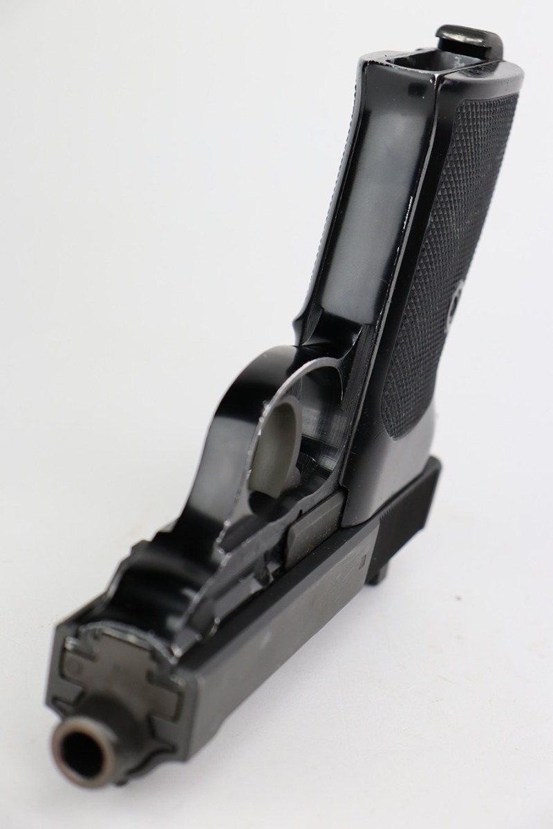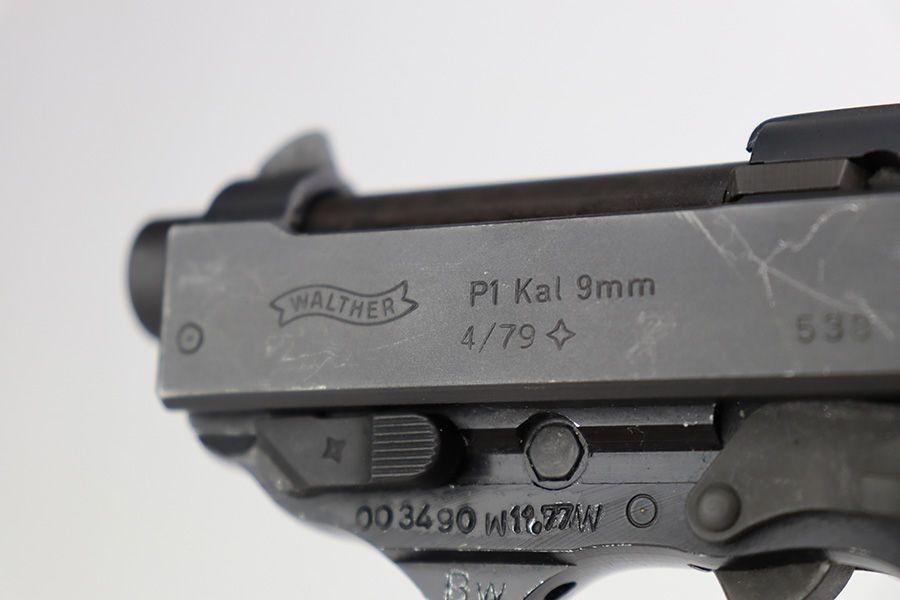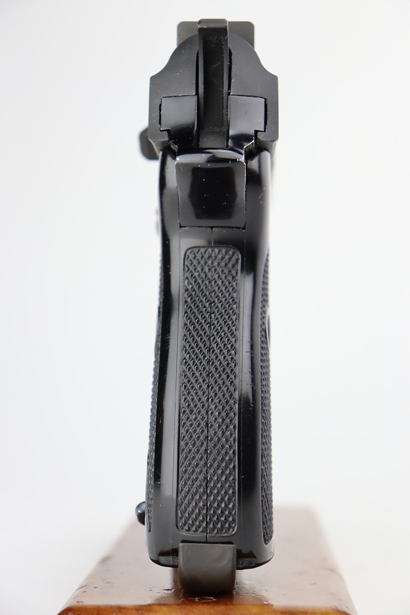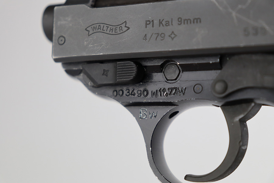 8/7/23 – This is an excellent example of a Walther P1 manufactured in April of 1979. It is all matching and has the proper West German proofs throughout. There is also a “BW” marking on the left side of the trigger guard, indicating this was issued to the Bundeswehr or West German military. This one is particularly interesting, because the barrel has been cut down, giving the gun a “sub-nose” configuration. This work was done professionally. The gun has retained nearly all of its finish with just a few very light surface scuffs here and there and some tiny dots of surface rust on the barrel. Fitted with excellent black plastic grips and comes with a 1961-dated P.38 magazine. Mint bore. De-cocker is functional.