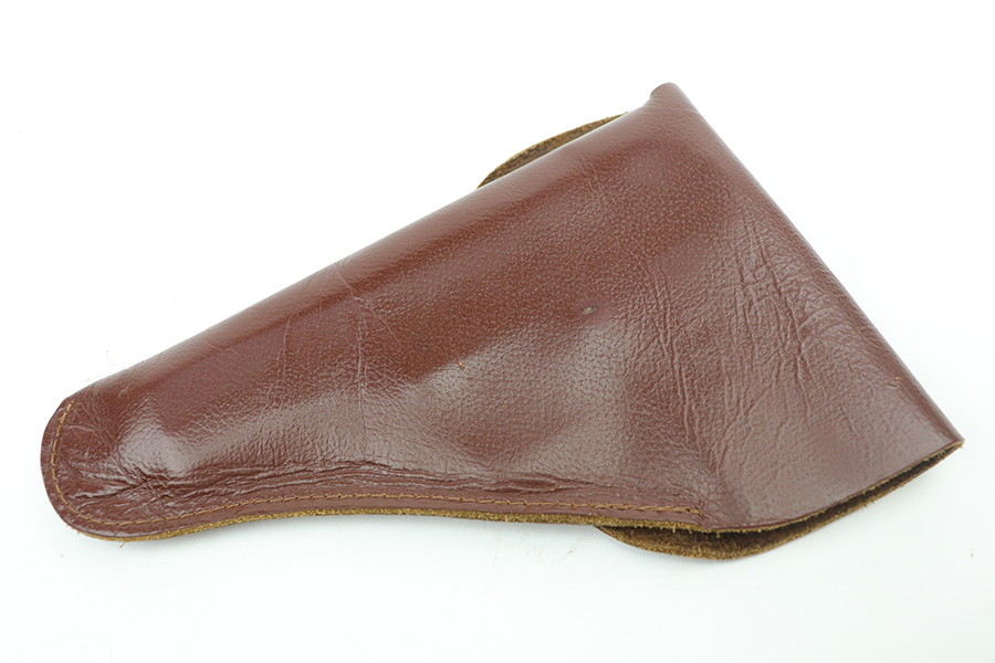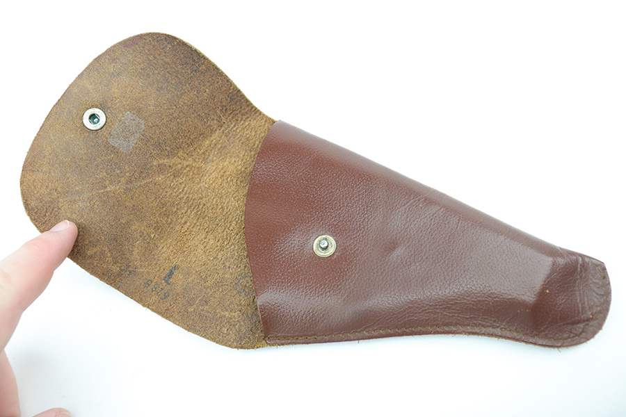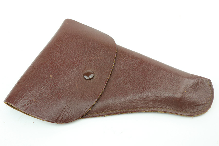 8/30/21 – This soft brown leather holster features a snap closure and fits a Walther PP or PPK. No belt loop indicates that this is meant for storage of a firearm as opposed to carrying.
