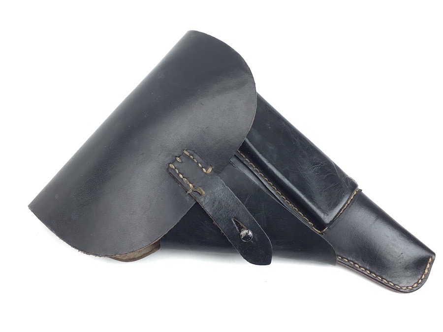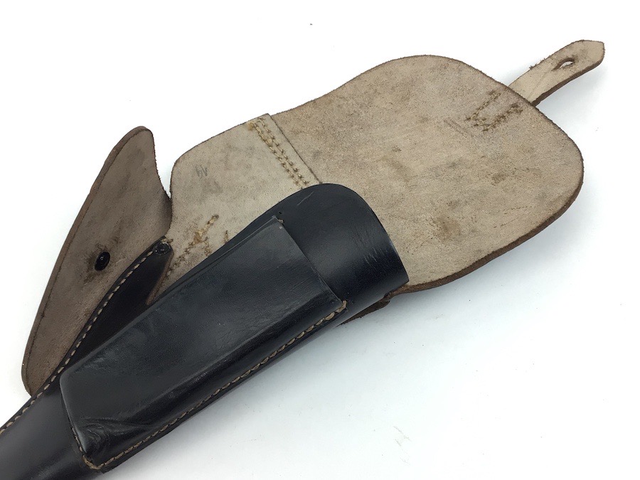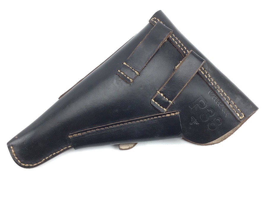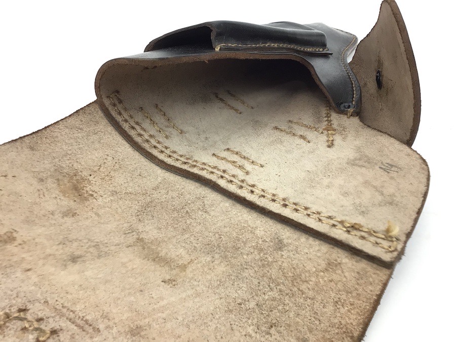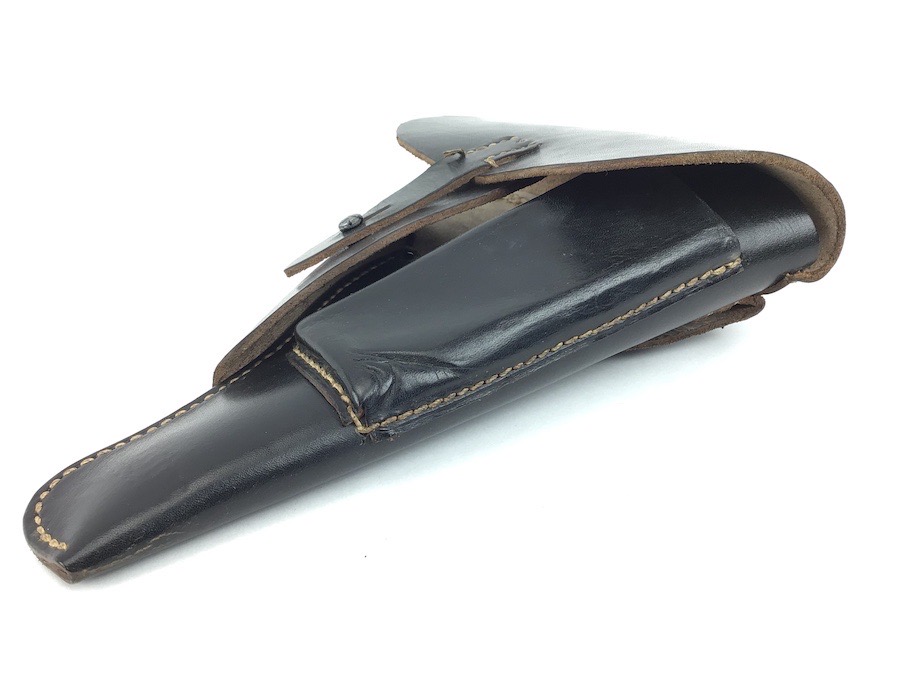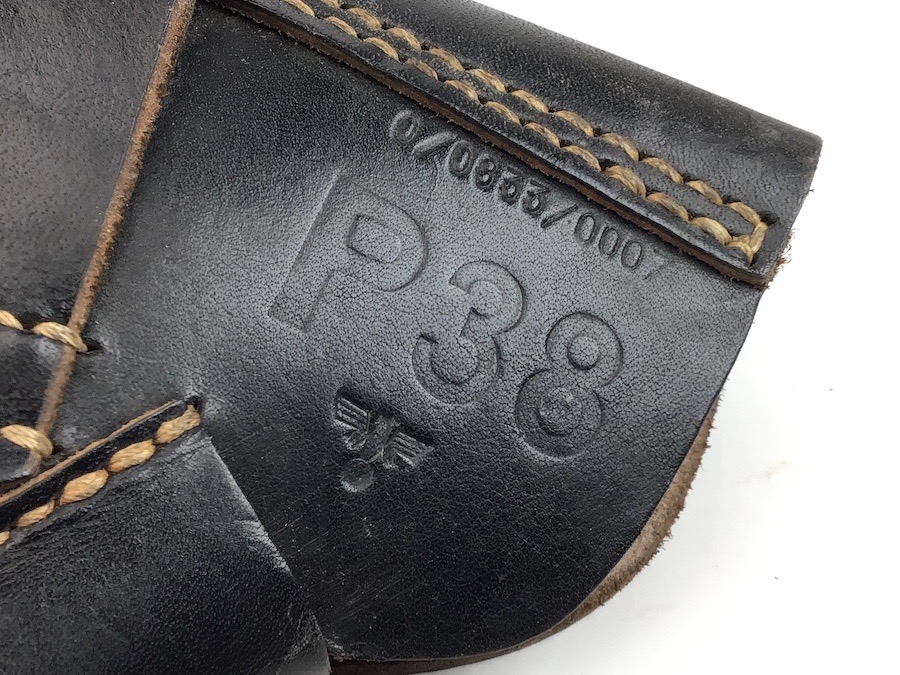 11/30/22 – This is an excellent, near mint condition Police issued P.38 holster. The holster is soft-shell style with a series of numbers stamped above a P.38 stamp and Police eagle proof stamp. The series of numbers stamp is a depot / distribution number which was used by the Germans during 1943 and 1944. The holster leather is clean and crisp throughout. The stitching is all original and excellent.