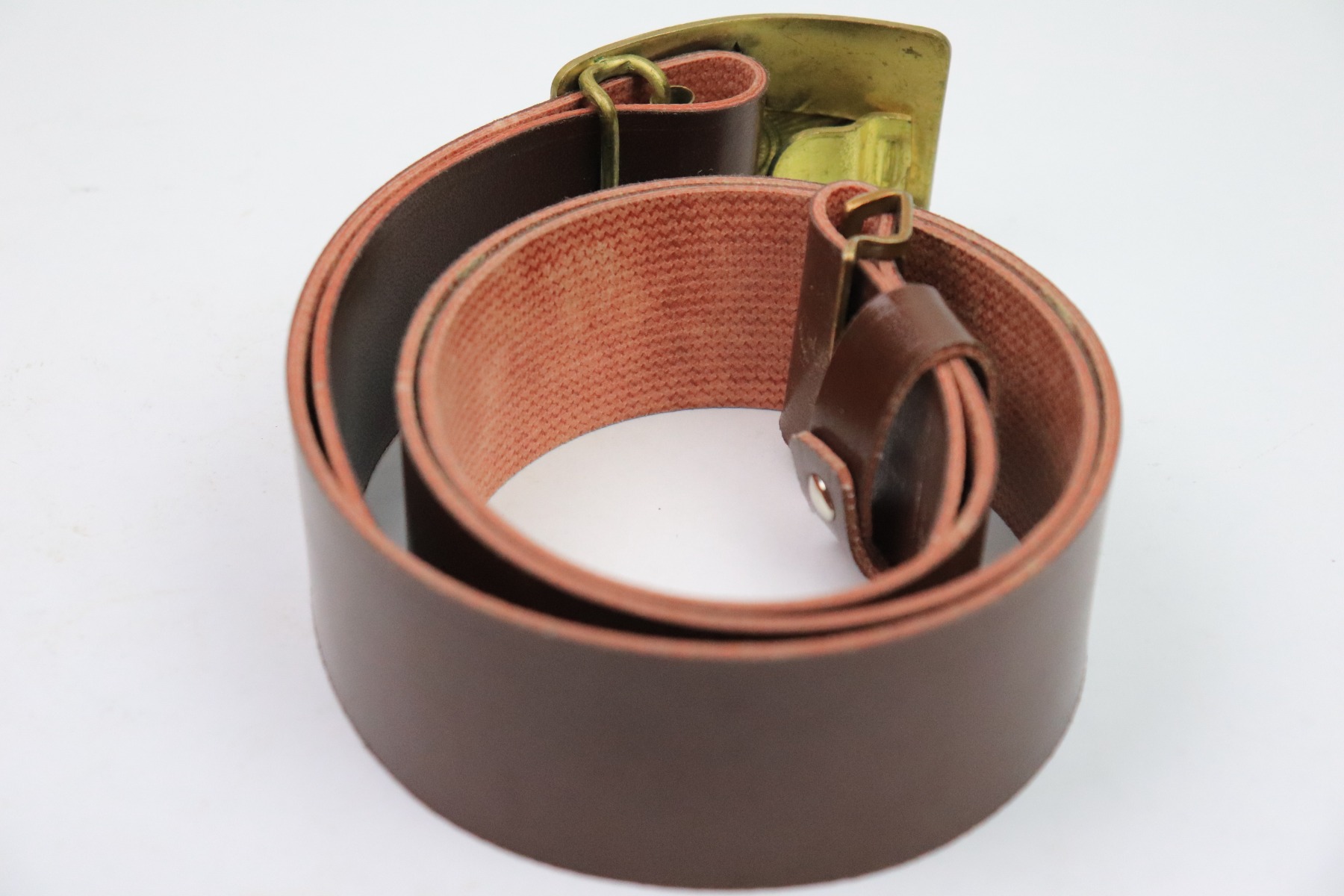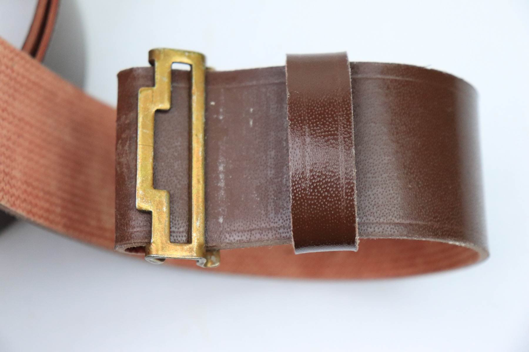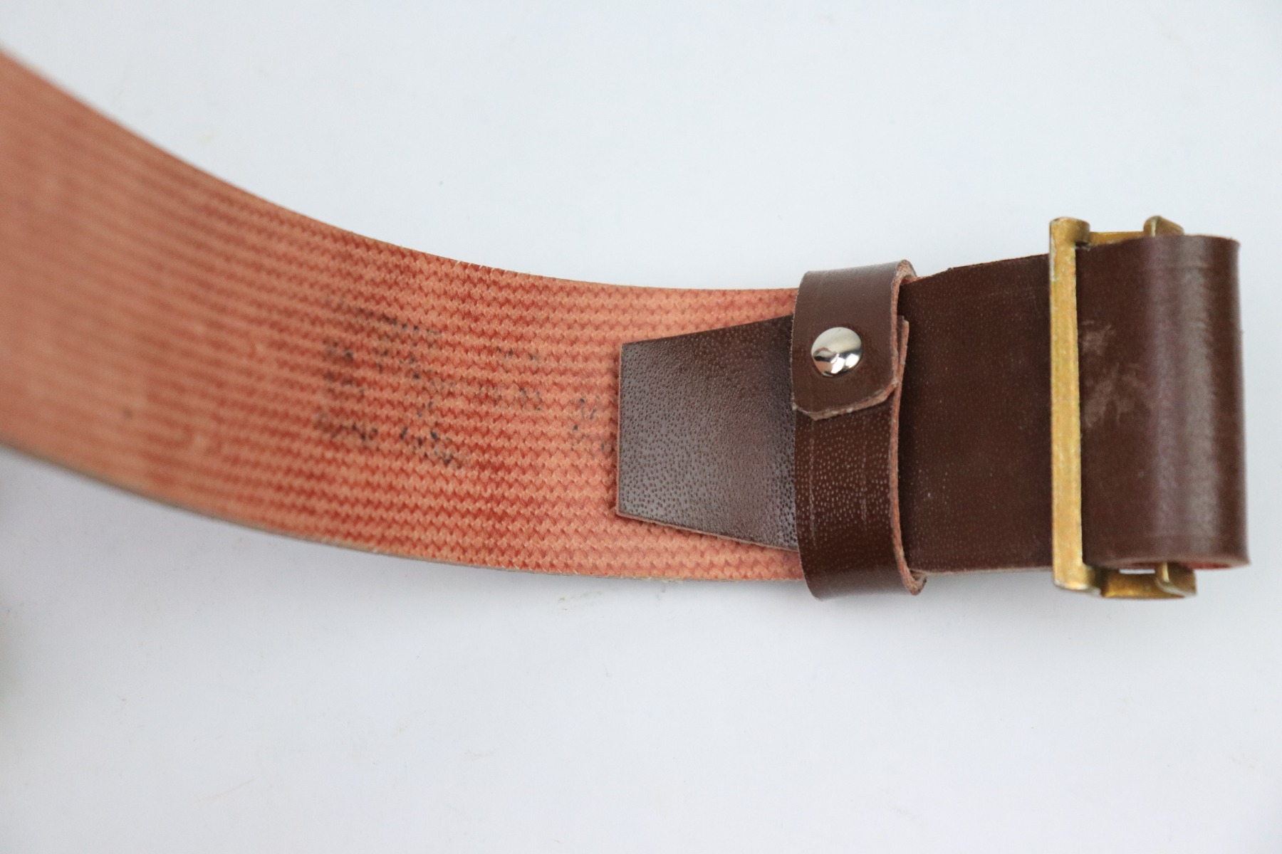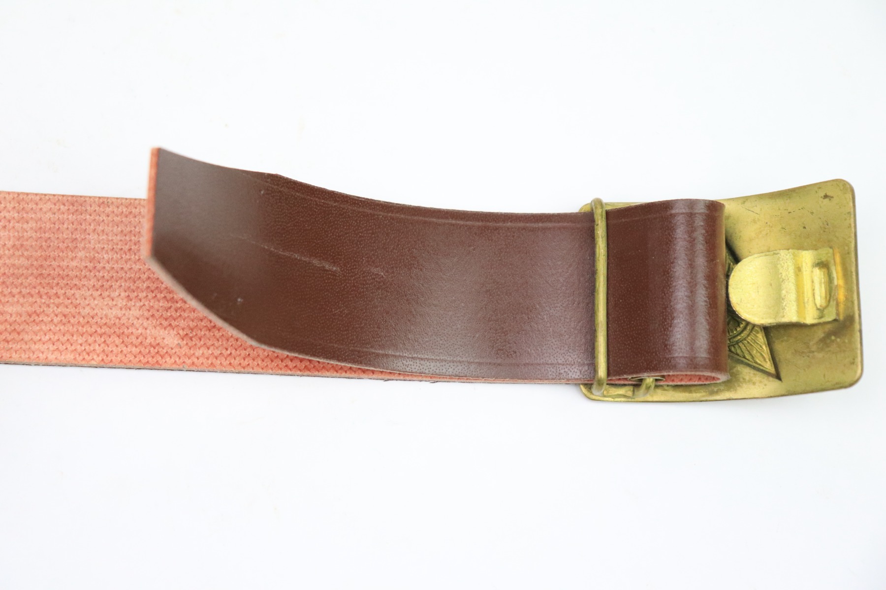 12/1/22 – This is a Soviet Union belt and buckle. The buckle isn’t dated, but is similar to other WW2 production examples we’ve found. The belt is in excellent, unissued condition with an interior ink stamp that’s no longer legible. The belt is made from a soft canvas and plastic-like material. The buckle is non-magnetic brass.