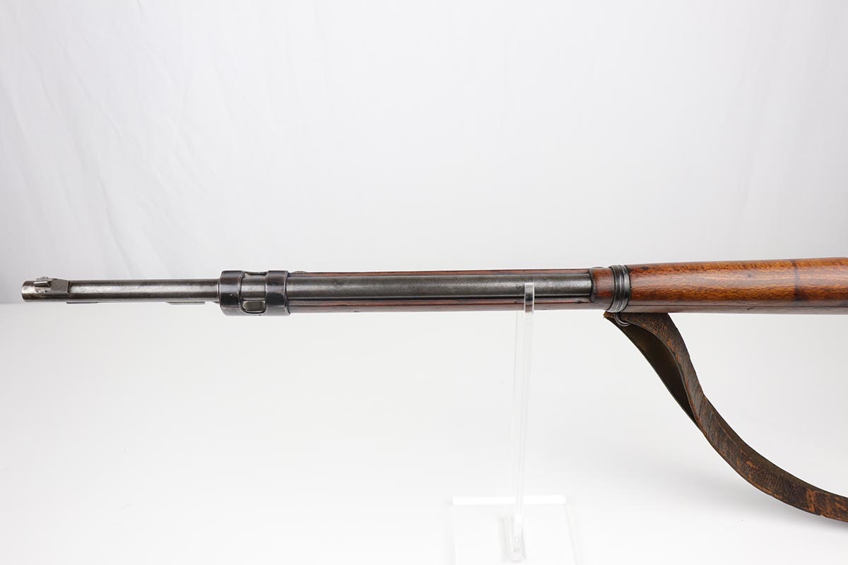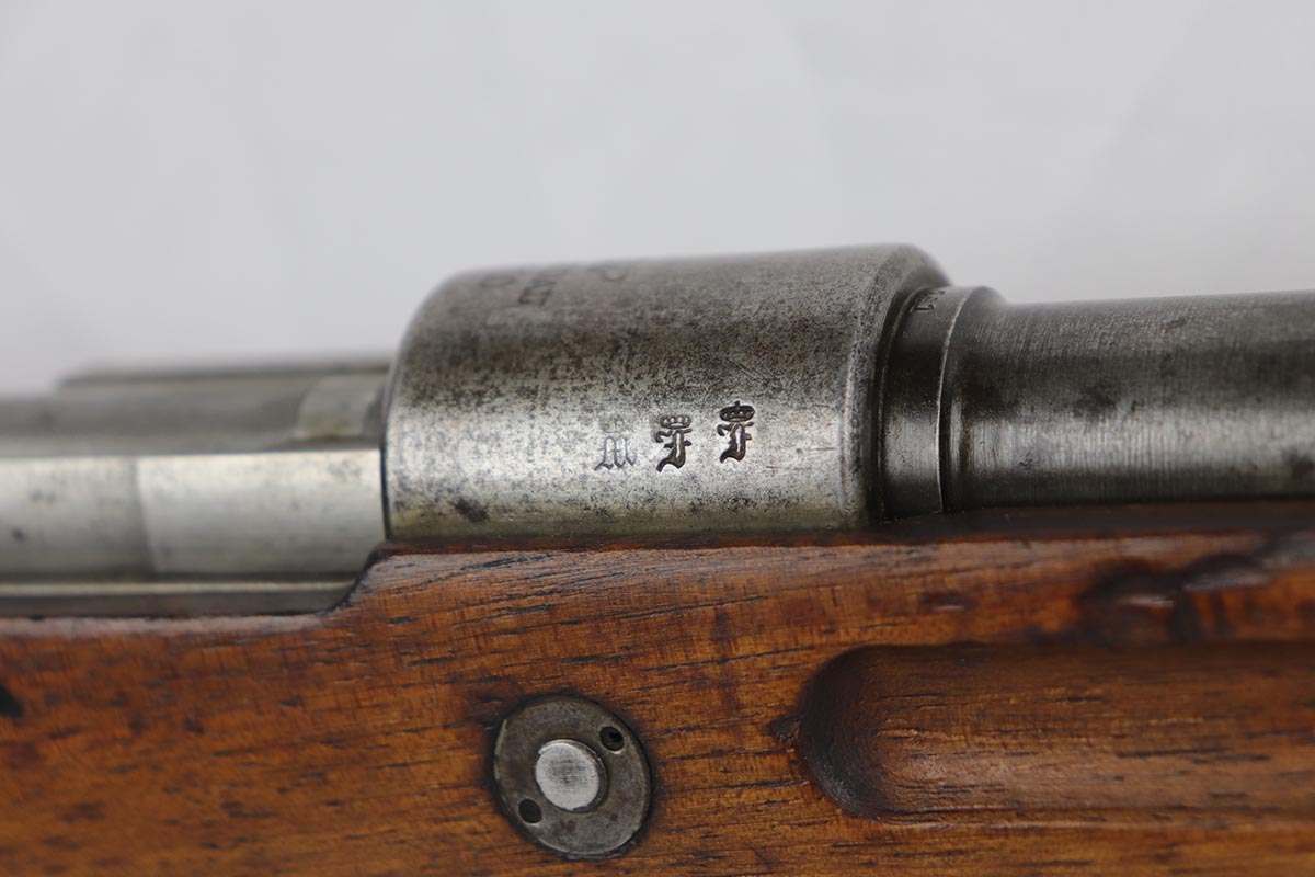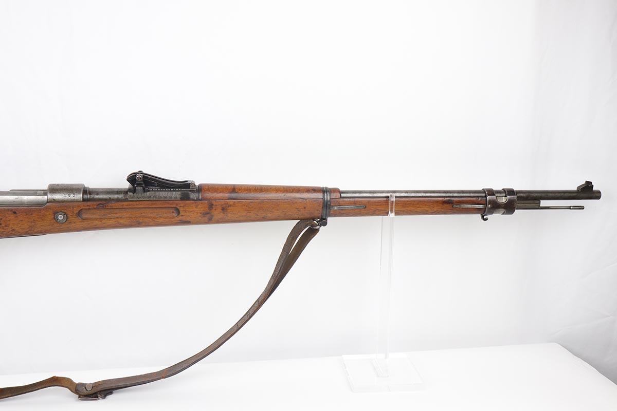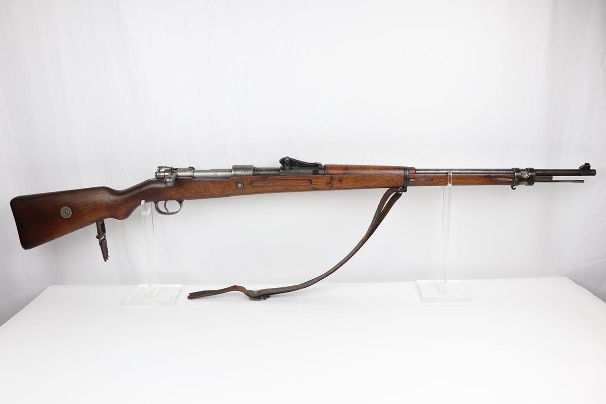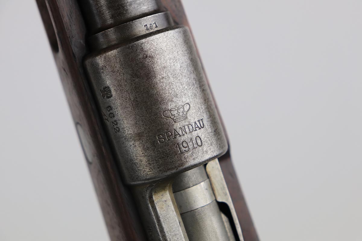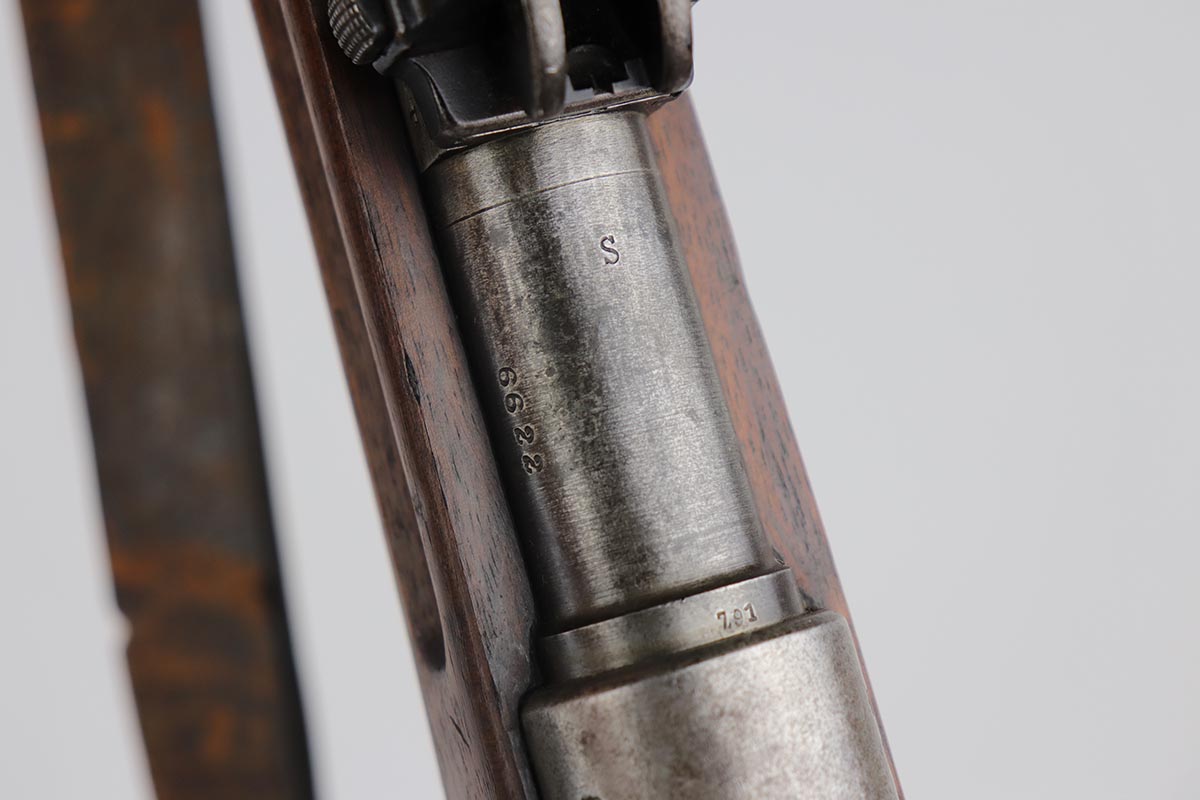 9/12/19 – This is an all matching and original Gewehr 98 that was produced in 1910 at Spandau, the Prussian State Arsenal. These rifles are very difficult to find in all matching and original configuration, and this is the first we’ve had in a a couple years. Matching parts include the stock, buttplate, bolt assembly, receiver, trigger assembly and front band. Only the cleaning rod is mismatched. The rifle even comes with an original sling, though it has obviously been torn. While the finish condition may initially seem poor, it’s worth noting that the receivers and bolts were never blued on this model. There are some areas of discoloration on the receiver and barrel but no corrosion or major defect. The stock is in fantastic shape with several military inspector markings. The bore is incredibly clean and about as nice as you’ll see on this model!