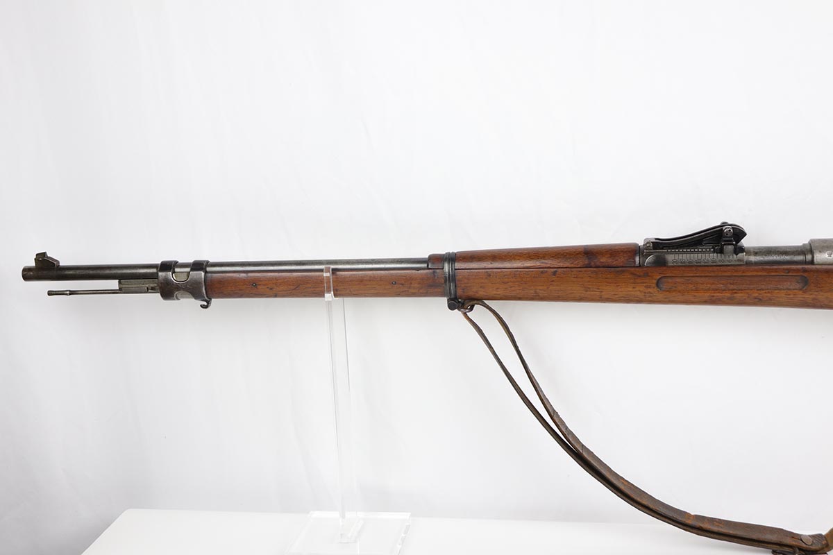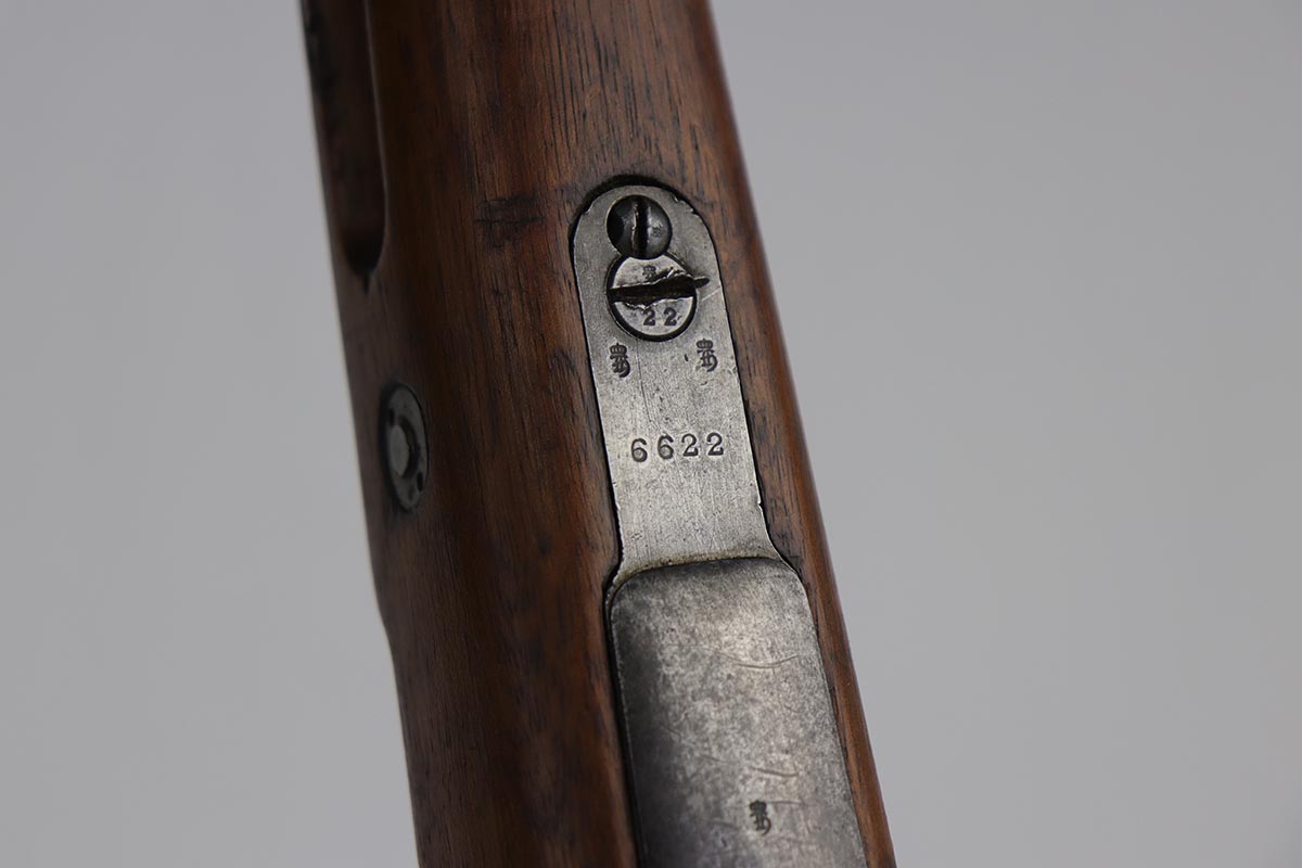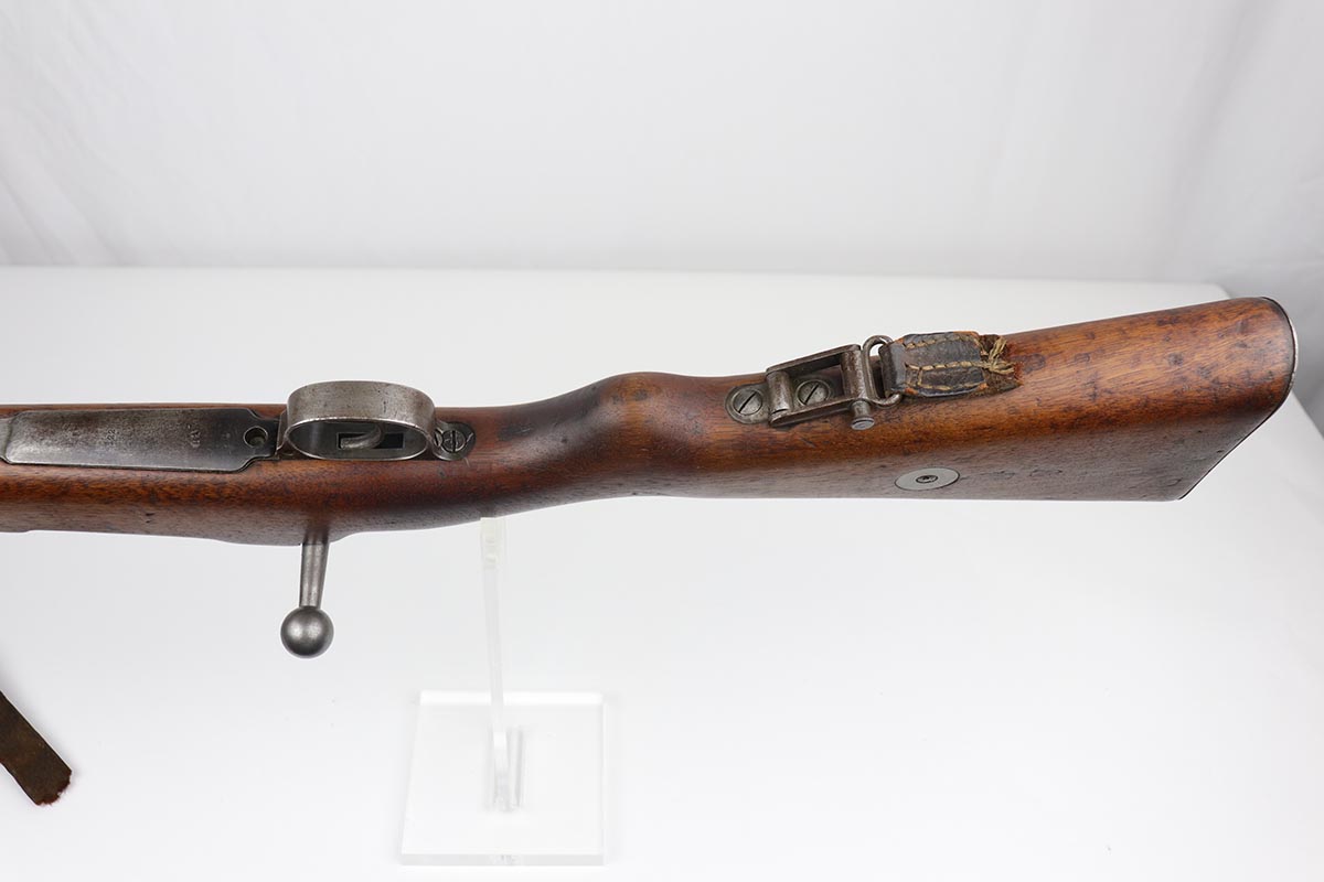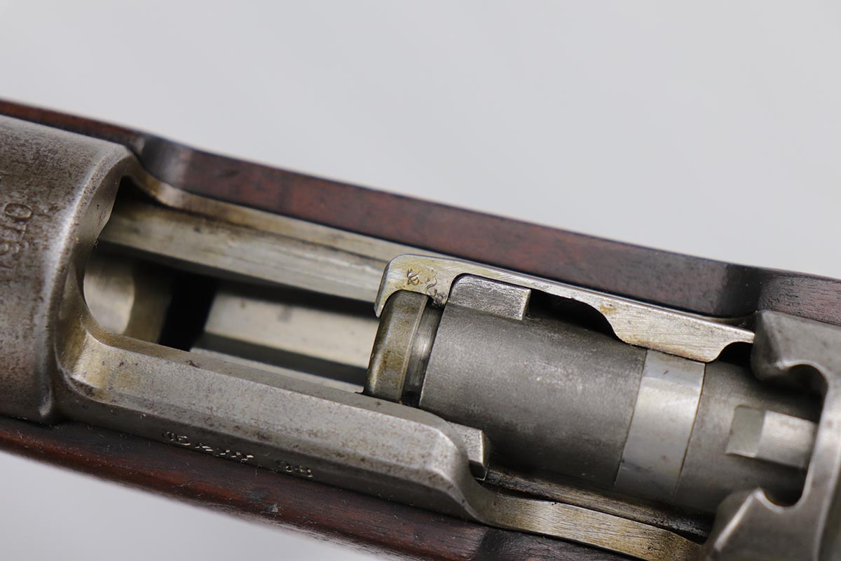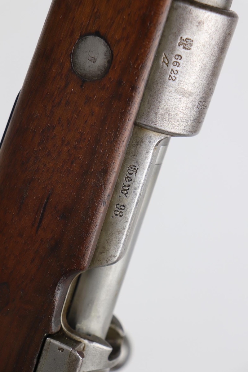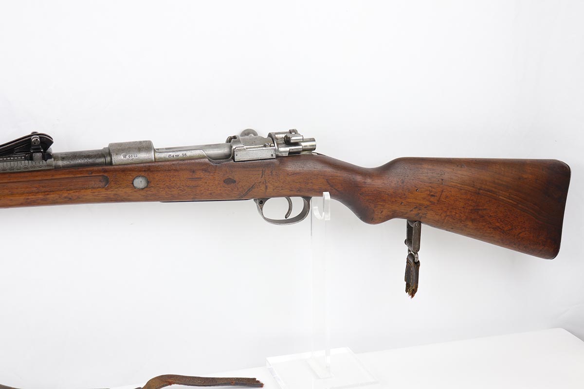 9/12/19 – This is an all matching and original Gewehr 98 that was produced in 1910 at Spandau, the Prussian State Arsenal. These rifles are very difficult to find in all matching and original configuration, and this is the first we’ve had in a a couple years. Matching parts include the stock, buttplate, bolt assembly, receiver, trigger assembly and front band. Only the cleaning rod is mismatched. The rifle even comes with an original sling, though it has obviously been torn. While the finish condition may initially seem poor, it’s worth noting that the receivers and bolts were never blued on this model. There are some areas of discoloration on the receiver and barrel but no corrosion or major defect. The stock is in fantastic shape with several military inspector markings. The bore is incredibly clean and about as nice as you’ll see on this model!