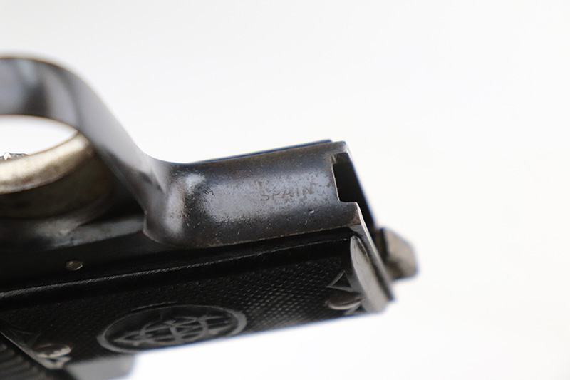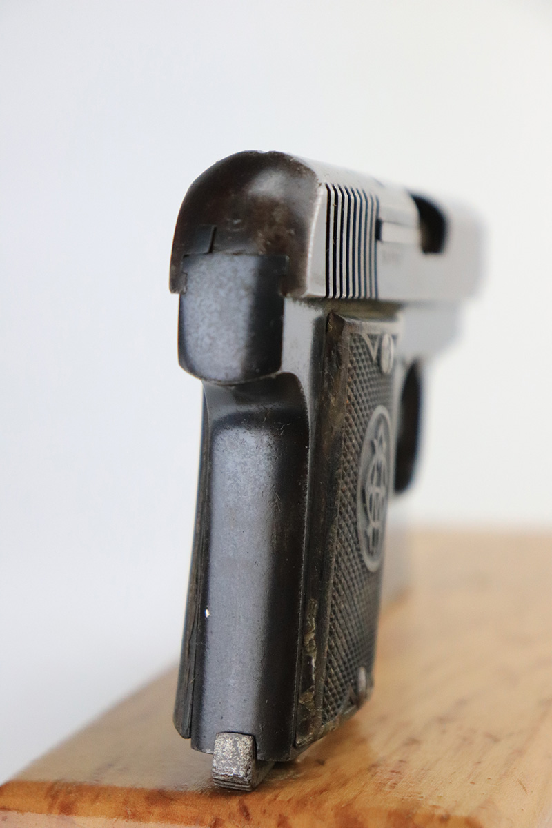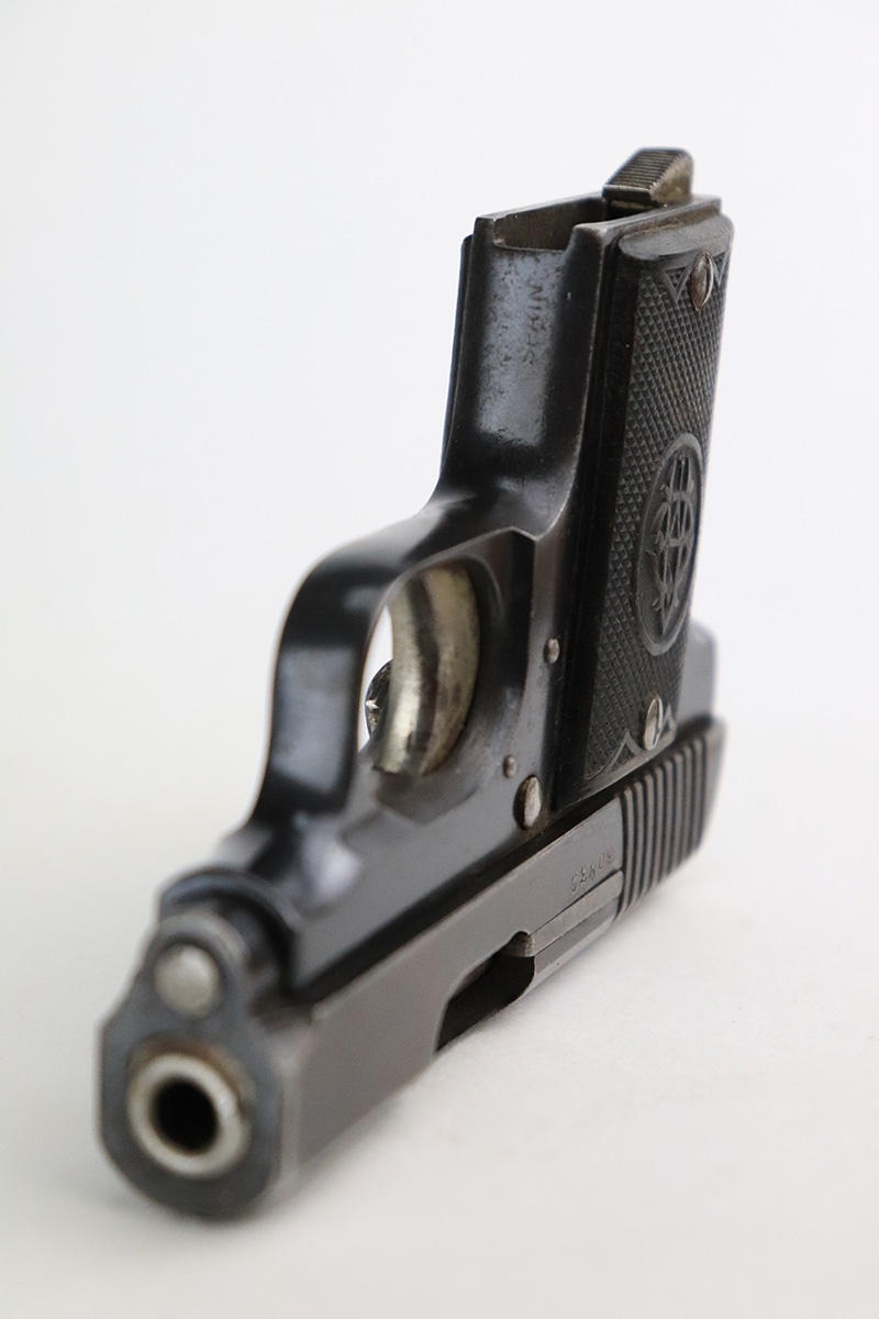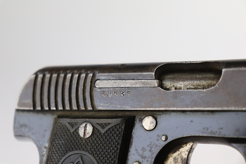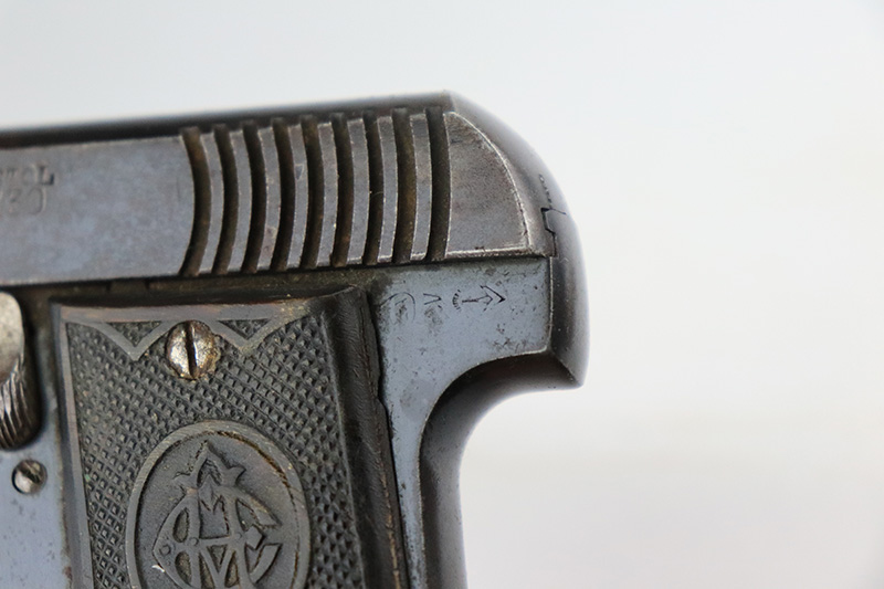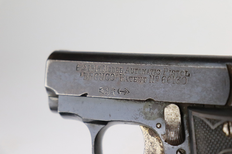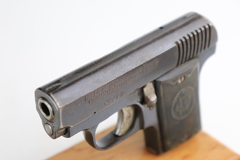 8/26/22 – This is a nice example of a Spanish “Bronco” Model 1918 pistol, chambered in 6.35mm. It is all matching and has retained roughly 85% of its original finish. “Spain” export mark on the front strap. There is wear around the high edges in general and some thinning on the right side of the slide. While there isn’t a ton of actual finish loss, there is noticeable brown patina and spotty oxidation throughout. Comes with nice period-correct grips – some minor warping and light cracking along some of the edges. Also comes with one proper magazine. The rifling in the bore is decent, but there is obvious pitting in the grooves.
