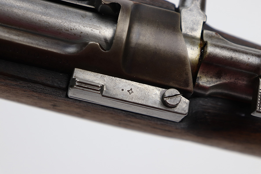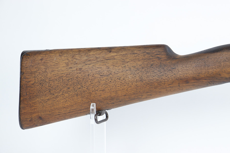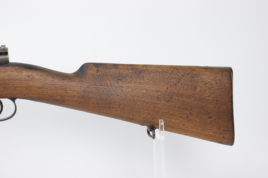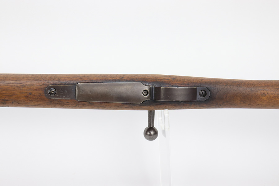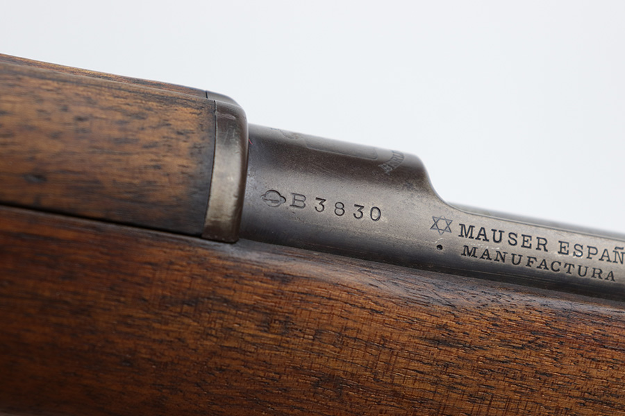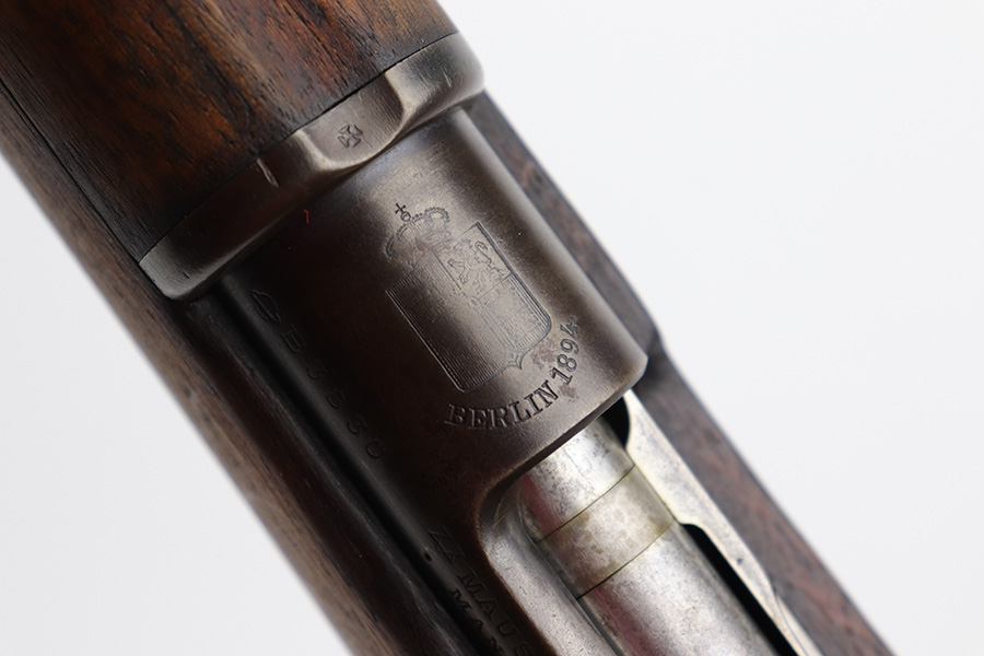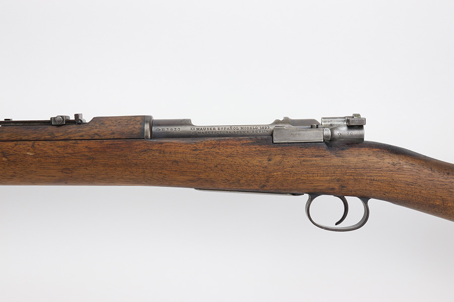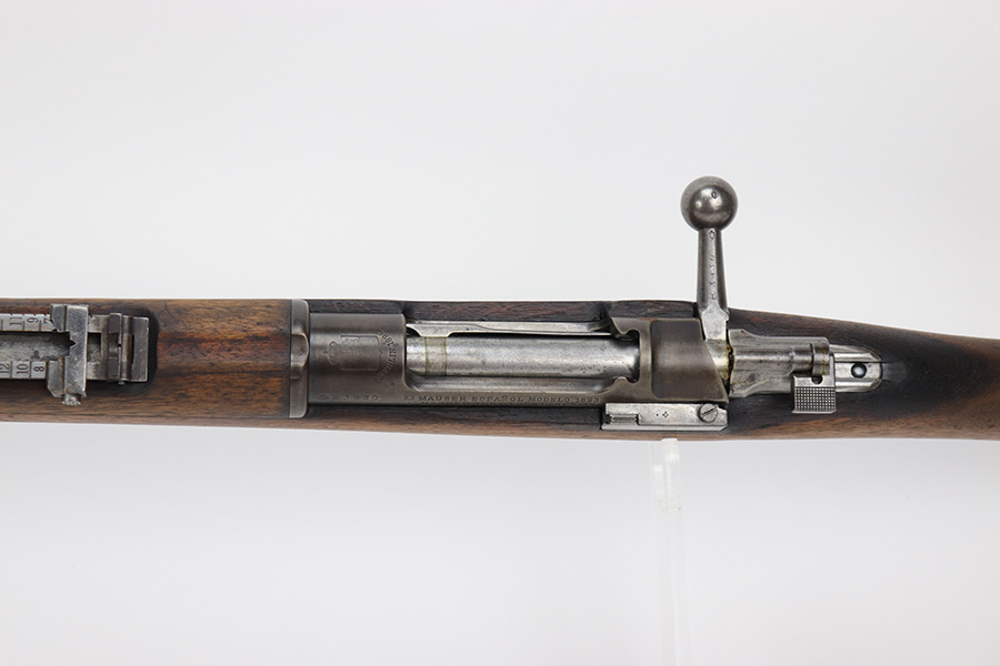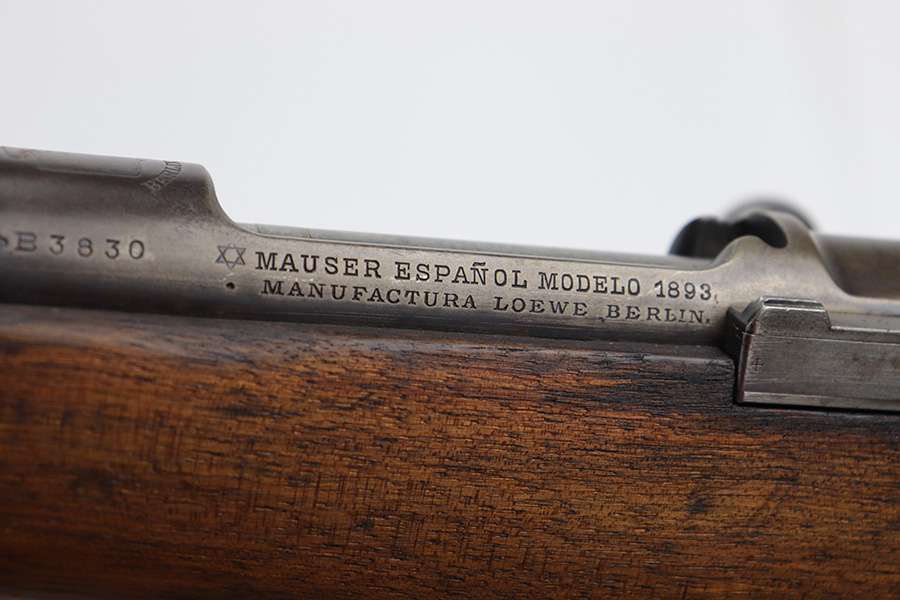 6/21/23 – This is a Spanish American War production Mauser model 1893 Spanish Contract Rifle. This example is early production, as indicated by the date stamp under the Spanish Royal Crest on the receiver, 1894. Manufactured by Ludwig Loewe under Mauser contract. The rifle has all matching numbered parts and is in very good condition with light, natural patina throughout. We rate the finish around 60% although most of the finish is tarnished with brown patina. There is no rust or pitting however, nor any corroded areas of metal. The rear sight is missing the top screw, but this doesn’t seem to affect fit or function of the sight or sight adjustment. The stock is excellent, with evidence of light sanding throughout but no cracks or chips in the wood. The left side of the buttstock still shows the original cartouche stamp of the Royal Crest with date of 1894 underneath. Mechanically sound with a good bore that rates 7/10 overall. The bore has strong rifling but there’s surface patina and mild wear throughout – signs of honest use and aging but no major issues. This is an antique, so no FFL required.