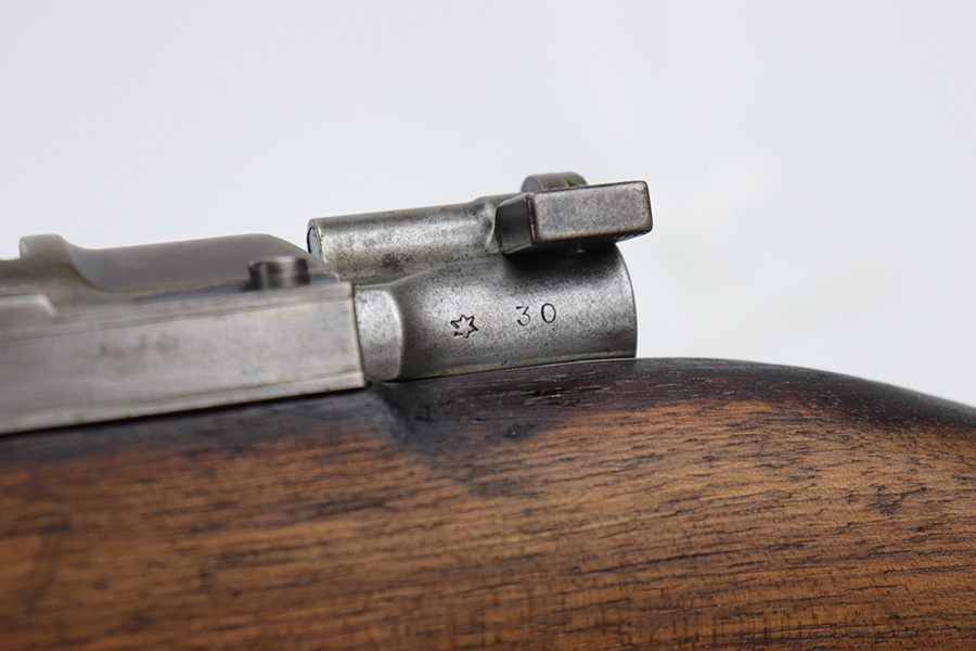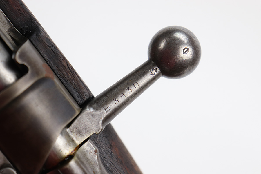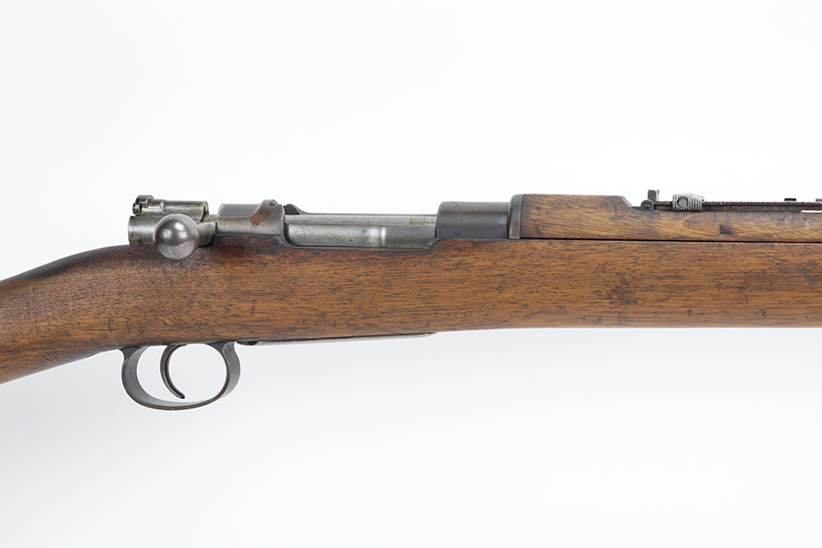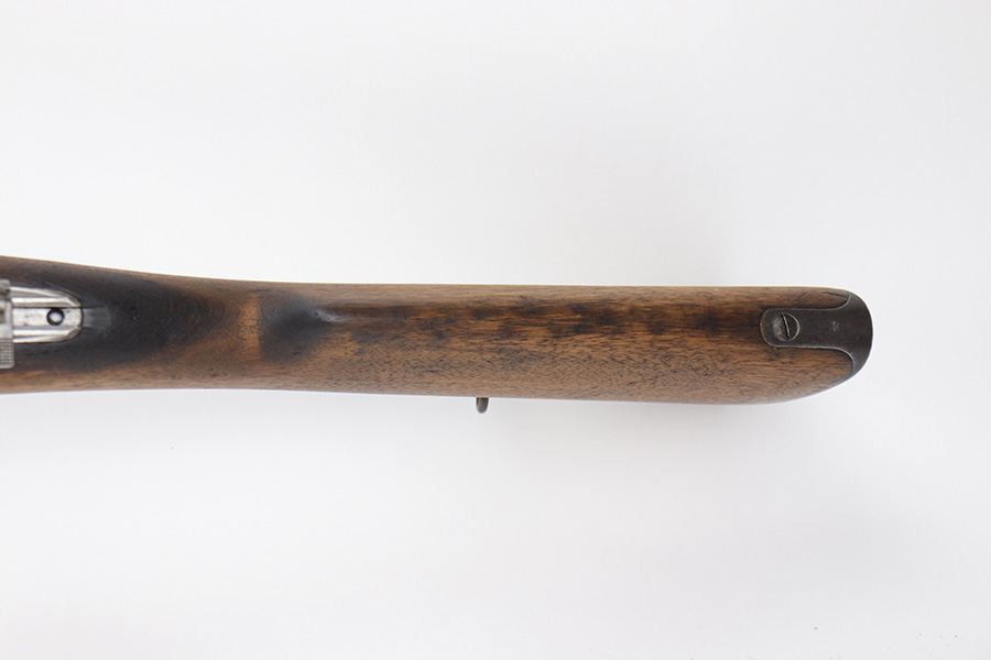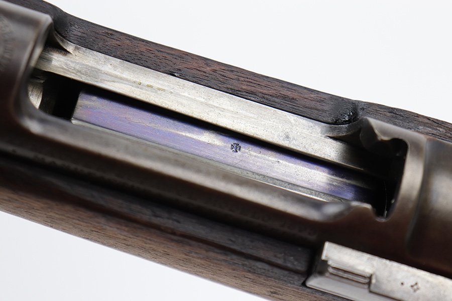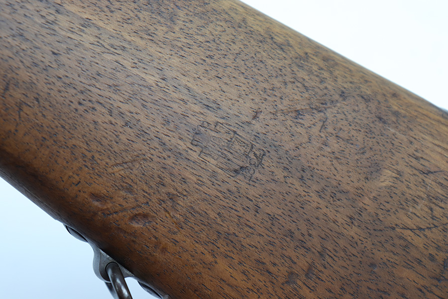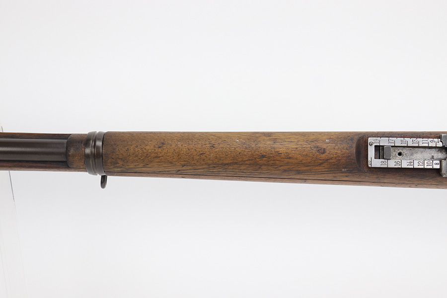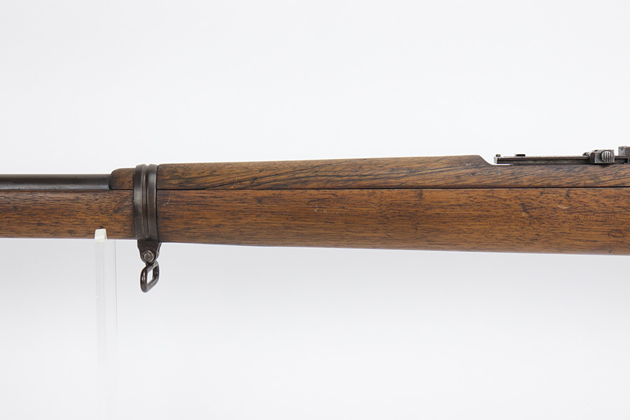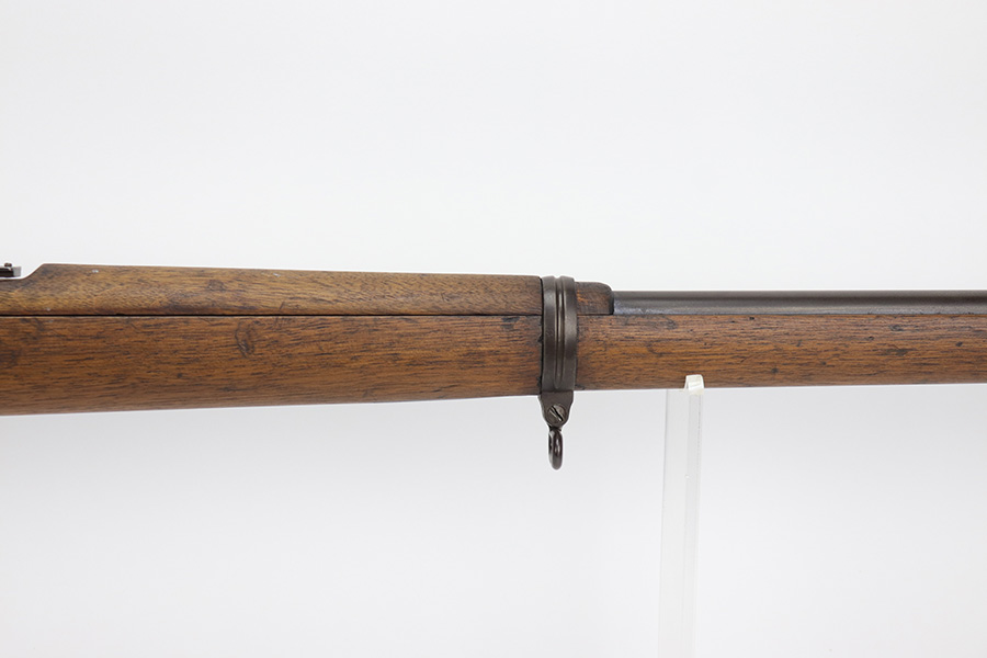 6/21/23 – This is a Spanish American War production Mauser model 1893 Spanish Contract Rifle. This example is early production, as indicated by the date stamp under the Spanish Royal Crest on the receiver, 1894. Manufactured by Ludwig Loewe under Mauser contract. The rifle has all matching numbered parts and is in very good condition with light, natural patina throughout. We rate the finish around 60% although most of the finish is tarnished with brown patina. There is no rust or pitting however, nor any corroded areas of metal. The rear sight is missing the top screw, but this doesn’t seem to affect fit or function of the sight or sight adjustment. The stock is excellent, with evidence of light sanding throughout but no cracks or chips in the wood. The left side of the buttstock still shows the original cartouche stamp of the Royal Crest with date of 1894 underneath. Mechanically sound with a good bore that rates 7/10 overall. The bore has strong rifling but there’s surface patina and mild wear throughout – signs of honest use and aging but no major issues. This is an antique, so no FFL required.