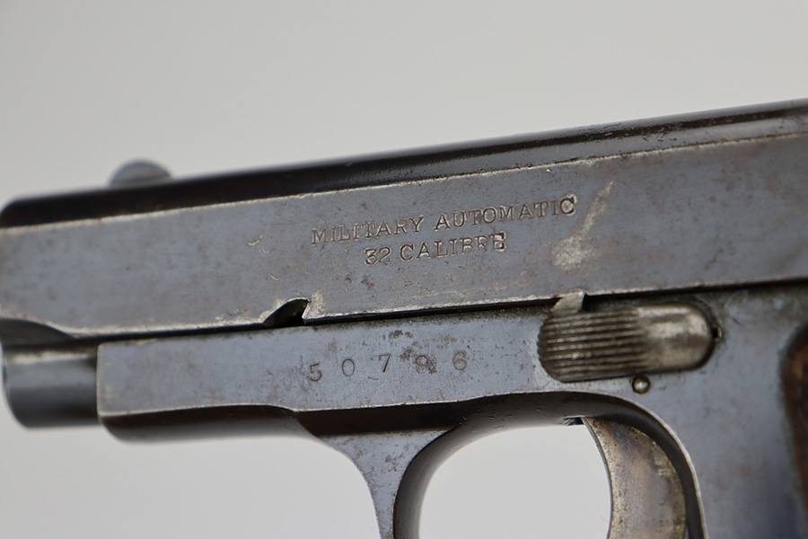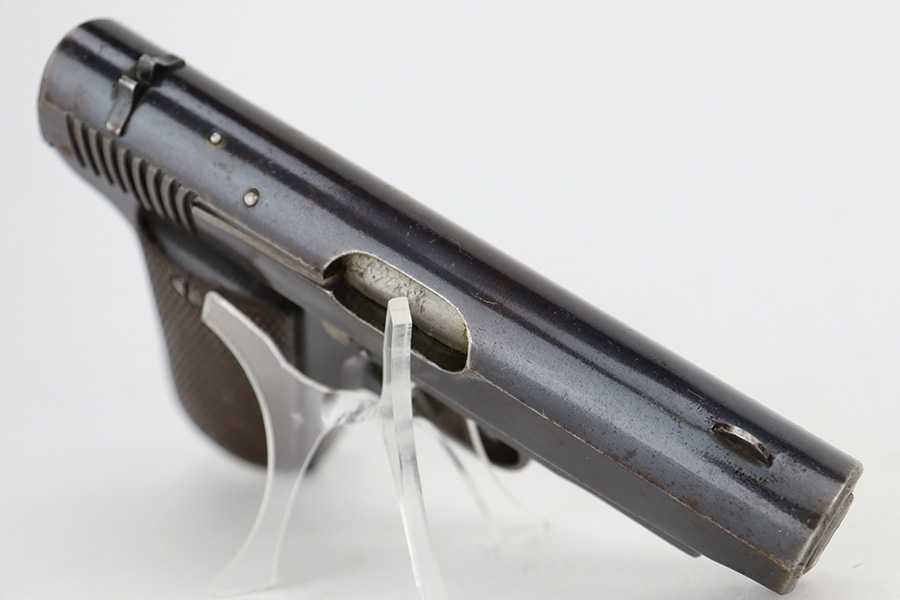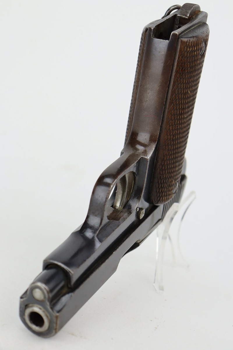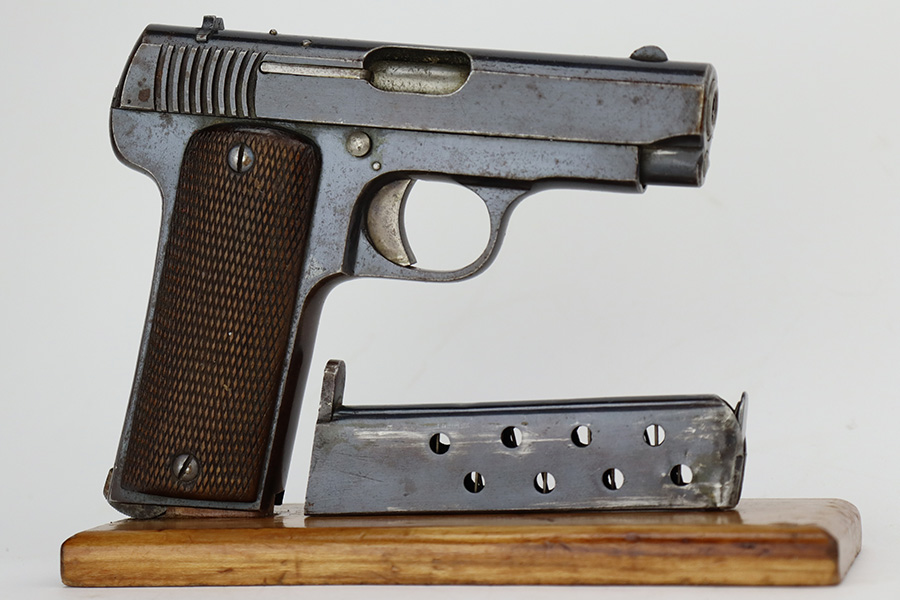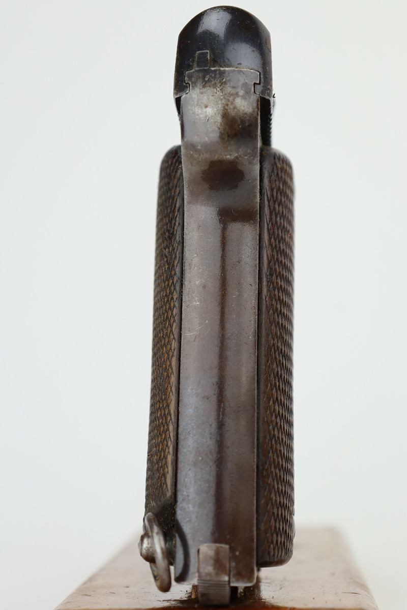 7/10/23 – This is a nice example of a Spanish Eibar / Ruby manufactured in the early 1900’s. Many of these guns were issued to the French military, but this one lacks those French markings. “Made in Spain” commercial export marking on the left side of the tang. The gun has retained about 90% of its bluing with minor wear on the high edges in general and minor thinning on the grip straps. While there is not much actual finish loss, there is spotty brown patina throughout. Fitted with nice period-correct wood grips. Comes with one proper magazine. The bore has decent rifling, but there is minor pitting in the grooves.