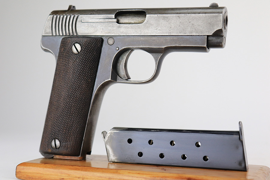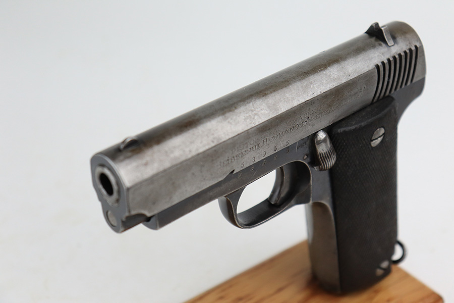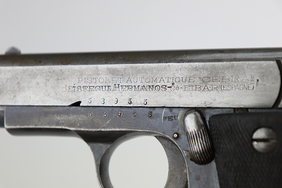 5/26/22 – This is a Spanish Eibar / Ruby pistol issued to the French military in the early 1900’s. The gun is all matching, has an “AZ” proof on the frame, and has “French Star” proofs on the base of the frame. There is a factory over-stamp on the slide legend as well. It has lost most of its original bluing, retaining only roughly 15%. Small spots of brown patina here and there throughout. Comes with slightly worn wood grips and one proper magazine. The bore has decent rifling, but there is tiny pitting throughout.