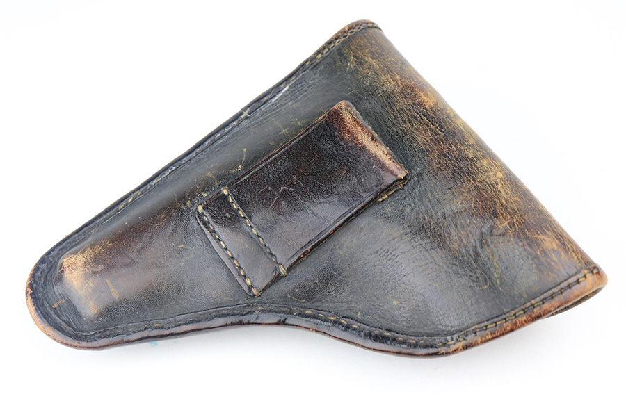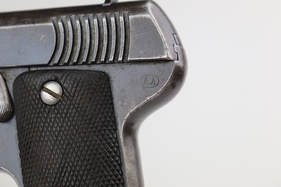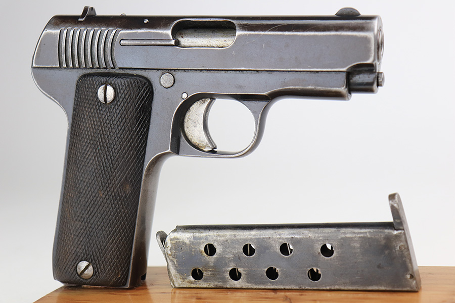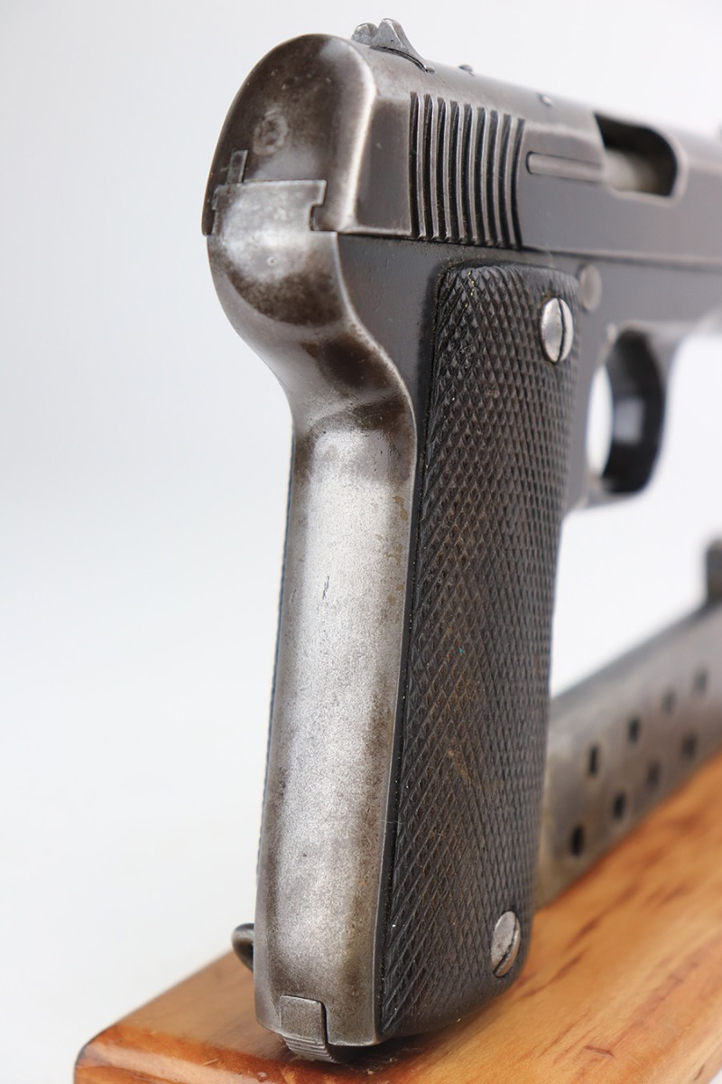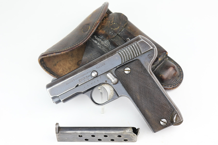 4/5/22 – This is a nice example of a Spanish Eibar / Ruby pistol issued to the French military in the early 1900’s. The gun is all matching and has an “AA” proof on the left side of the frame and French star proofs on the base of the frame. The gun comes as a rig with a nice brown leather holster and one proper magazine. The gun has retained roughly half of its original finish. The majority the finish loss is on both grip straps, but there is spotty wear along the slide, concentrated mostly around the high edges and top. There are a few scratches on the right side of the slide. There is a name extremely lightly scratched into the right side of the frame and a tiny floral pattern scratched into the left side of the slide. Comes with slightly worn wood grips. The bore has decent rifling, but there are some areas with tiny pits here and there.