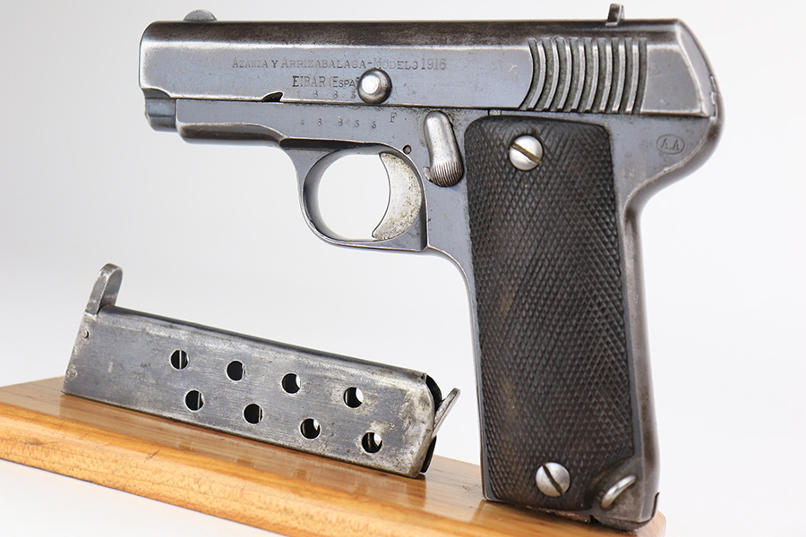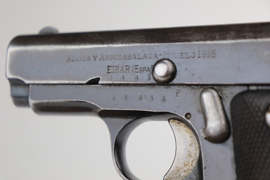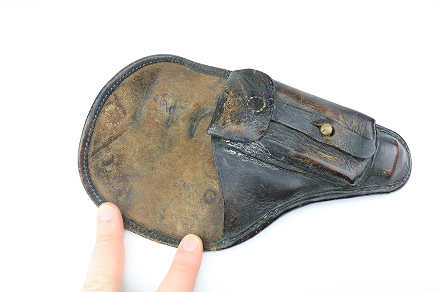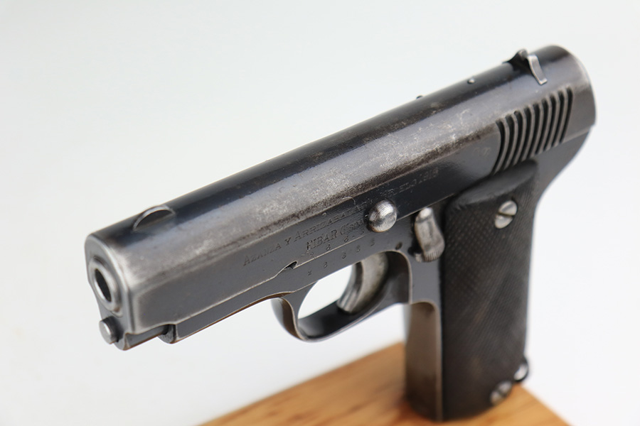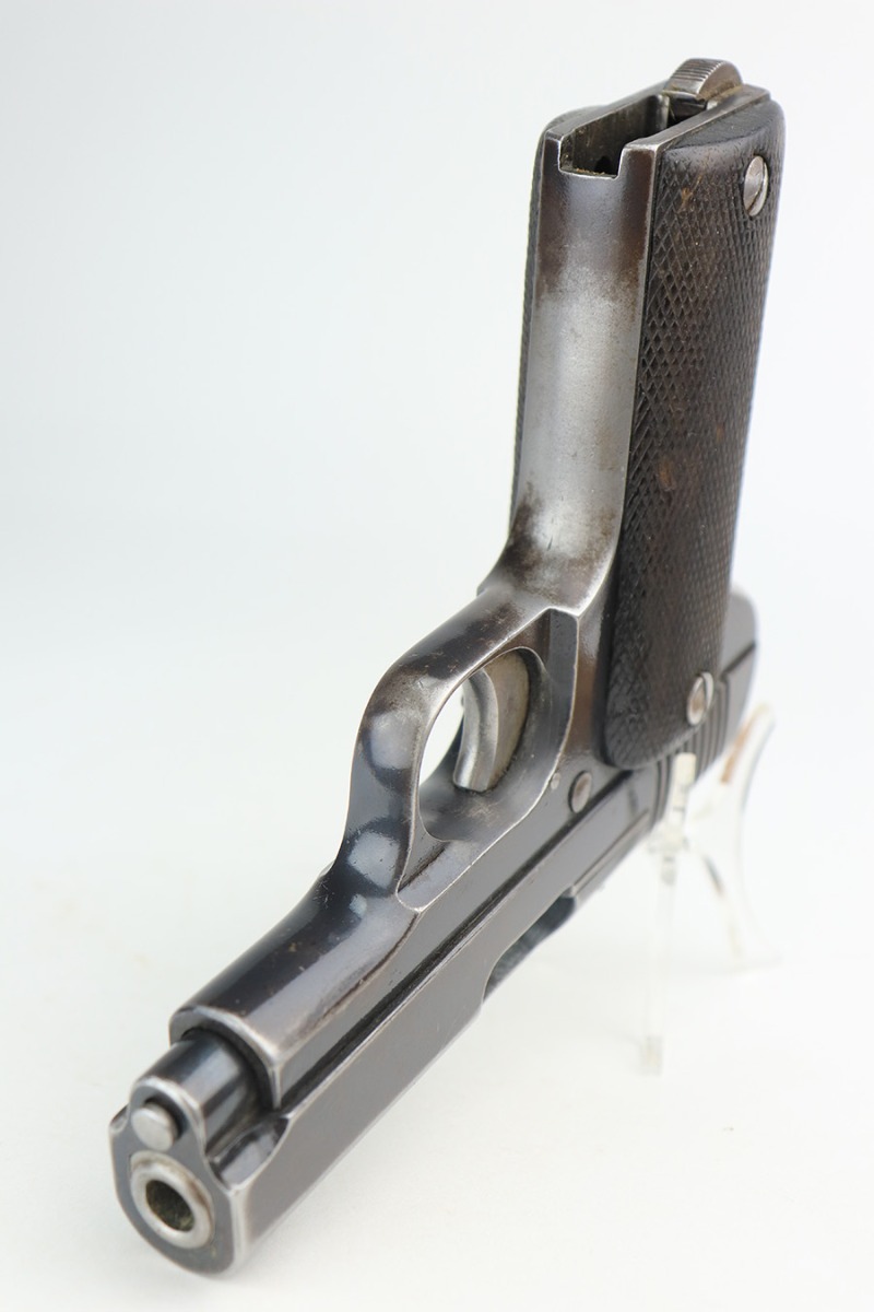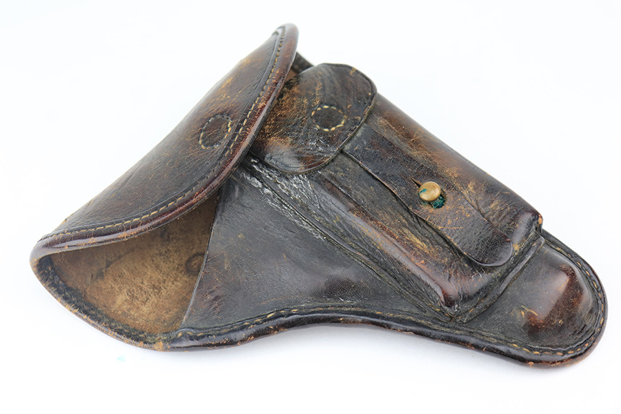 4/5/22 – This is a nice example of a Spanish Eibar / Ruby pistol issued to the French military in the early 1900’s. The gun is all matching and has an “AA” proof on the left side of the frame and French star proofs on the base of the frame. The gun comes as a rig with a nice brown leather holster and one proper magazine. The gun has retained roughly half of its original finish. The majority the finish loss is on both grip straps, but there is spotty wear along the slide, concentrated mostly around the high edges and top. There are a few scratches on the right side of the slide. There is a name extremely lightly scratched into the right side of the frame and a tiny floral pattern scratched into the left side of the slide. Comes with slightly worn wood grips. The bore has decent rifling, but there are some areas with tiny pits here and there.