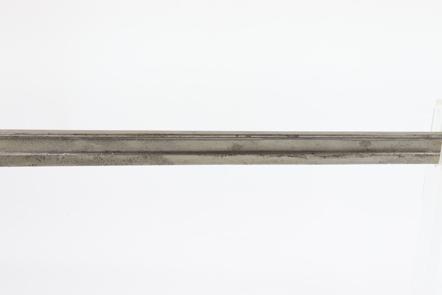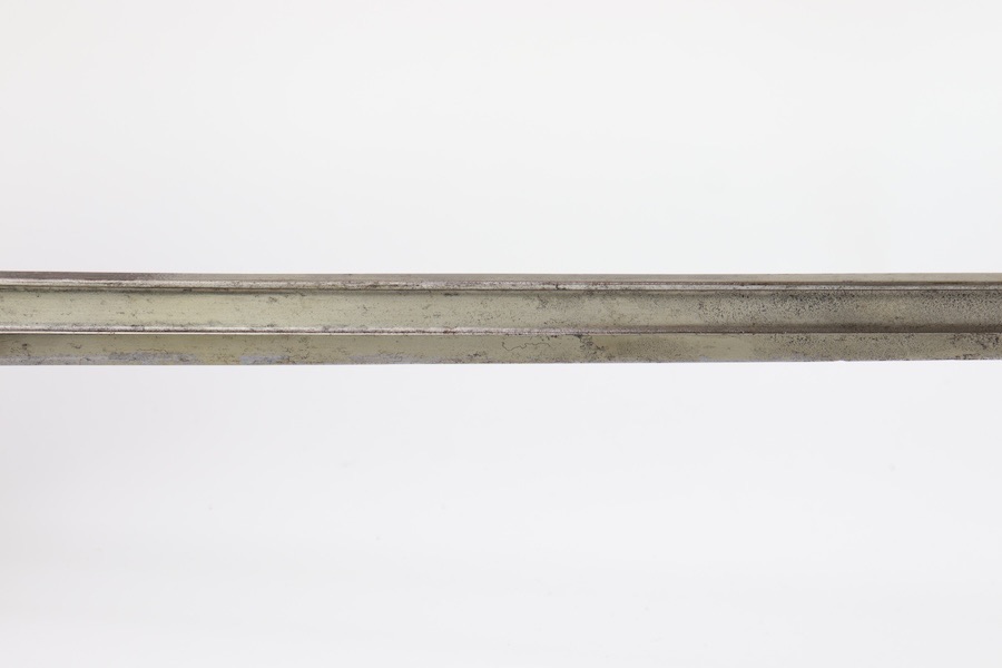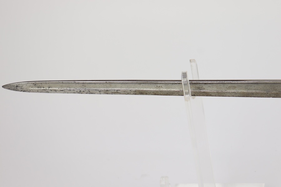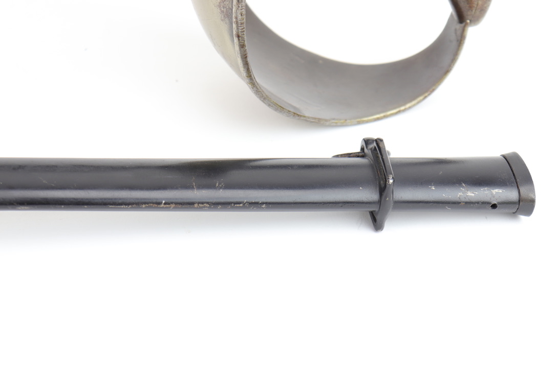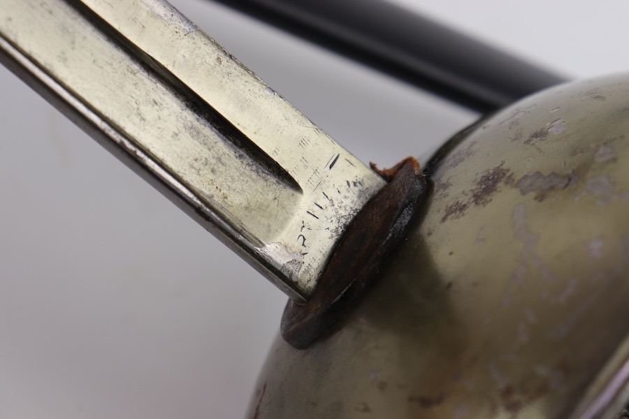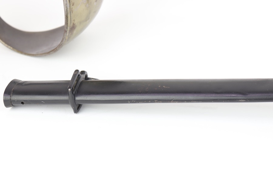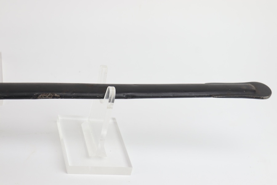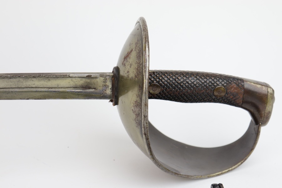8/12/24 – For sale is a great-condition M1907 Spanish Cavalry sword. This sword comes with a correct and original scabbard. The scabbard has a few minor dents here and there, as well as a small crack on the underside, but the dents are primarily cosmetic and do not inhibit the sword’s ability to be sheathed. The scabbard also looks to have been re-blued at a later date. The blade itself has a fair bit of pitting throughout but looks to have been wire-wheeled and no longer has any active rust. The ricasso has a serial number, but the maker stamp has faded. The guard is made of thick, rolled steel that shows no dents or deformations. Grips are solid with no splits or cracks.