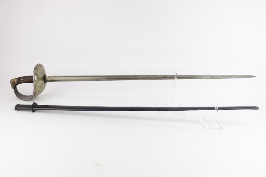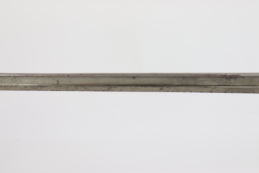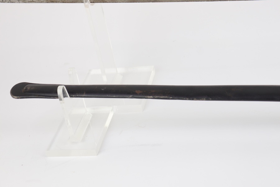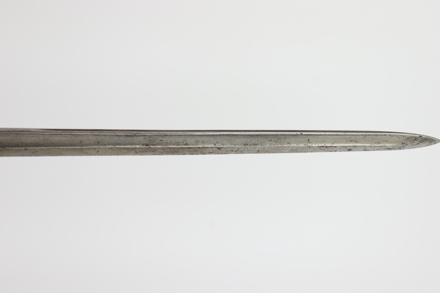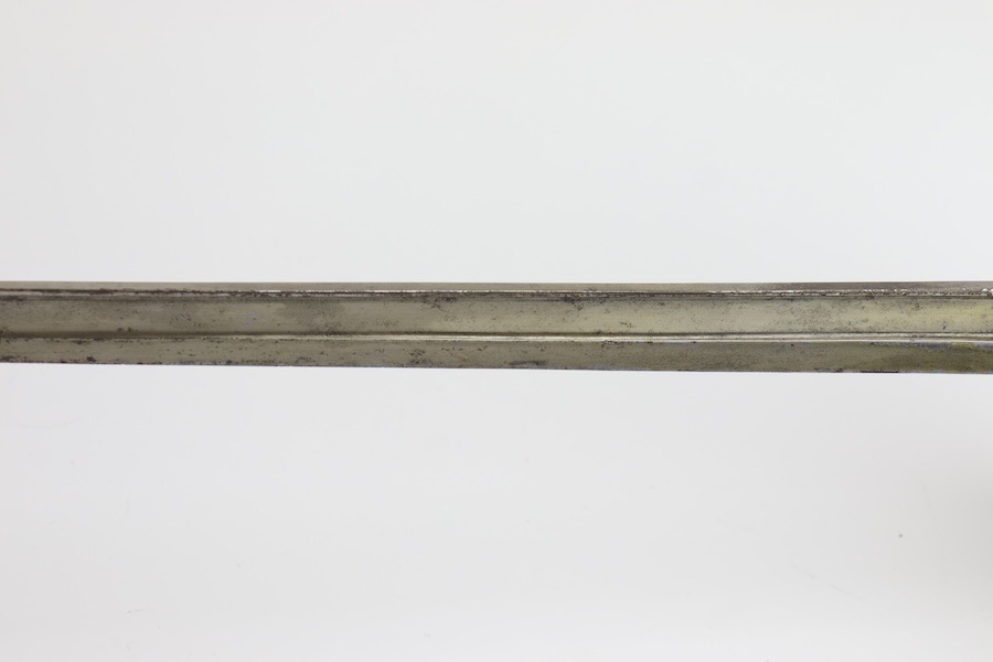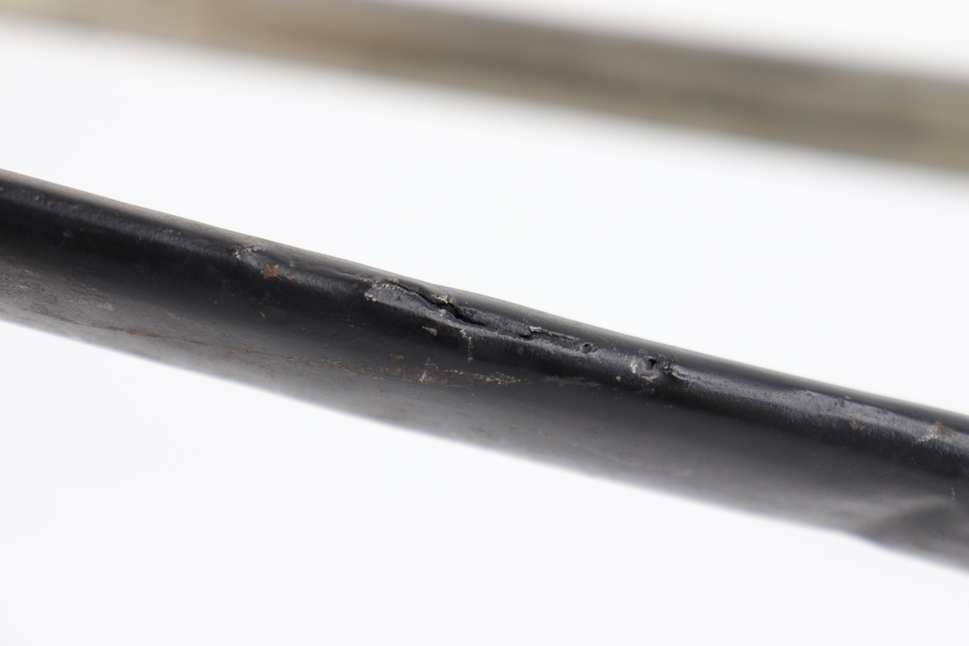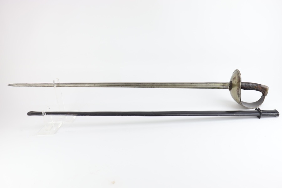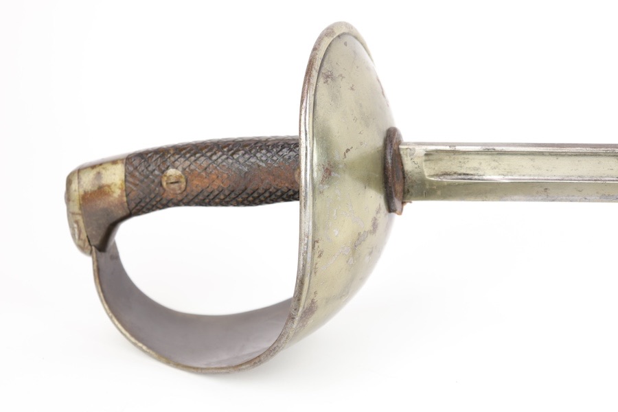 8/12/24 – For sale is a great-condition M1907 Spanish Cavalry sword. This sword comes with a correct and original scabbard. The scabbard has a few minor dents here and there, as well as a small crack on the underside, but the dents are primarily cosmetic and do not inhibit the sword’s ability to be sheathed. The scabbard also looks to have been re-blued at a later date. The blade itself has a fair bit of pitting throughout but looks to have been wire-wheeled and no longer has any active rust. The ricasso has a serial number, but the maker stamp has faded. The guard is made of thick, rolled steel that shows no dents or deformations. Grips are solid with no splits or cracks.