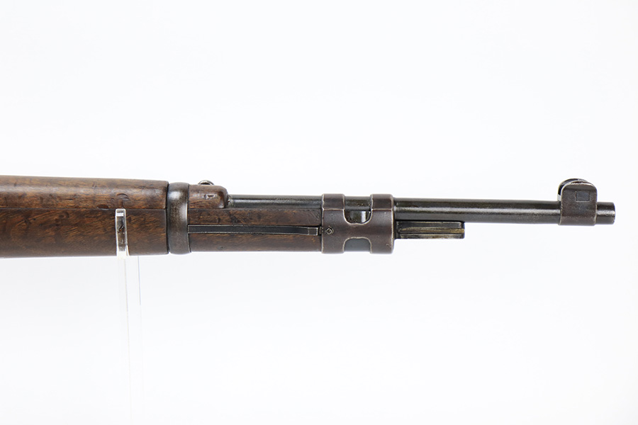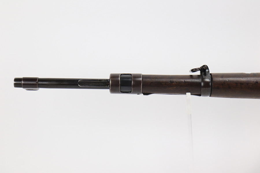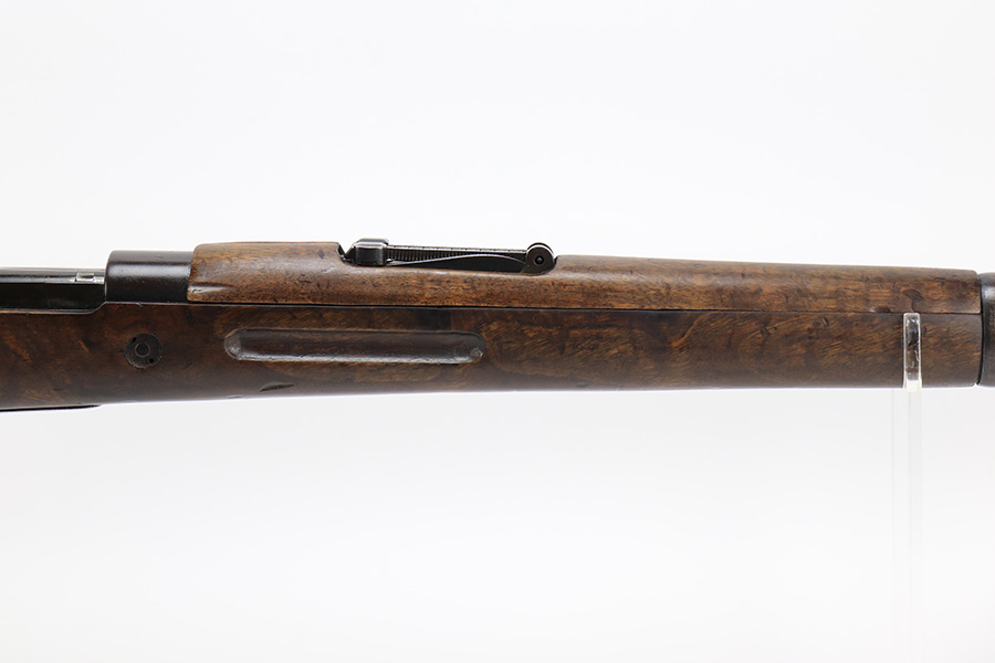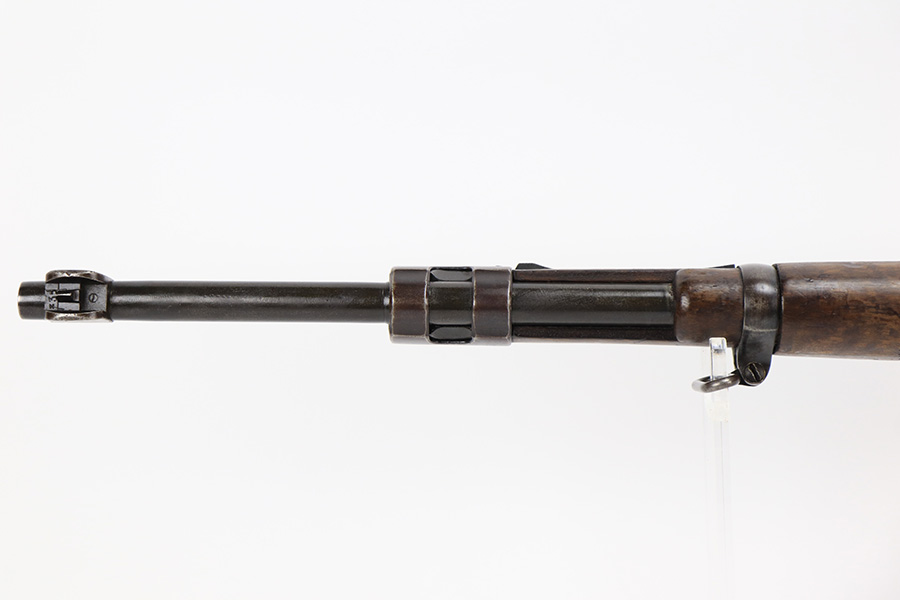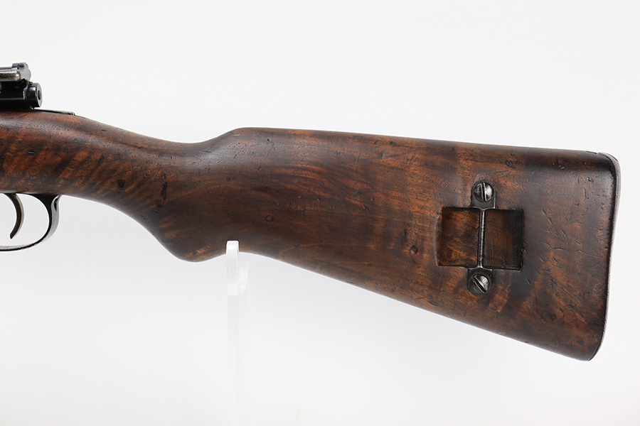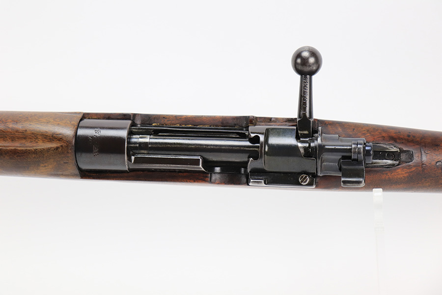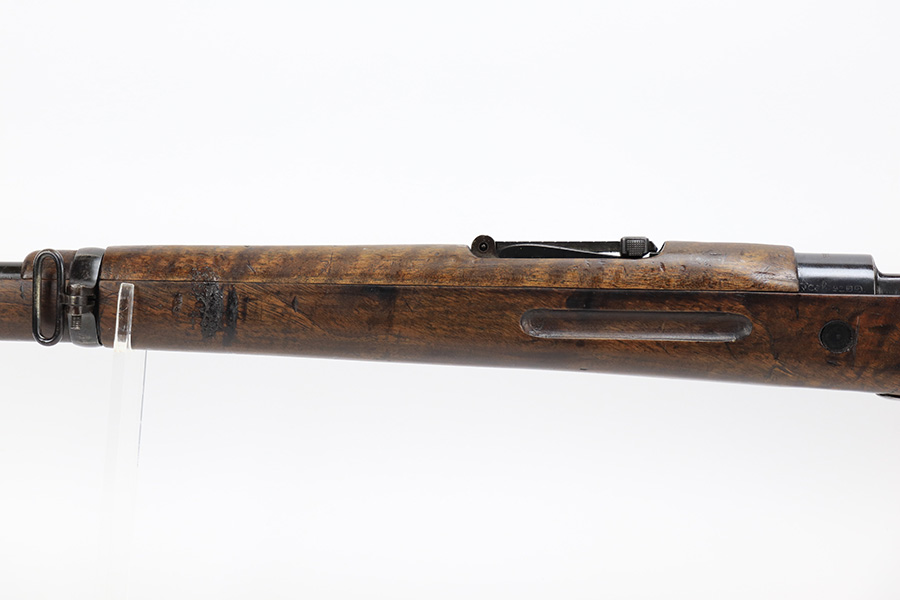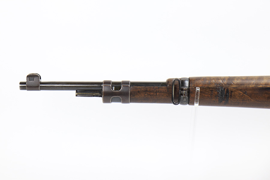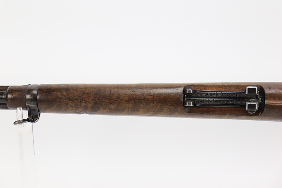 6/2/23 – This is a very nice example of a Spanish Mauser M44, chambered in 8mm Mauser. From the crest on the receiver, this gun was issued to the Spanish Air Force. It is all matching and has no import marks. The metal parts have retained about 92% of their finish with general high edge wear and some thinning on the rear barrel band. While there isn’t a ton of actual finish loss, there is brown patina under the finish on most of the gun. Noticeable dings and spotty brown patina on the butt plate. There are also a few small dings on the floor plate and an area of minor pitting on the trigger guard. There is minor bruising and scratching on the wood furniture and a couple of noticeable gouges on the left side near the rear barrel band. The bore has good rifling, but there is minor frosting in the grooves.