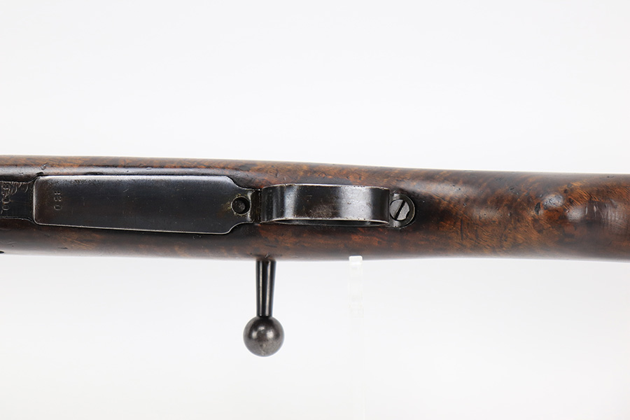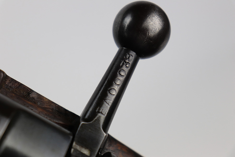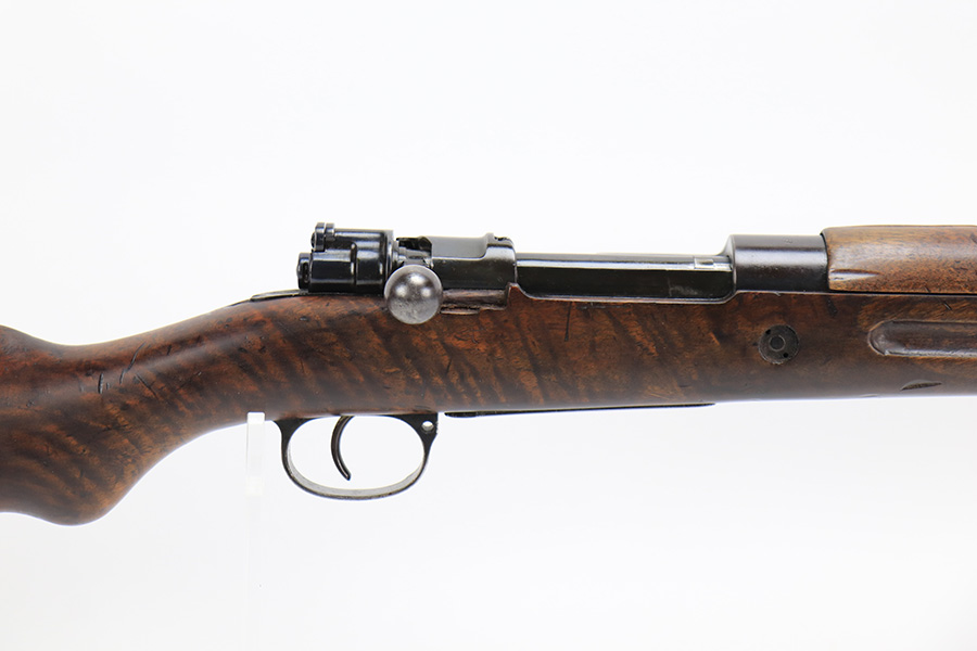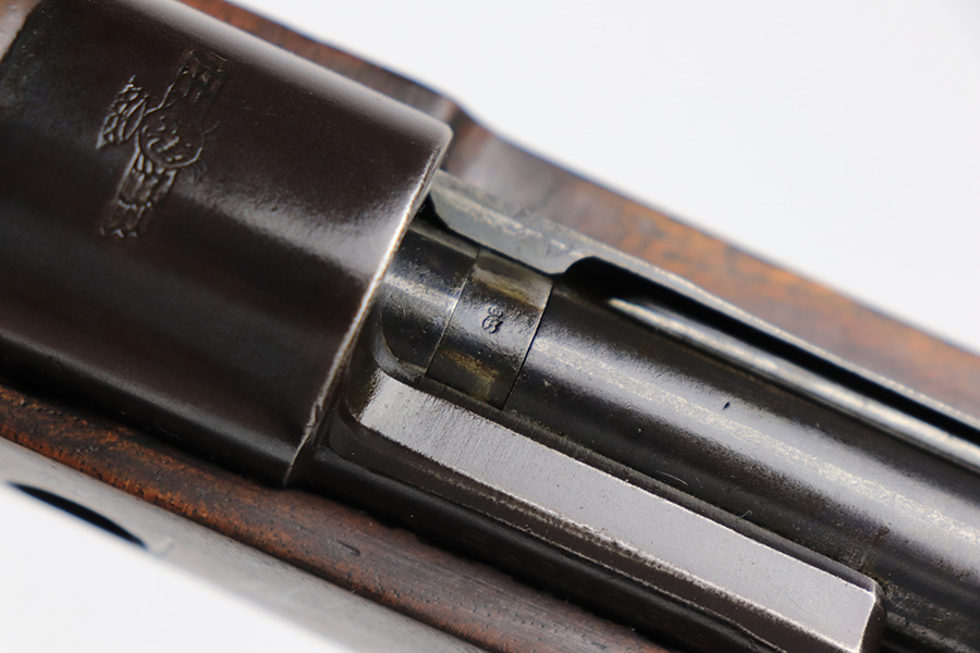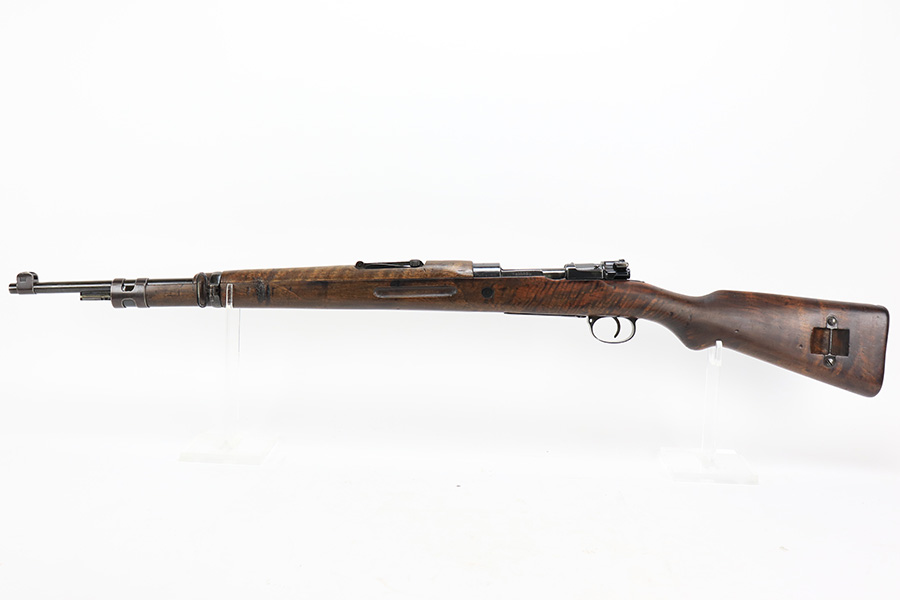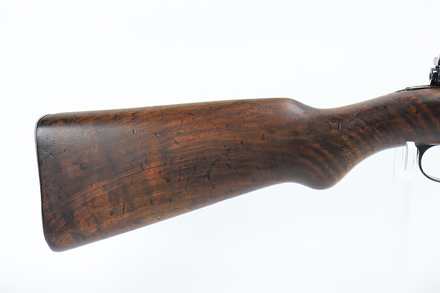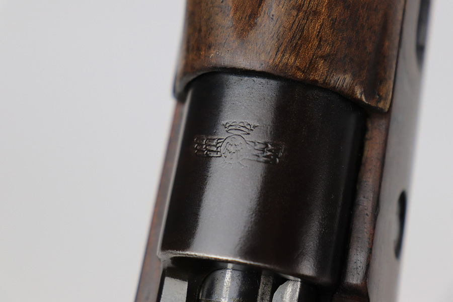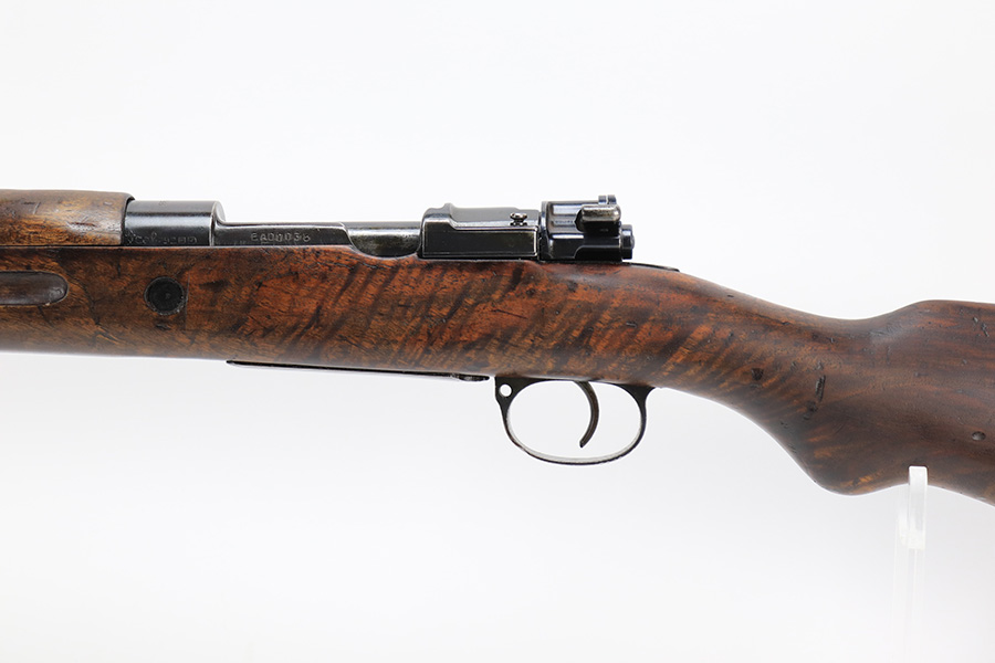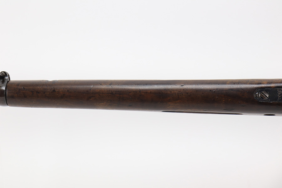 6/2/23 – This is a very nice example of a Spanish Mauser M44, chambered in 8mm Mauser. From the crest on the receiver, this gun was issued to the Spanish Air Force. It is all matching and has no import marks. The metal parts have retained about 92% of their finish with general high edge wear and some thinning on the rear barrel band. While there isn’t a ton of actual finish loss, there is brown patina under the finish on most of the gun. Noticeable dings and spotty brown patina on the butt plate. There are also a few small dings on the floor plate and an area of minor pitting on the trigger guard. There is minor bruising and scratching on the wood furniture and a couple of noticeable gouges on the left side near the rear barrel band. The bore has good rifling, but there is minor frosting in the grooves.
