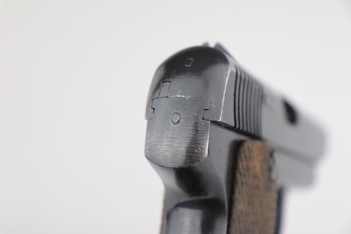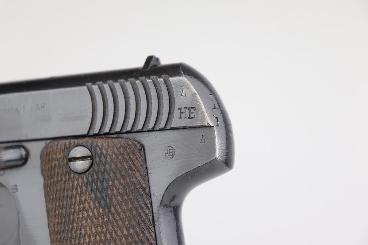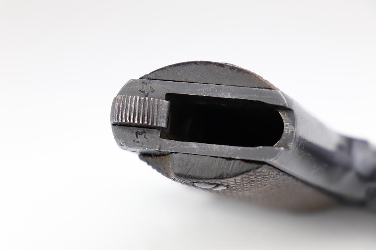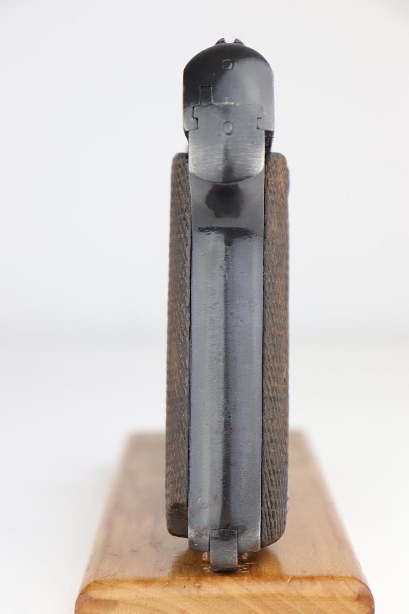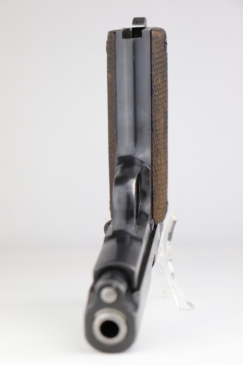 5/8/19 – Made around 1916 in Spain by the Hijoes de A Echeverria company, this is a Ruby pistol that was part of a large contract order by France during the Great War. It retains 97-98% original blue with thinning at the edges, and some patina on the slide and back strap. Terrific bore and excellent grips. French acceptance stars are visible on the bottom of the frame.