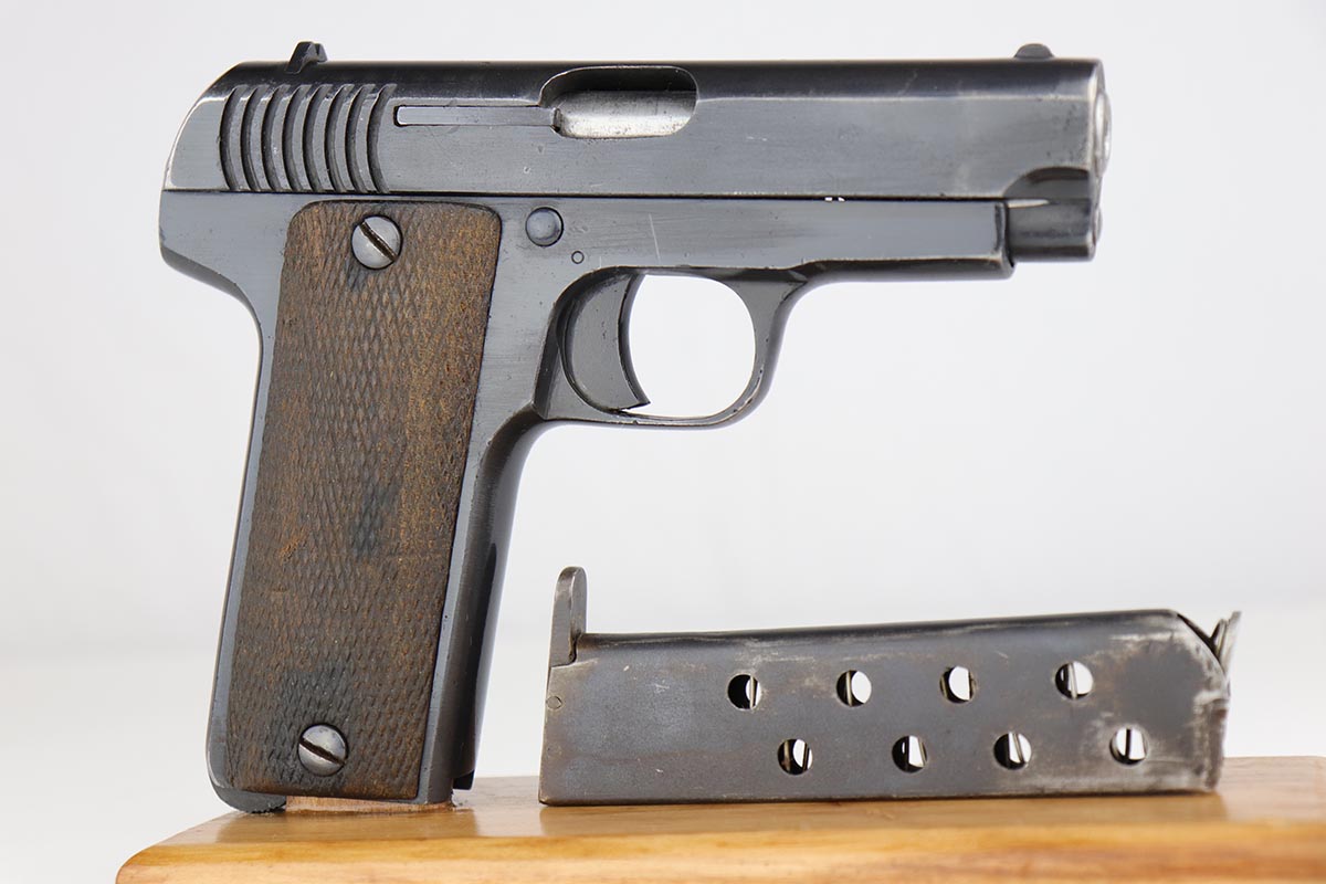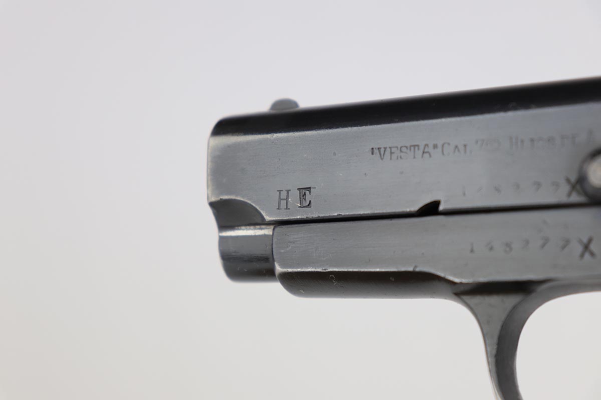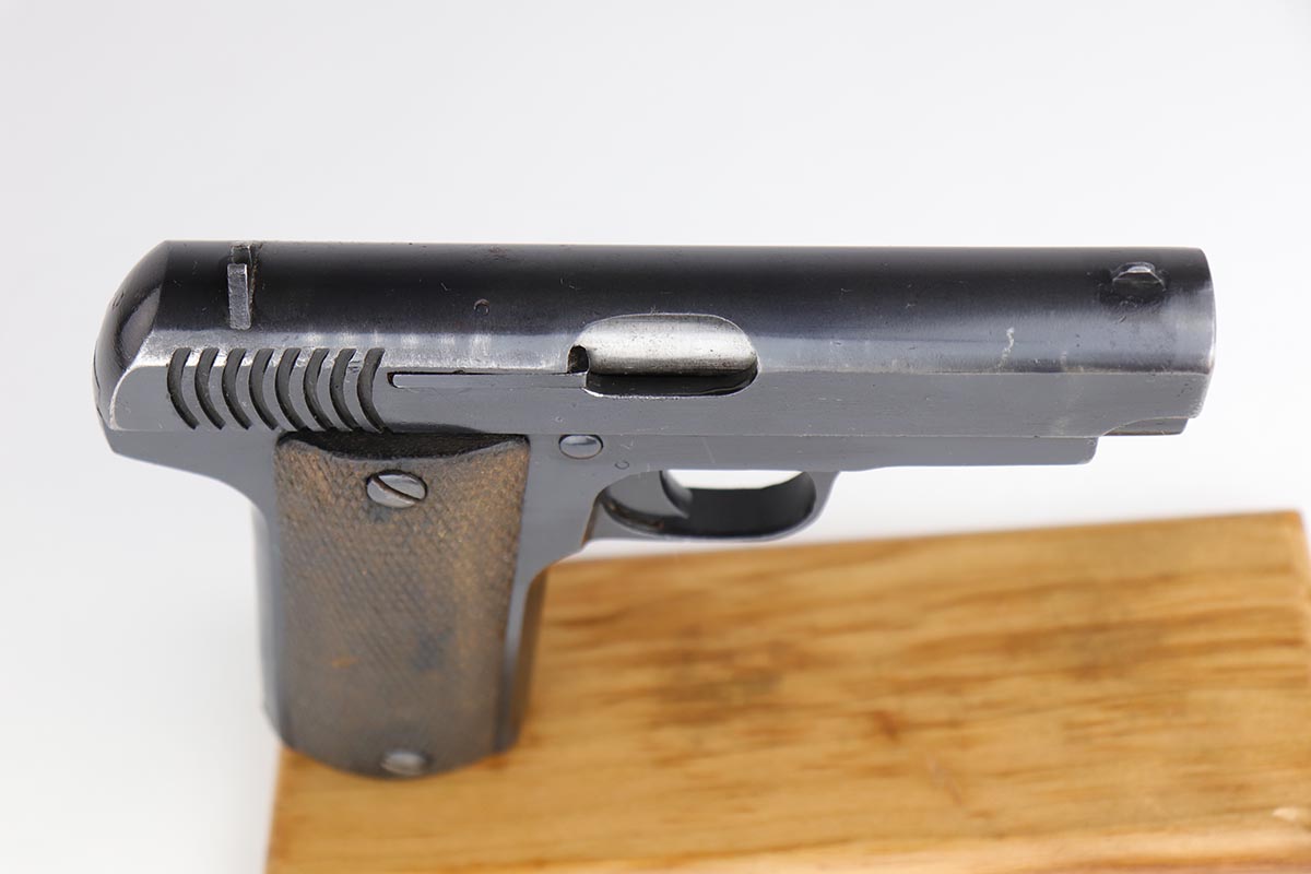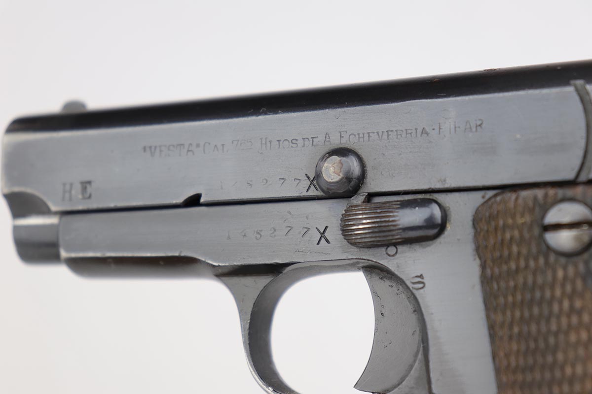 In 1914, just before the start of the First World War, Gabilondo started manufacture of a sturdy self-loading pistol based on the Browning Model 1903 and chambered for the 7.65mm Browning/.32 ACP cartridge. Unusual for the time, the magazine capacity was nine shots instead of the usual six or seven. The pistol was intended for export to the Americas, and despite the small calibre it was designed with military and police sales in mind. Other Spanish manufacturers had copied the Browning since around 1905. The Ruby, apart from the extended magazine appears to be a direct copy of a pistol called the “Victoria” made by Esperanza and Unceta. This pistol used features patented by Pedro Careaga in 1911, and by the Esperanza and Unceta company in 1912. These patents may have covered the frame-mounted safety (instead of a grip safety), and an internal striker (instead of a hammer). In 1915 Gabilondo sent examples of the pistols to the French government, who were hard-pressed for all sorts of small-arms, even in this early stage of the war. After testing was completed in May 1915, the French decided to accept the Ruby as the “Pistolet Automatique de 7 millimètre 65 genre “Ruby” and contracted Gabilondo to produce 10,000 pistols a month. By August the target had been raised to 30,000 and later still an incredible 50,000 a month. Despite its size, the company could barely cope with the initial contract and arranged for four partners to manufacture the Ruby for them. The contract stipulated that each company would produce a minimum of 5,000 pistols per month. Gabilondo would produce 10,000 guns, carry out overall quality control and arrange delivery to the French authorities in Bayonne. As the number of pistols required increased the company agreed to purchase any pistols in excess of the agreed number at the same contracted price. As demand increased Gabilondo recruited another three partners to help manufacture the Ruby. Estimates of Gabilondo Ruby production are between 250,000 and 300,000 pistols in total. While most Gabilondo contract pistols were of good quality, others were less well made.