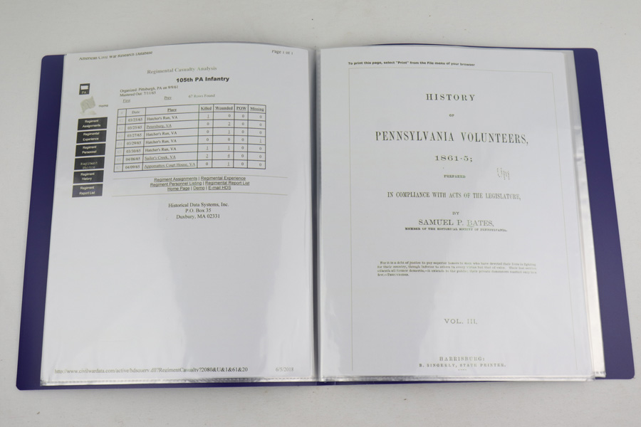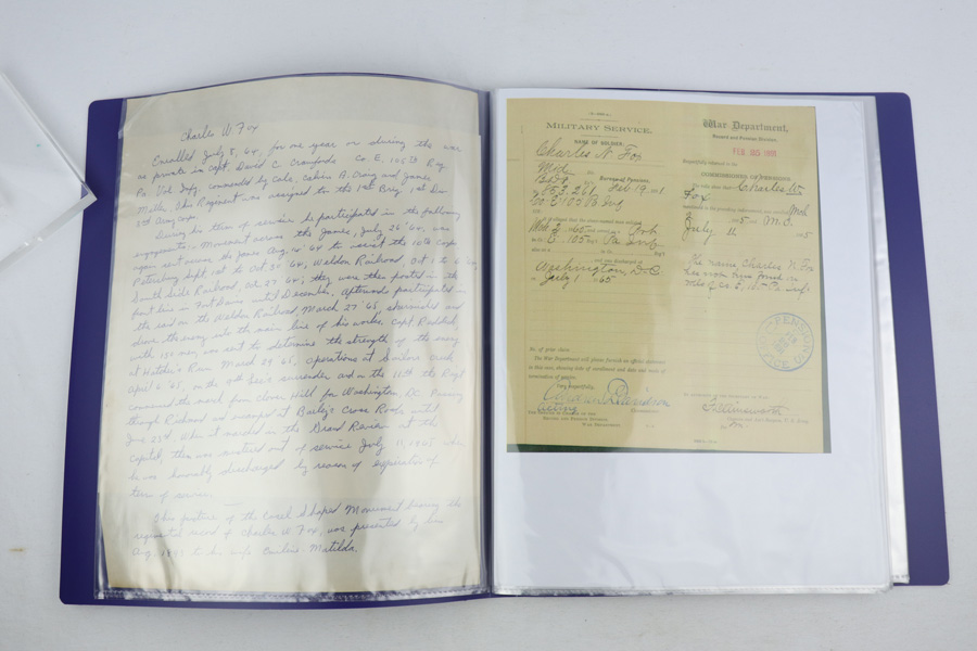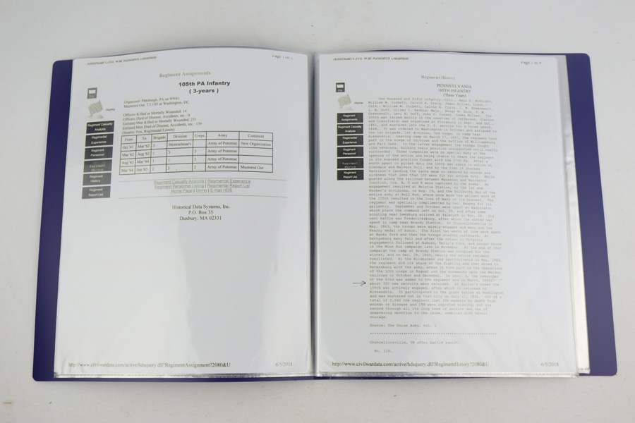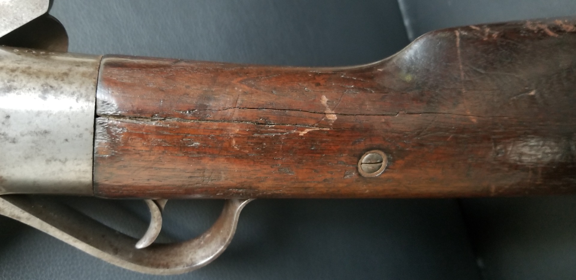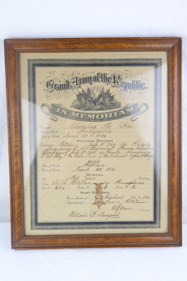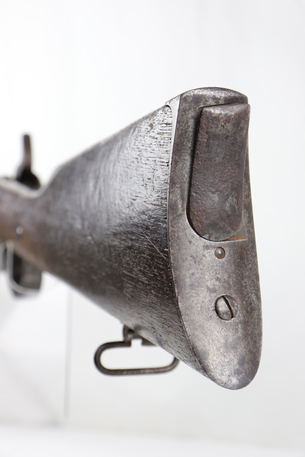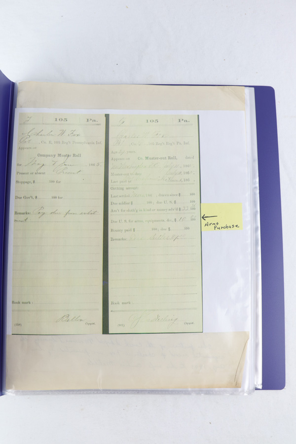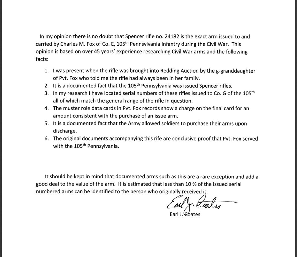1/25/19 – This is an original Spencer model 1860 Repeating Rifle. The rifle comes with a packet of documentation, both original documents and copies of public records, as well as a signed letter by author Earl J. Coates attesting to conclusive proof that Private Fox with the 105th Pennsylvania purchased this firearm upon discharge after the Civil War. There’s a copy of the discharge paperworks for Pvt. Fox included – a Spencer Rifle is noted but without serial number. However all of the documents together as well as the serial number range the rifle falls in all help to paint a conclusive picture for this rifle. Charles M Fox ( 1836- 1914) enlisted in the Union army July 1864 and was mustered out July 1865. He was a member of the 105th Pennsylvania volunteers. His unit engaged confederate forces at Hatchers creek, Sailors Run, Petersburg and finally the surrender at Appomattox Court House April 9,1865. Mr Fox served during these events. The gun has honest wear and patina throughout – as shown in photos. There is some cracking in on the right side of the stock. The rifle is loaded from the butt plate, and the metal loading cover is slightly loose, but original and in tact/functional. The rifle has a smooth action as well. Incredibly, the rifling is in tact and there’s speckling throughout. Overall about a 6/10. Please see photos for all that is included (documents, ammunition, public records / history). Guaranteed original and authentic.