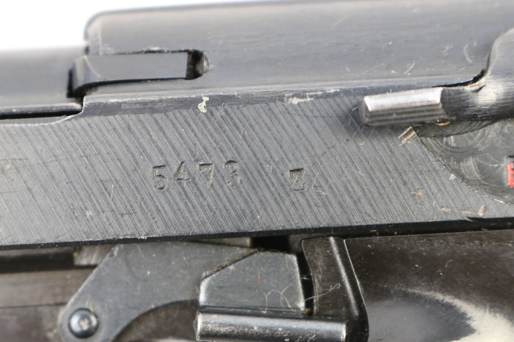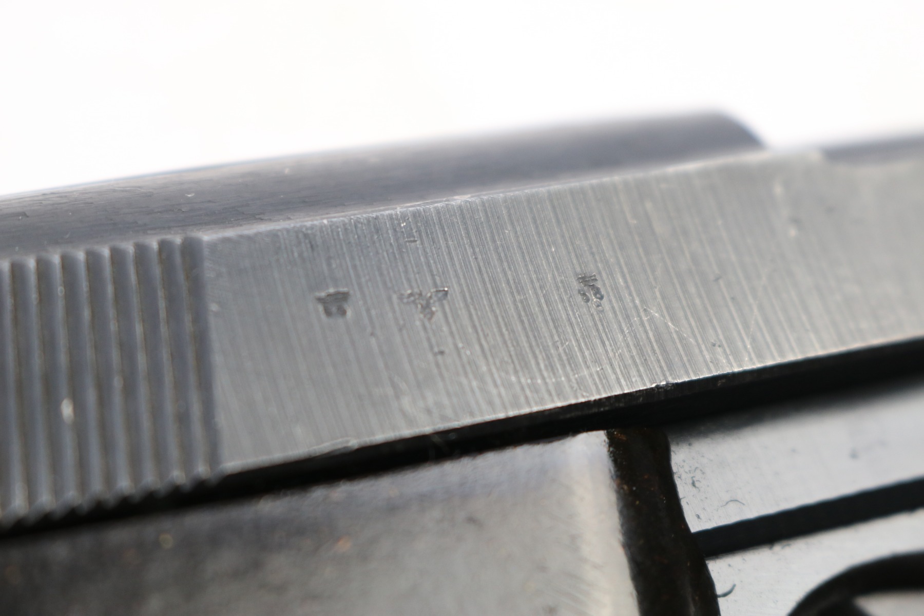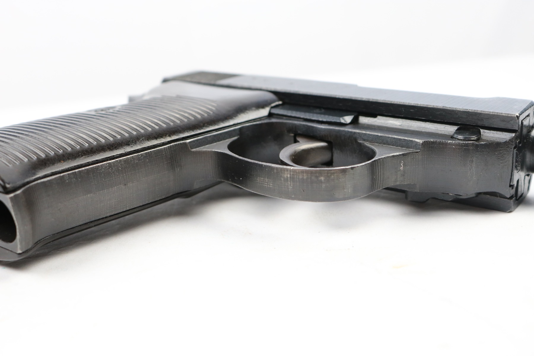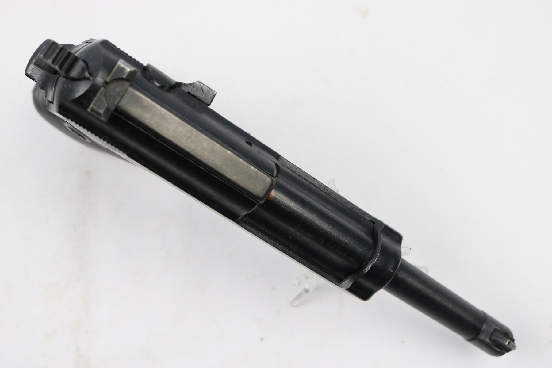 6/12/18 – This is an original 1945 production Spreewerk P.38. The pistol is in the “z” block, meaning it was made in Feb. of 1945 just before the end of the war. Has proper late war features such as a cog hammer and machine markings on the slide and frame. The blued finish is excellent overall, in about 97% condition. There some small spots of wear on the slide and light muzzle wear. The bore is excellent with one or two small spots of patina. Guaranteed original and fully functional.