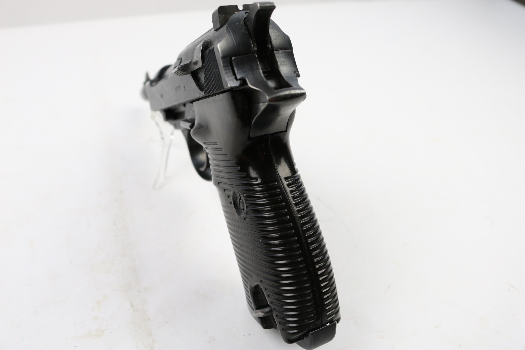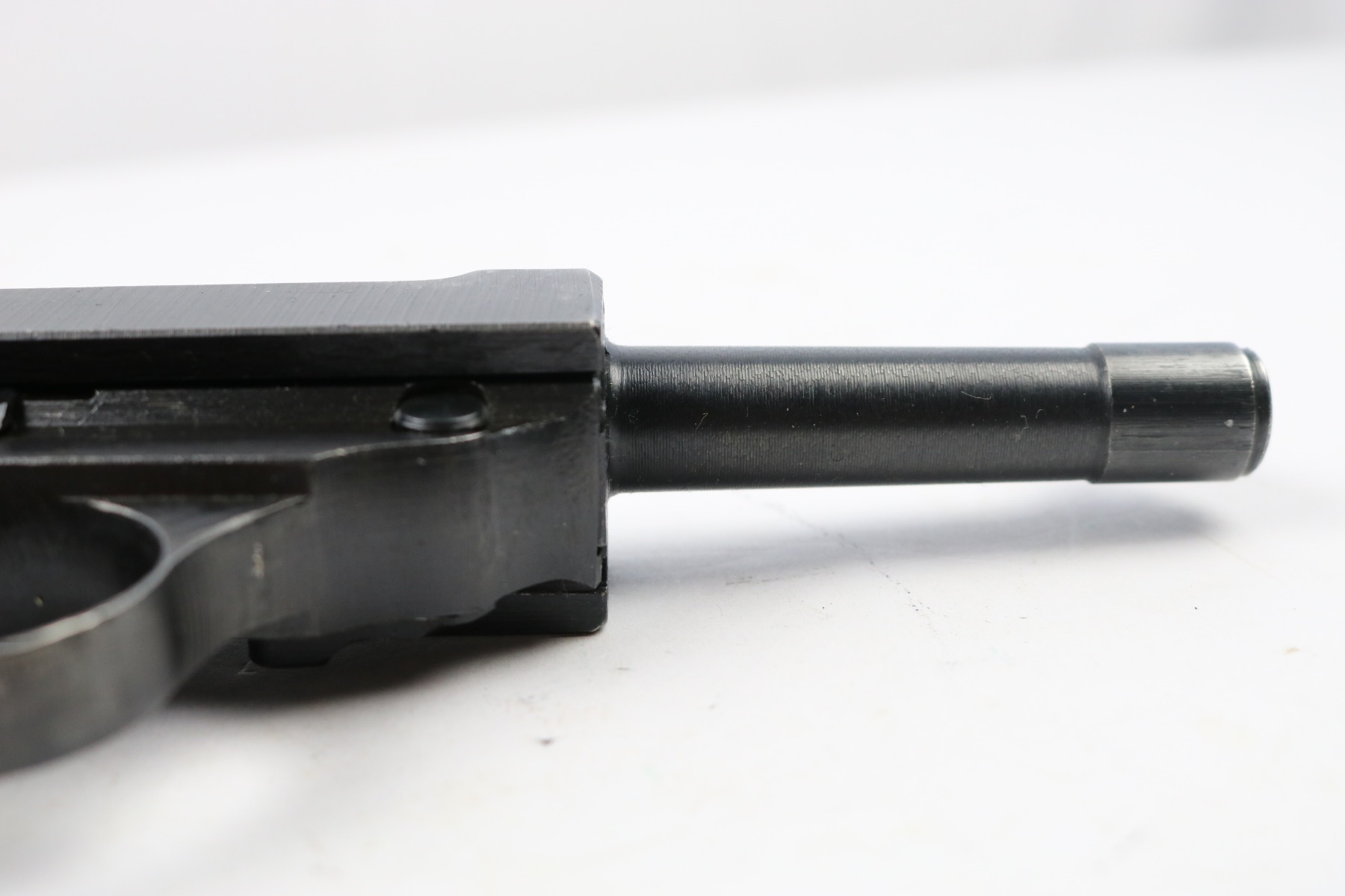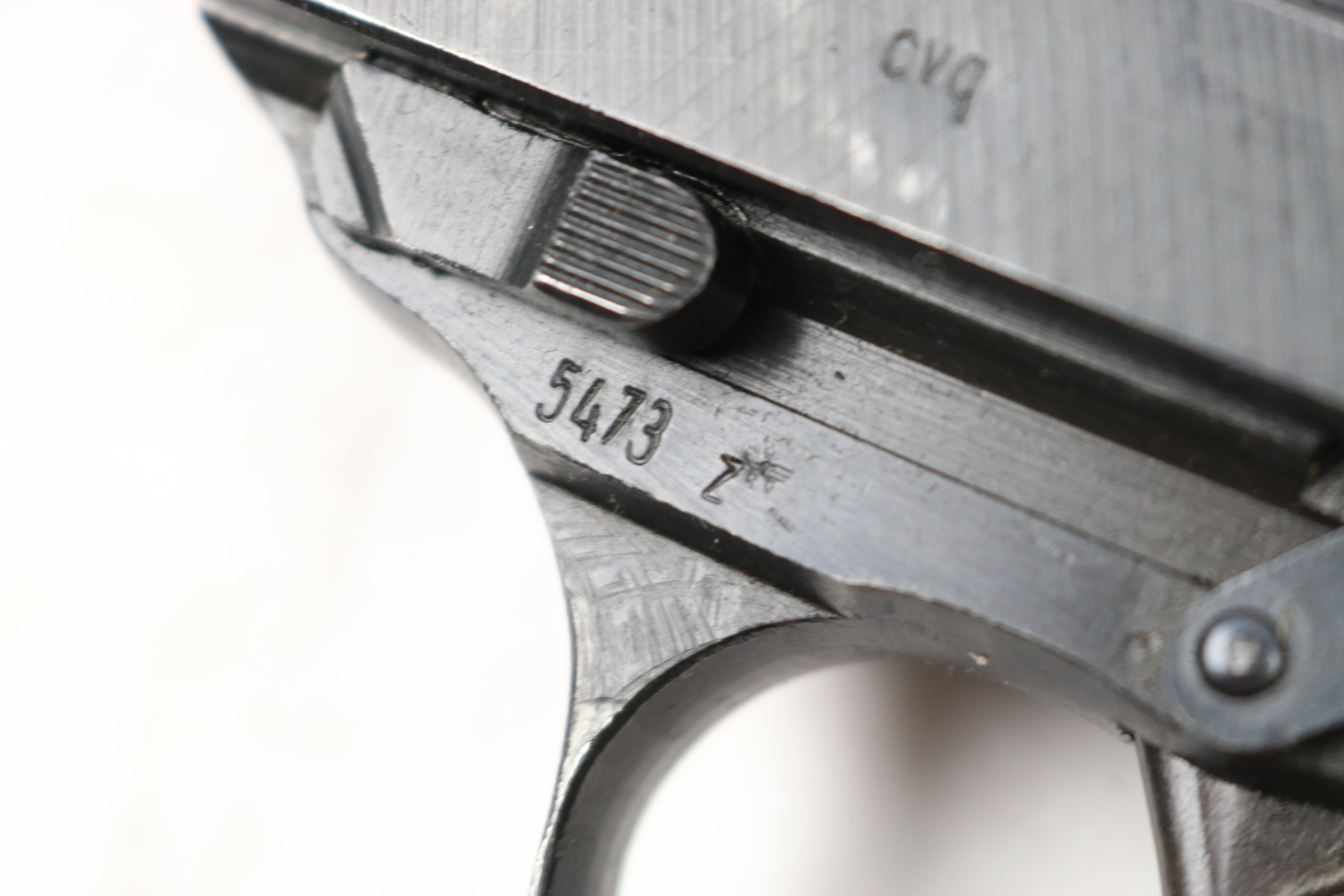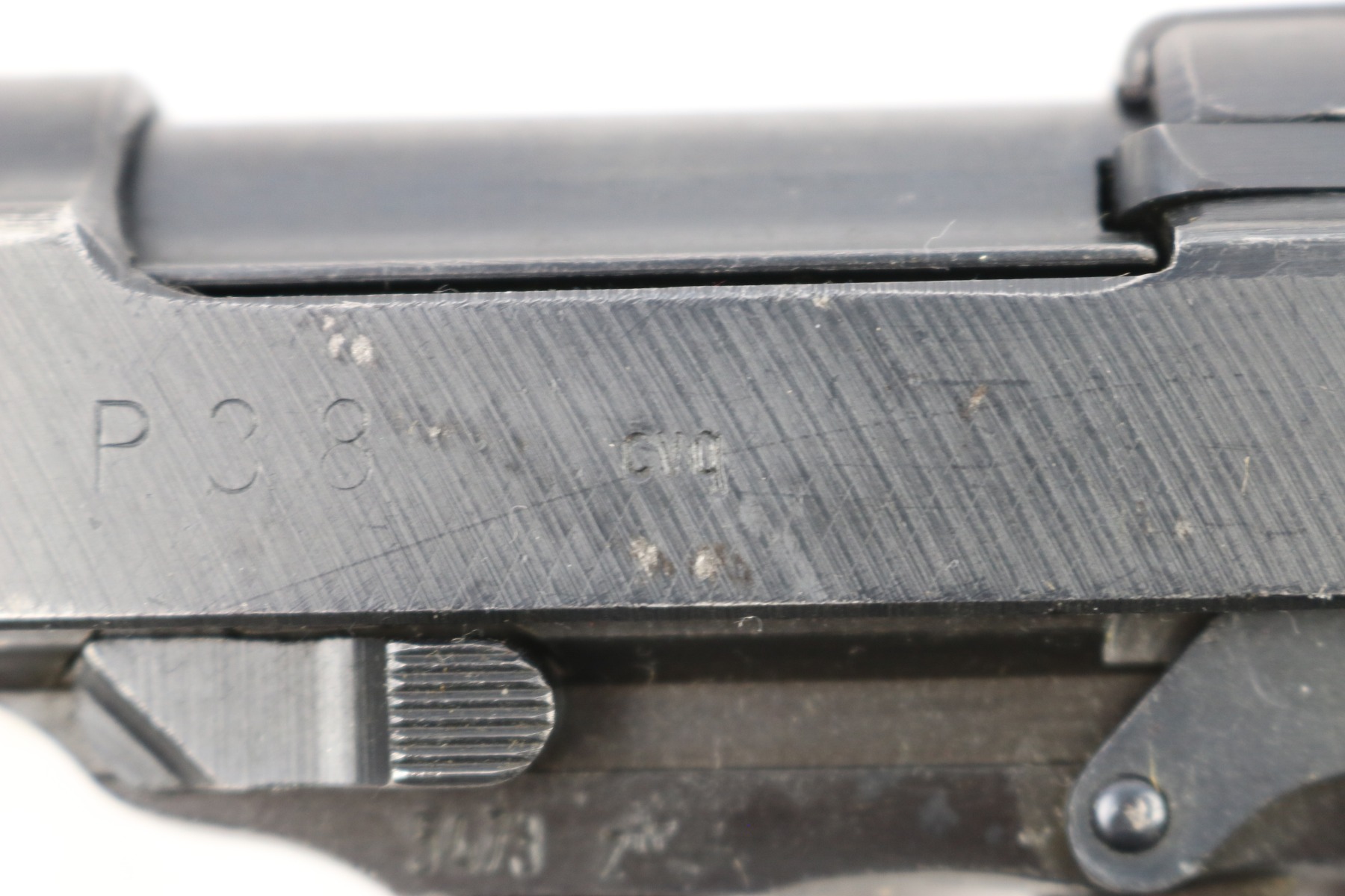 6/12/18 – This is an original 1945 production Spreewerk P.38. The pistol is in the “z” block, meaning it was made in Feb. of 1945 just before the end of the war. Has proper late war features such as a cog hammer and machine markings on the slide and frame. The blued finish is excellent overall, in about 97% condition. There some small spots of wear on the slide and light muzzle wear. The bore is excellent with one or two small spots of patina. Guaranteed original and fully functional.