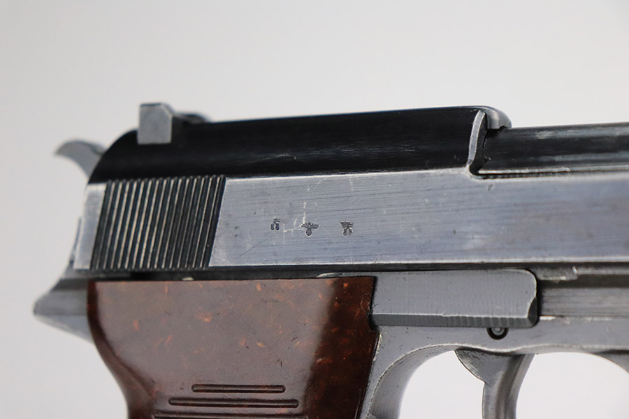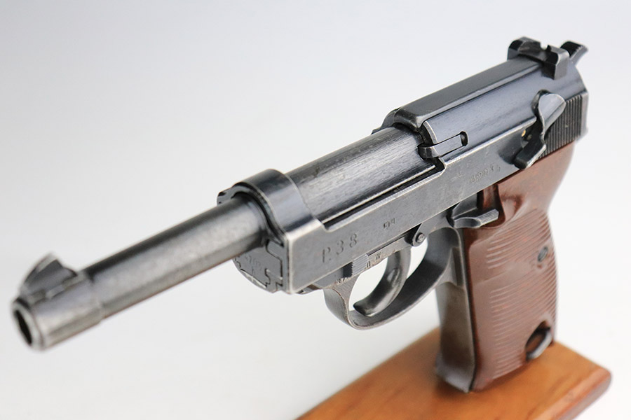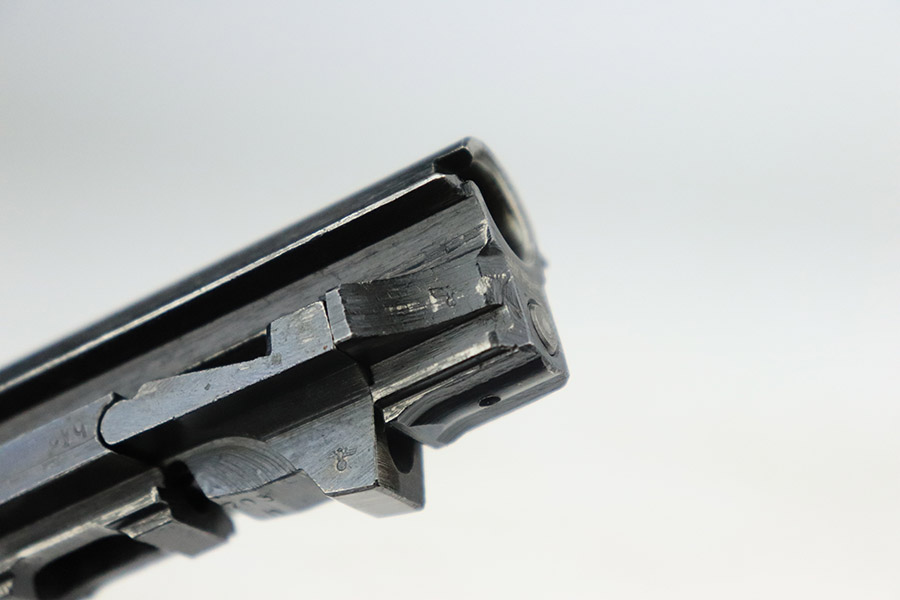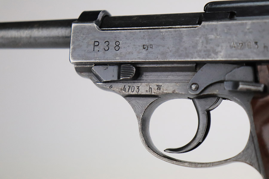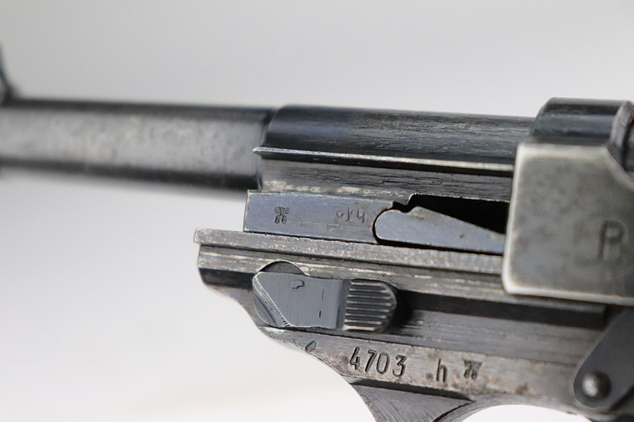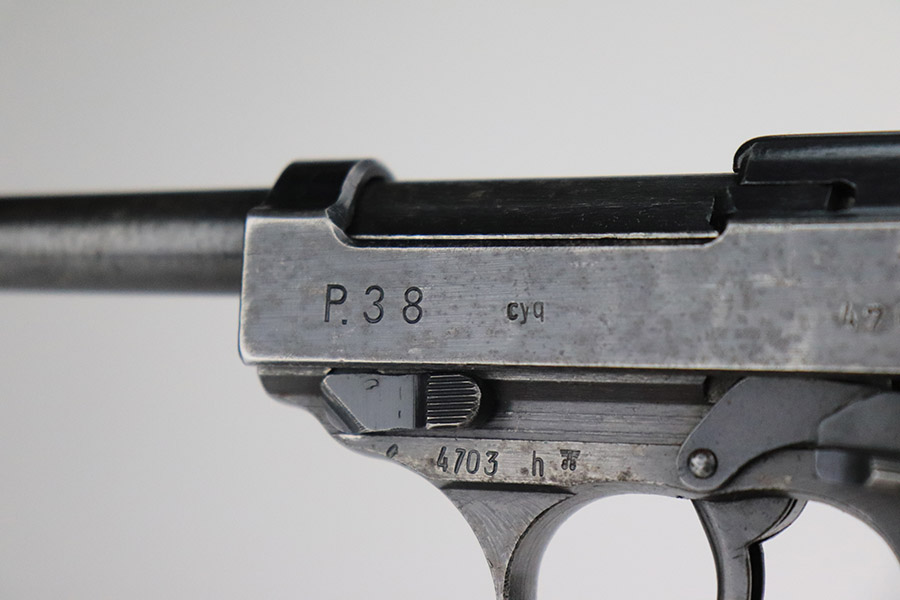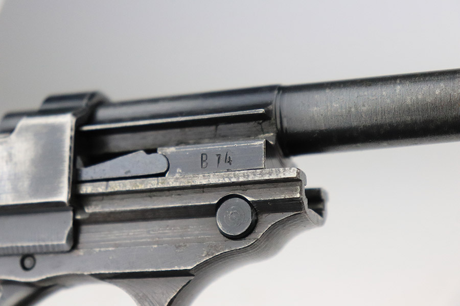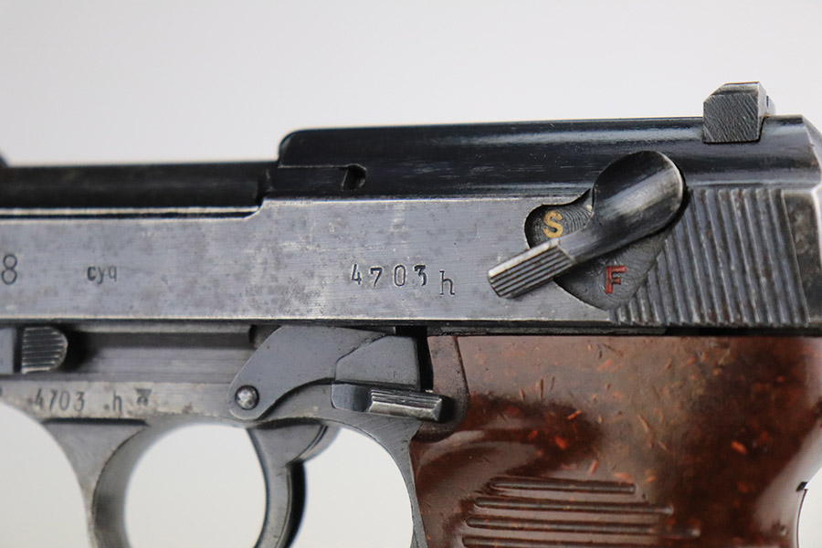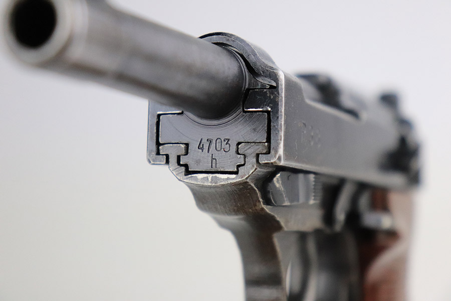 11/7/22 – This is a nice example of a Spreewerk P.38 issued to the Nazi military in October of 1943. It is all matching and has the proper “Eagle 88” military acceptance proofs throughout. The gun has retained roughly 75% of its original finish. The majority of the finish loss is on the front strap, but there is also some thinning along the barrel and minor wear around the muzzle and high edges of the slide. An area of wear at the right front of the slide and some light scratches at the back right of the slide. Areas of spotty oxidation and pin-pricking on the left side of the gun and on the front strap. Comes with excellent reddish bakelite grips and a period-correct jvd magazine. The bore has strong rifling with some minor freckling here and there. De-cocker is functional.