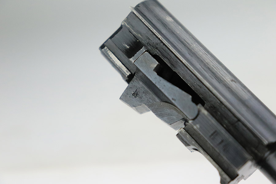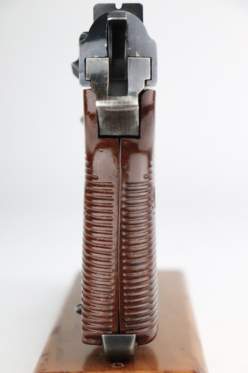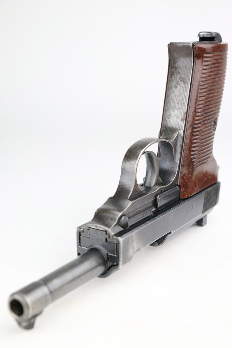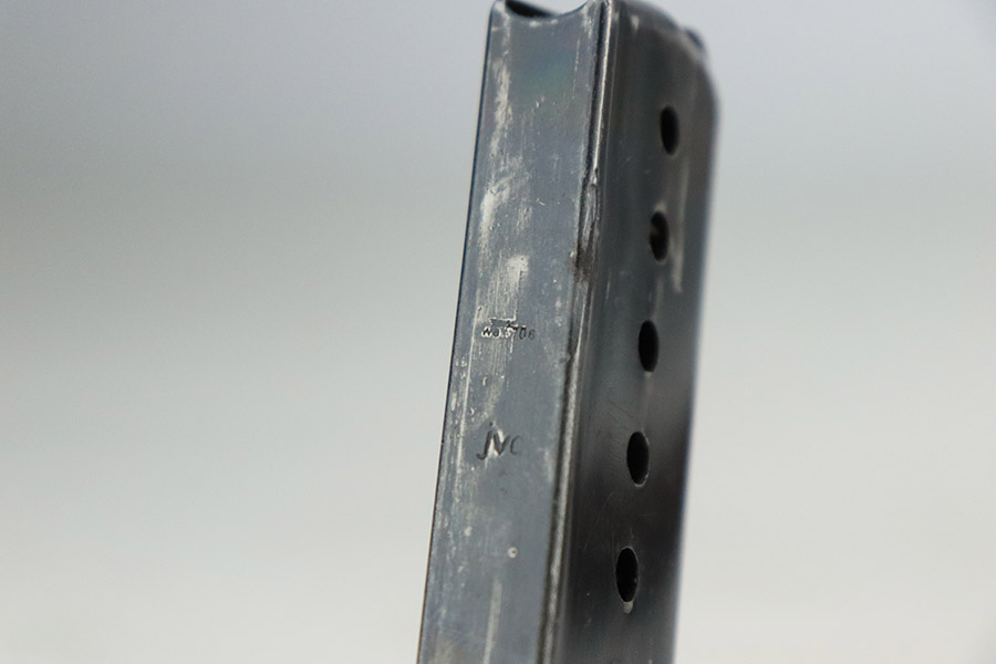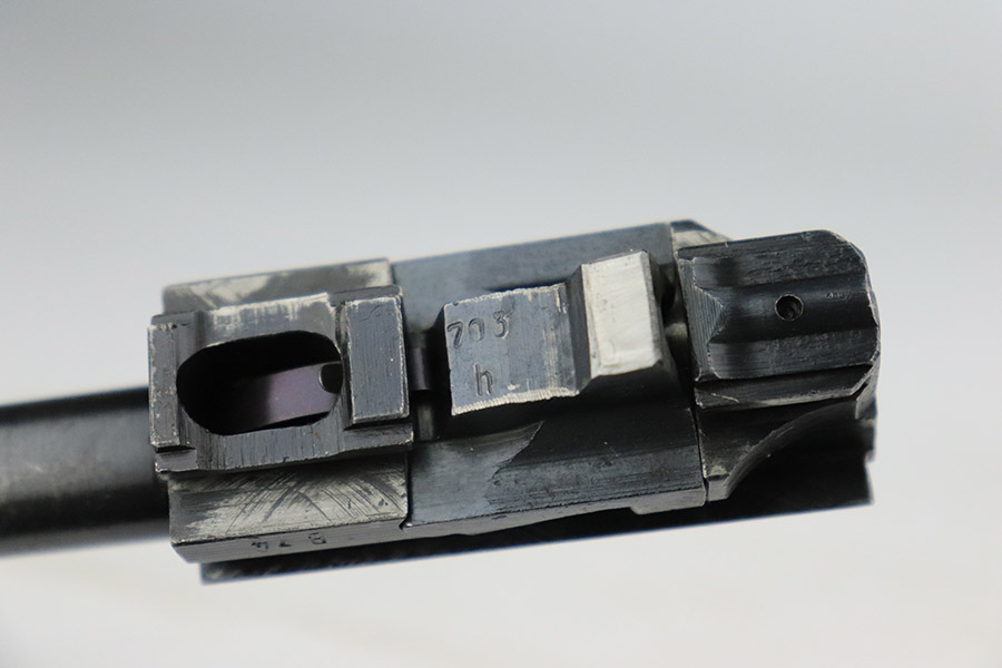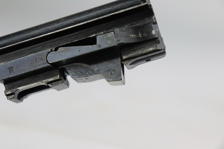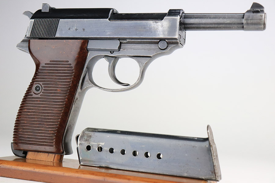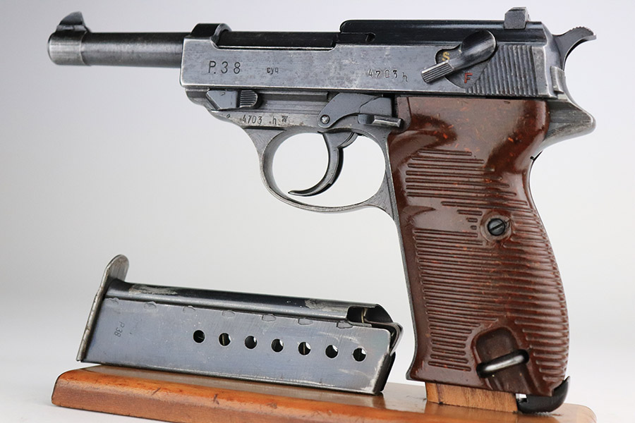 11/7/22 – This is a nice example of a Spreewerk P.38 issued to the Nazi military in October of 1943. It is all matching and has the proper “Eagle 88” military acceptance proofs throughout. The gun has retained roughly 75% of its original finish. The majority of the finish loss is on the front strap, but there is also some thinning along the barrel and minor wear around the muzzle and high edges of the slide. An area of wear at the right front of the slide and some light scratches at the back right of the slide. Areas of spotty oxidation and pin-pricking on the left side of the gun and on the front strap. Comes with excellent reddish bakelite grips and a period-correct jvd magazine. The bore has strong rifling with some minor freckling here and there. De-cocker is functional.