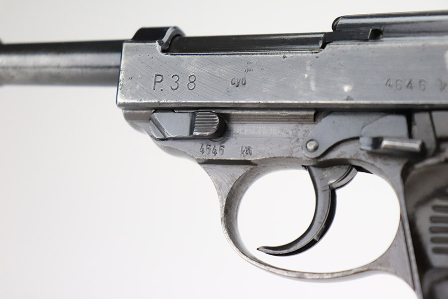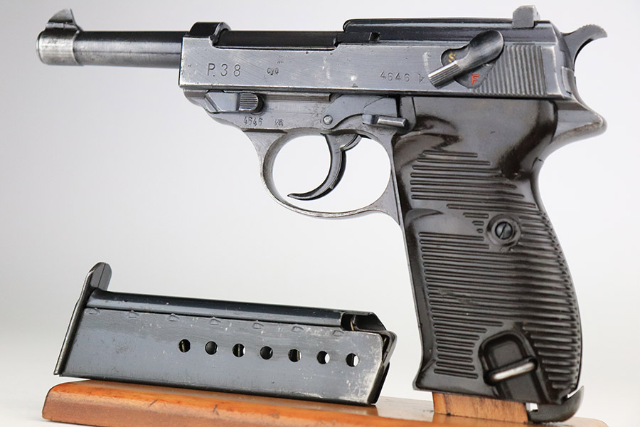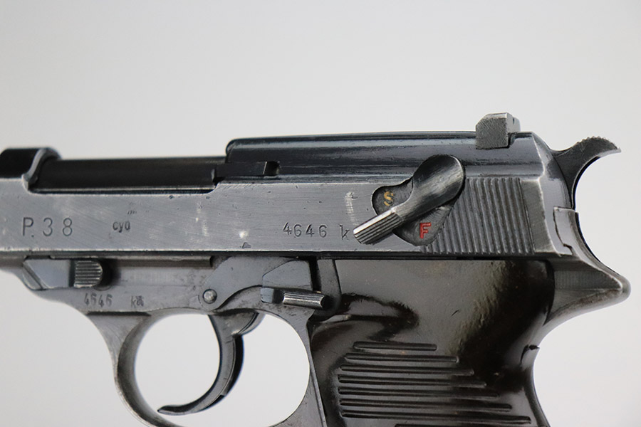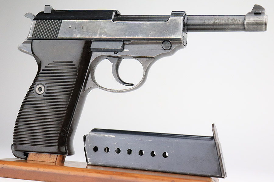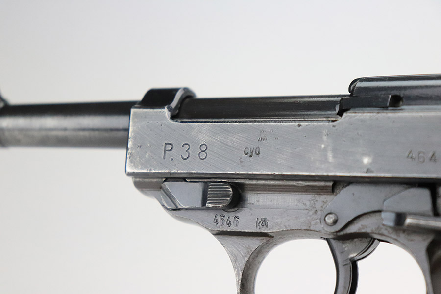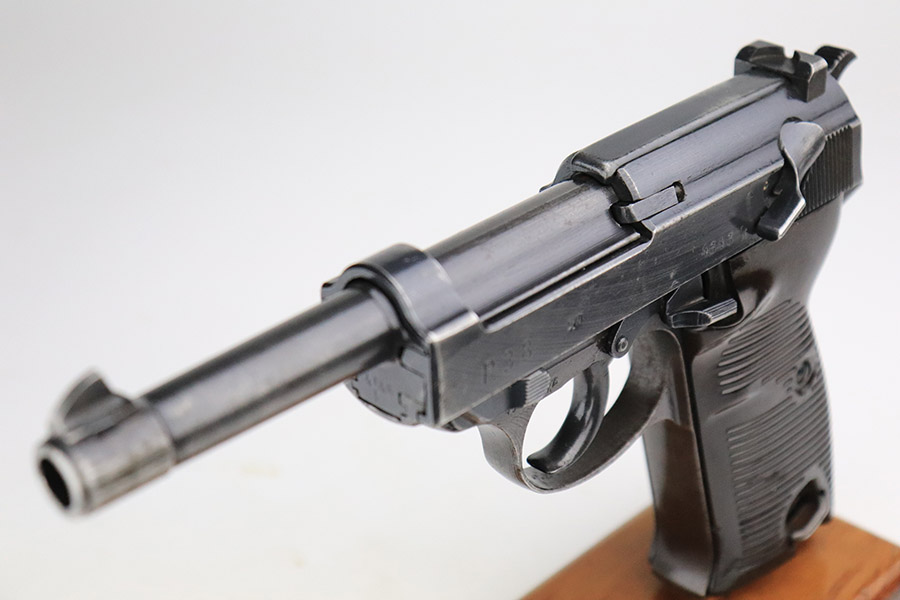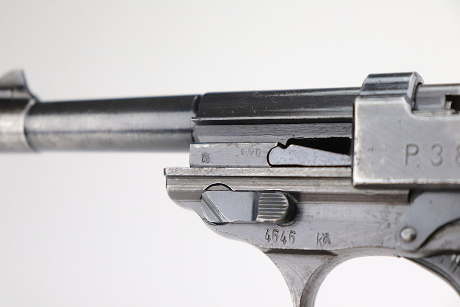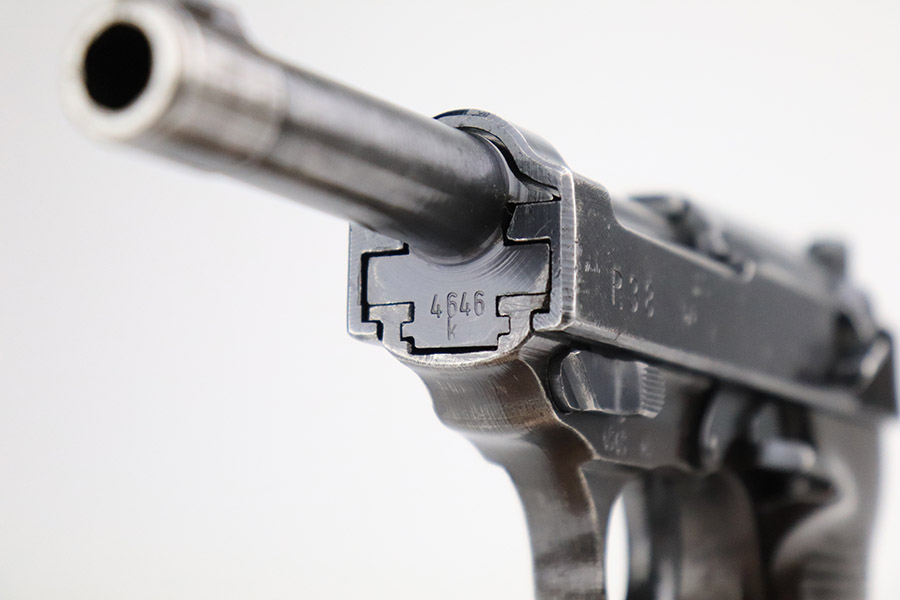 11/22/22 – This is a nice example of a Spreewerk P.38 issued to the Nazi military at the end of 1943. The gun is all matching and has the proper “Eagle 88” military acceptance proofs throughout. It has retained about 90-92% of its original finish. There are areas of light, somewhat spotty wear along both sides of the slide, concentrated mostly around the high edges. There is muzzle wear and minor thinning along the barrel. There is very minor thinning and light spotty oxidation on the front strap and along the whole underside of the frame. Comes with nice period-correct blackish-brown bakelite grips (a couple of dings on the left side) and an un-marked magazine. The bore is near-mint. De-cocker is functional.