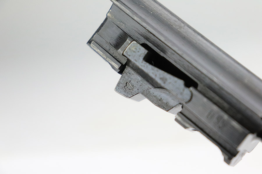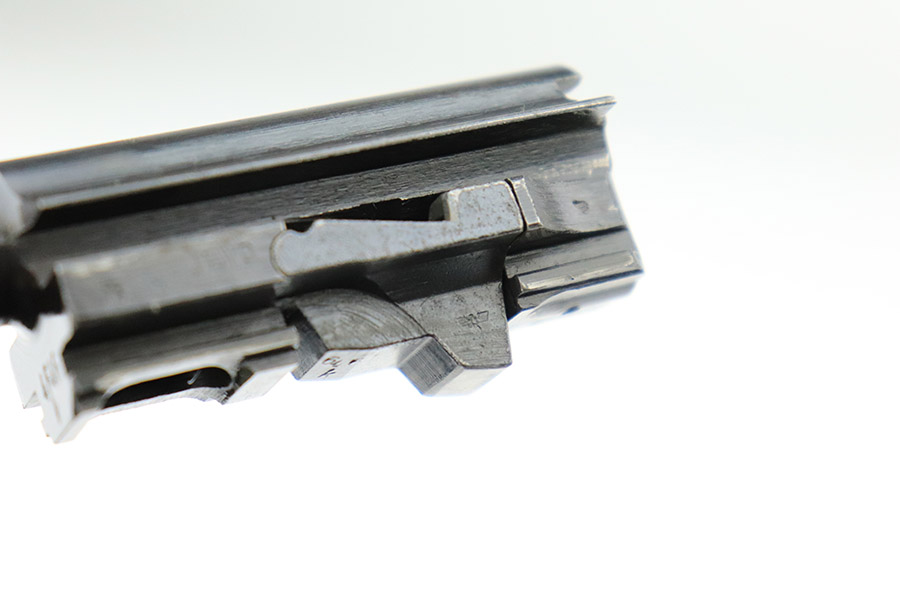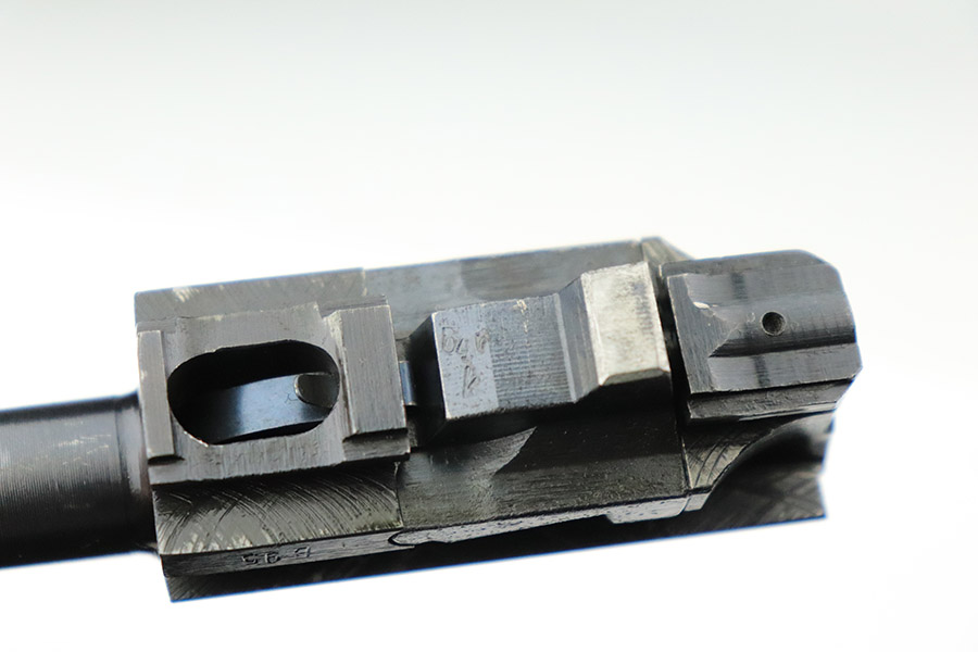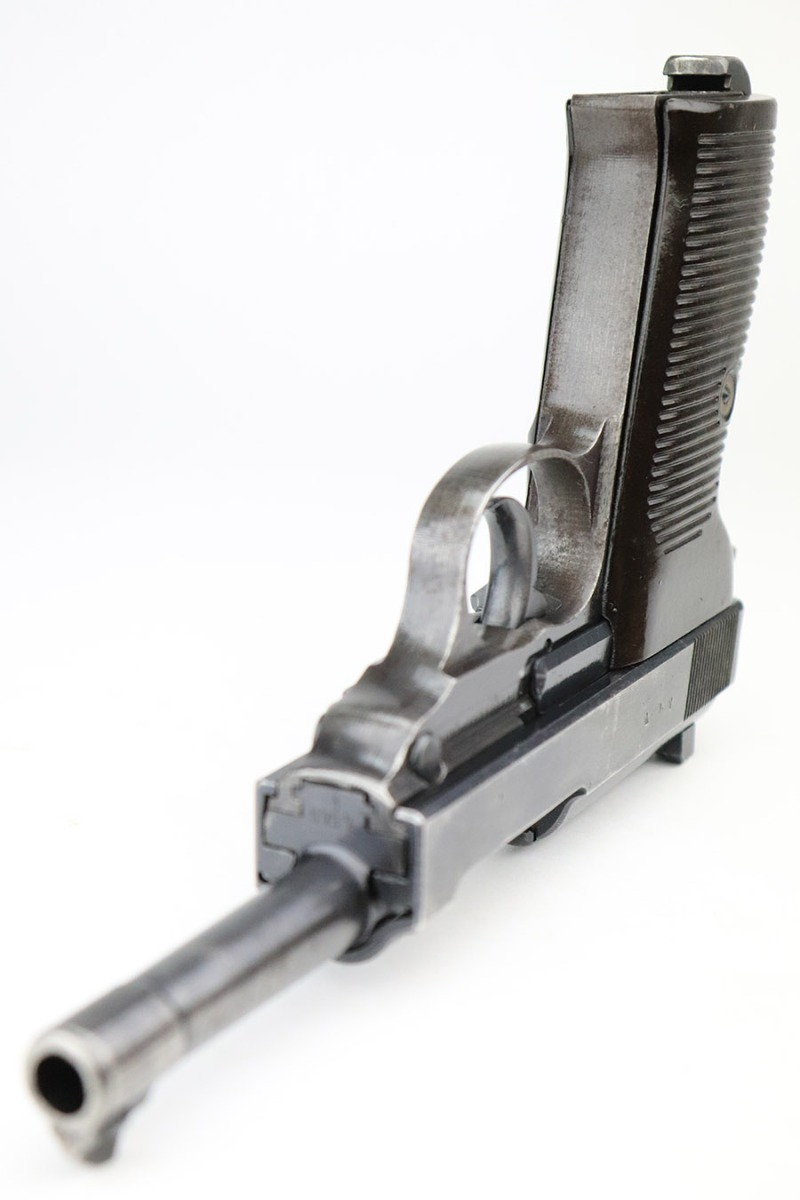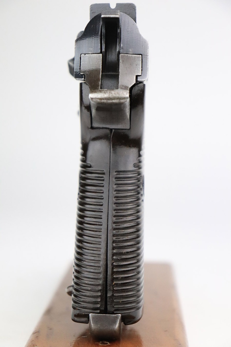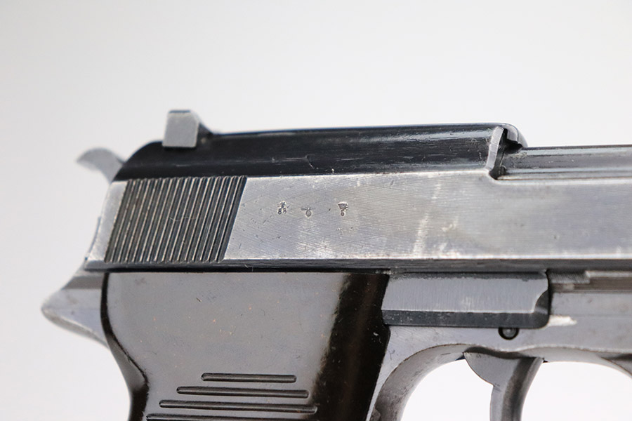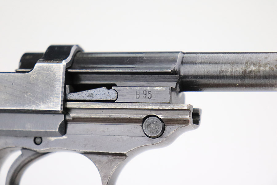 11/22/22 – This is a nice example of a Spreewerk P.38 issued to the Nazi military at the end of 1943. The gun is all matching and has the proper “Eagle 88” military acceptance proofs throughout. It has retained about 90-92% of its original finish. There are areas of light, somewhat spotty wear along both sides of the slide, concentrated mostly around the high edges. There is muzzle wear and minor thinning along the barrel. There is very minor thinning and light spotty oxidation on the front strap and along the whole underside of the frame. Comes with nice period-correct blackish-brown bakelite grips (a couple of dings on the left side) and an un-marked magazine. The bore is near-mint. De-cocker is functional.