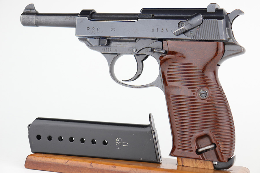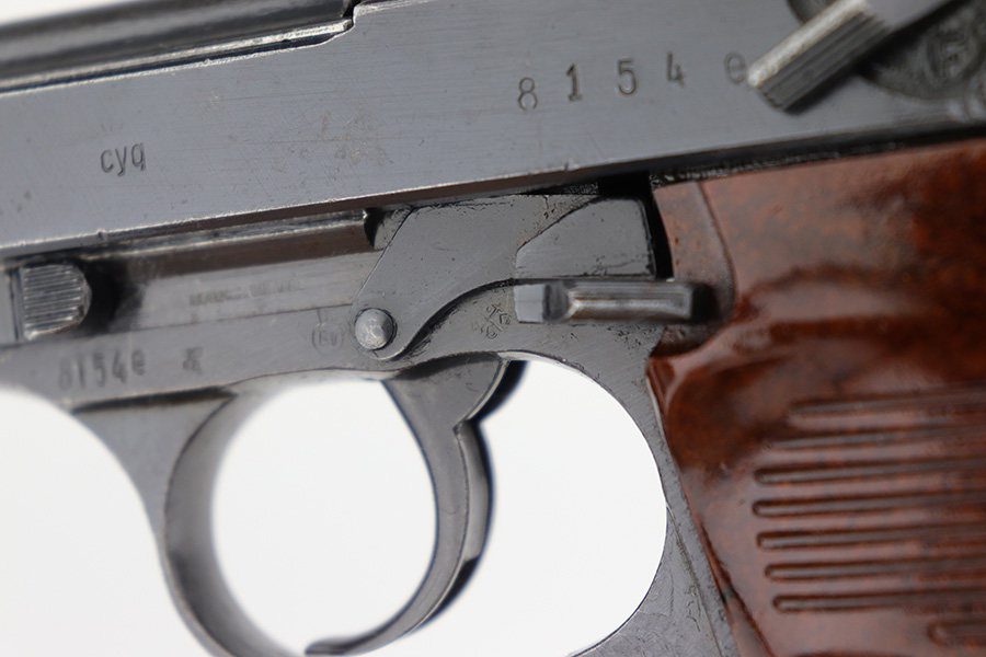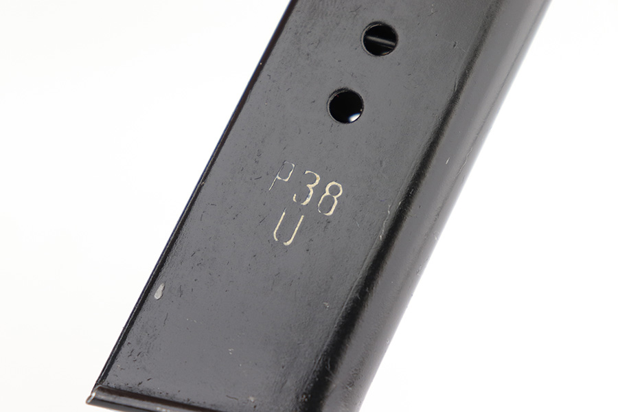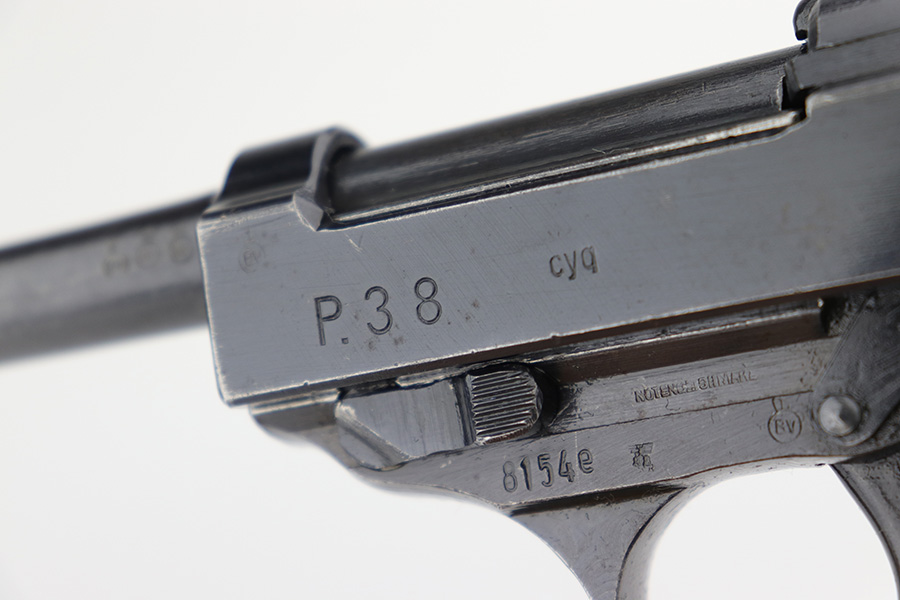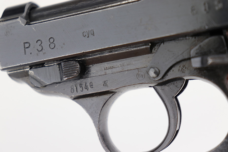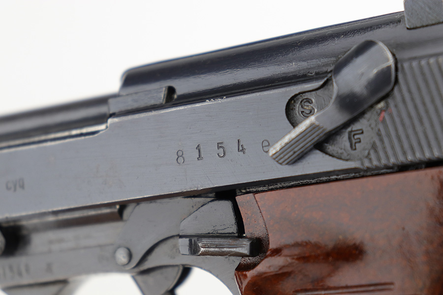 1/10/23 – This is an interesting Spreewerk P.38 from July of 1943 with proofs indicating it went to Britain after the war. The pistol has matching numbers throughout, with minor wear on the sides of the barrel and a little thinning on the front strap. Bore shows some frost throughout. BNP markings on the barrel and slide, and the frame is marked ‘NOT ENGLISH MAKE’. Very nice red grips, with a tiny chip in the rear corner and a hairline crack in the same area. The mag is marked ‘P.38/U’ but has been refinished.