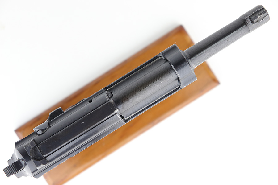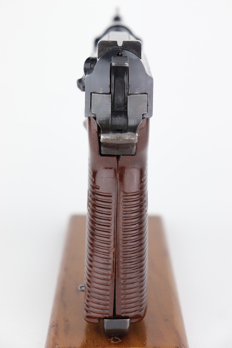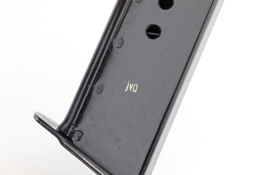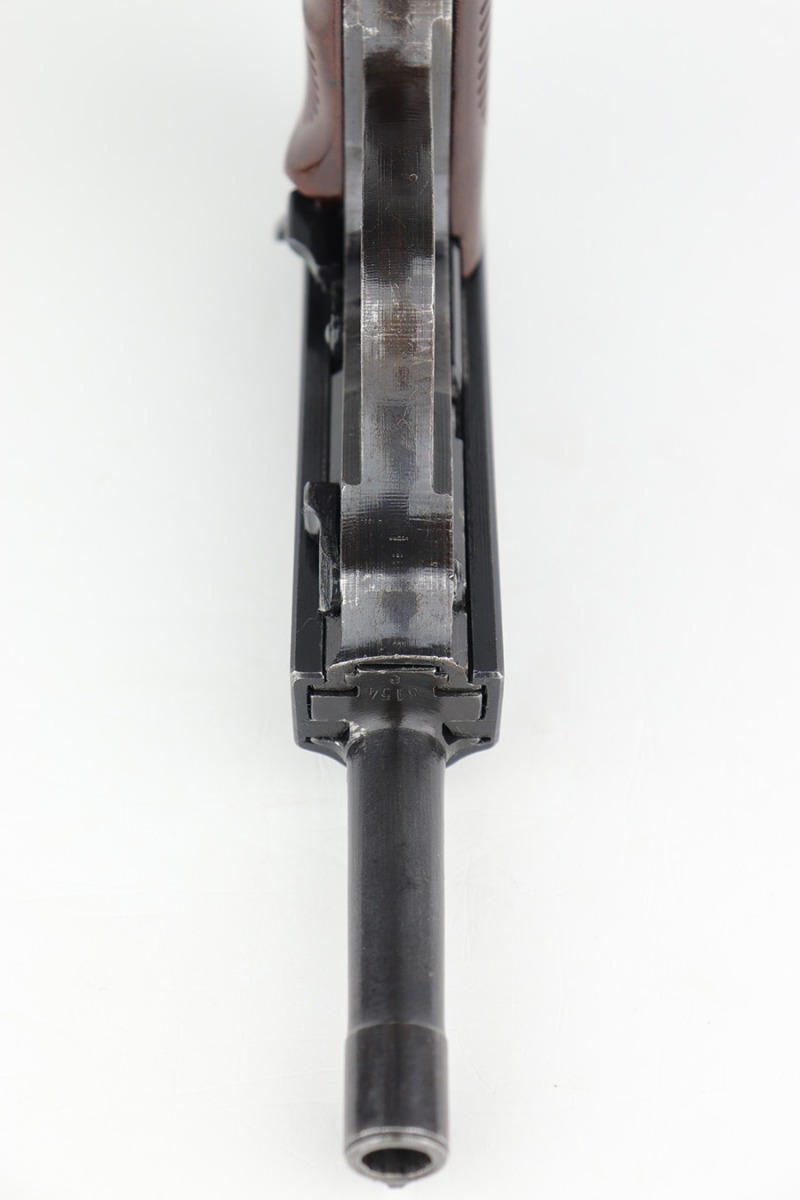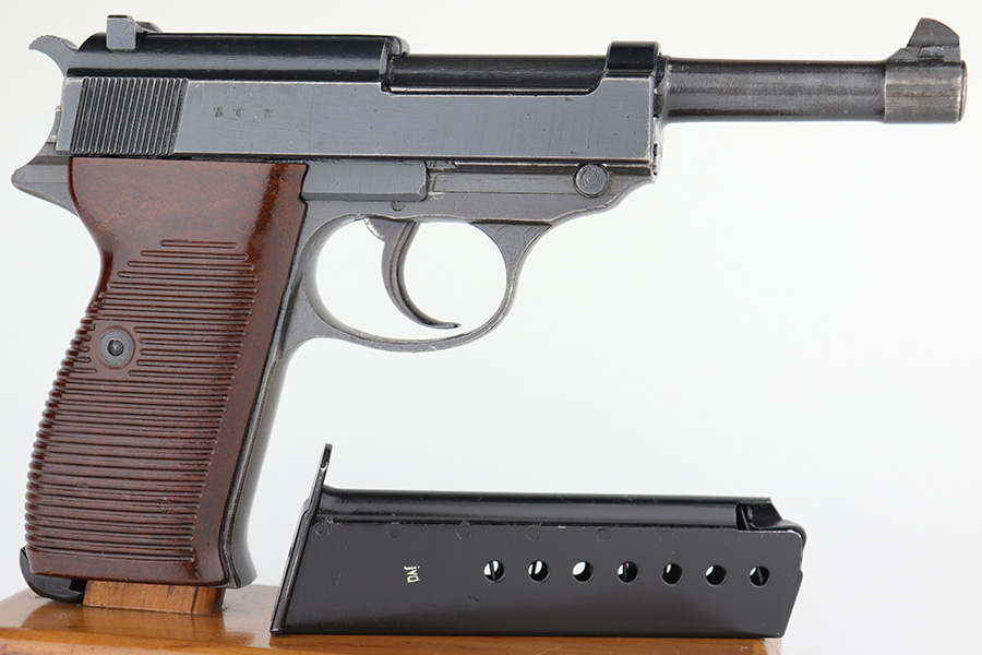 1/10/23 – This is an interesting Spreewerk P.38 from July of 1943 with proofs indicating it went to Britain after the war. The pistol has matching numbers throughout, with minor wear on the sides of the barrel and a little thinning on the front strap. Bore shows some frost throughout. BNP markings on the barrel and slide, and the frame is marked ‘NOT ENGLISH MAKE’. Very nice red grips, with a tiny chip in the rear corner and a hairline crack in the same area. The mag is marked ‘P.38/U’ but has been refinished.