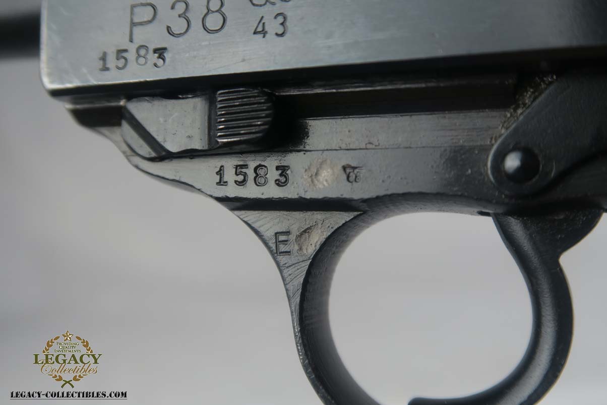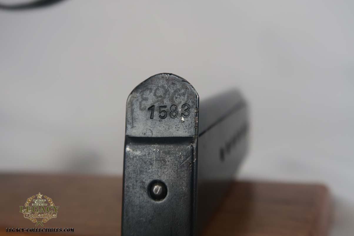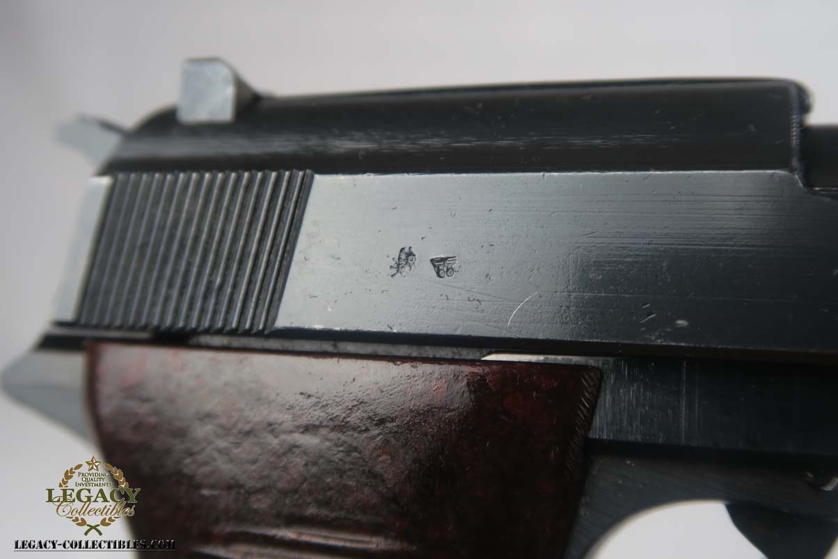 3/23/17 – For you “odd ball” collectors, this is one you want to take a look at.  How about an AC 43 – but Spreewerke proofed P.38 – left over after the war.  Reworked by the Czech’s. one thing that makes this P.38 unique is that the AC on the slide indicates that it was made at the Belgian FN factory. The top of the barrel has the Czech lion.  Also the right side of slide has a Czech proof as well as the Eagle 88.  Left trigger guard has E and Czech lion “peened” off.  Right side trigger guard is 46 marked – the year is was reworked.  It has a cog hammer from 1945.  All numbers match, but it was renumbered or in some cases, first numbered when it was reworked, post war.   It has nice Walther style grips and a Walther proofed magazine that was post war numbered to match. I don’t know a lot about these guns but I know that even though they are post war assembly they are desired by collectors. Oh, and just in case that is not odd enough for you… it has an FNH eagle 76 marked barrel.  It has an early Walther Eagle 359 magazine. The bore shows wear from use and enough frosting that I would call it a 6 out of 10.  Only a few thousand made.  No import marks