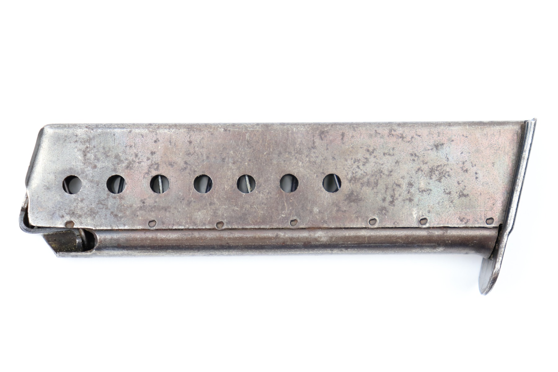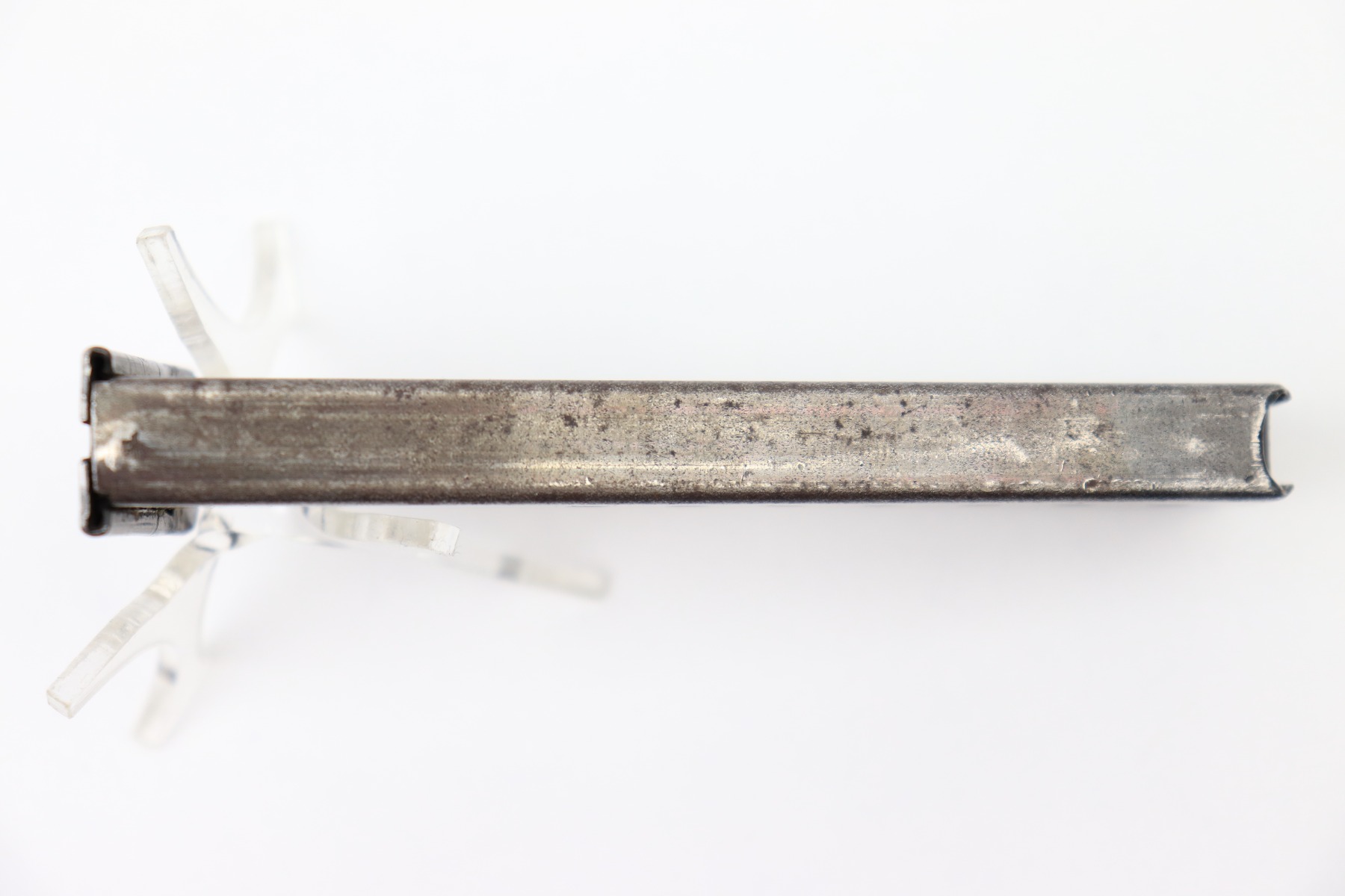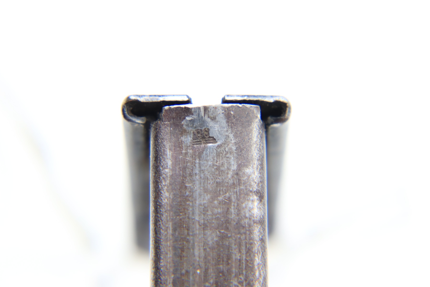 6/20/22 – This is an original Spreewerk P.38 magazine from WW2. The magazine is stamped on the spine with an eagle/88 proof stamp. There are no other markings. The tube has some surface patina and speckling throughout the finish, but no rust or pitting. The spring is strong and functional.