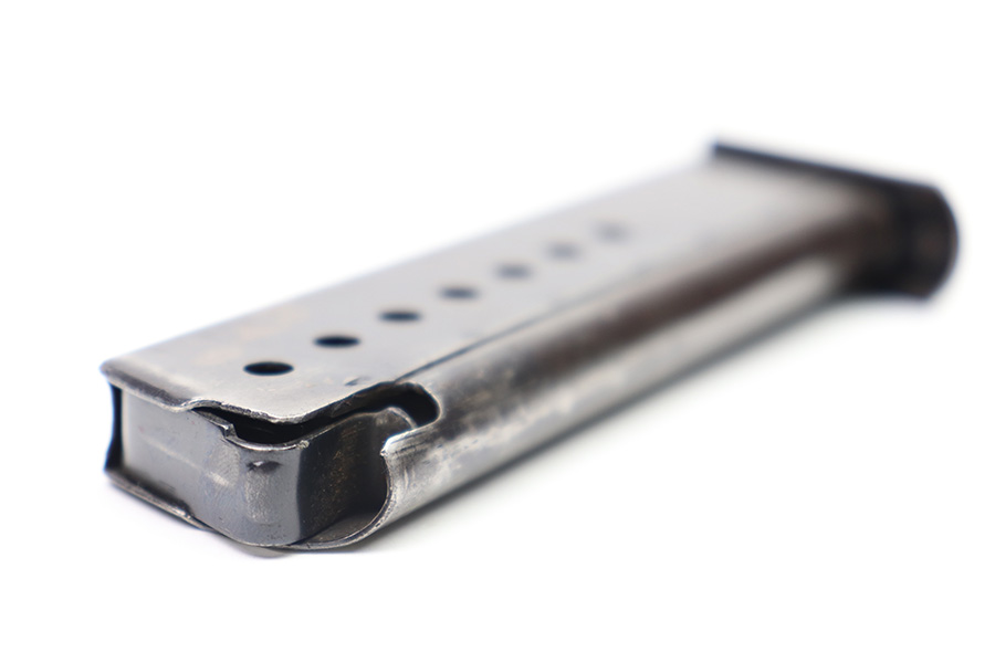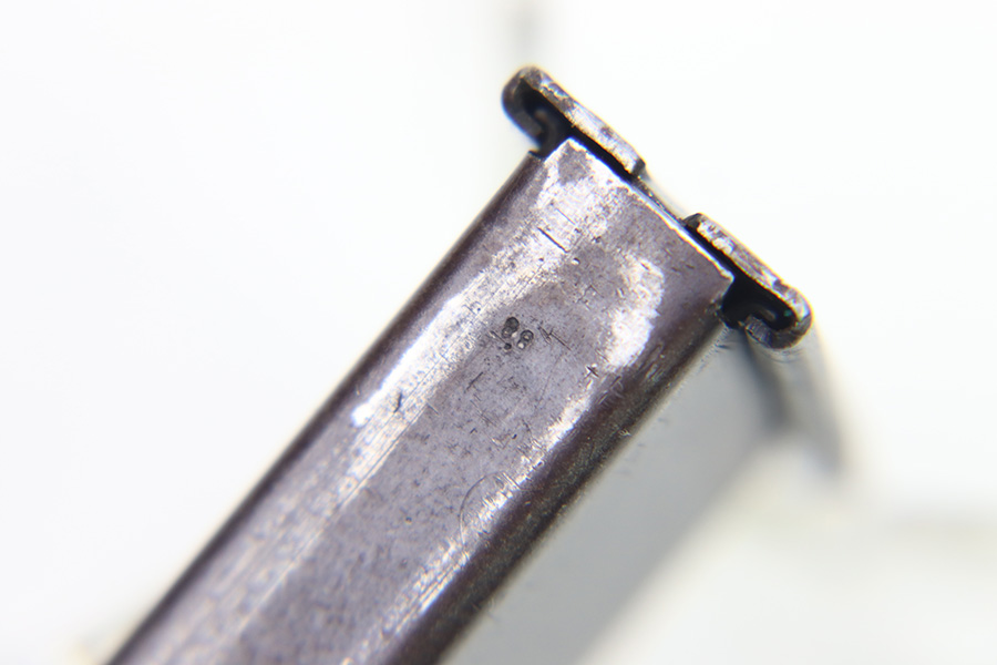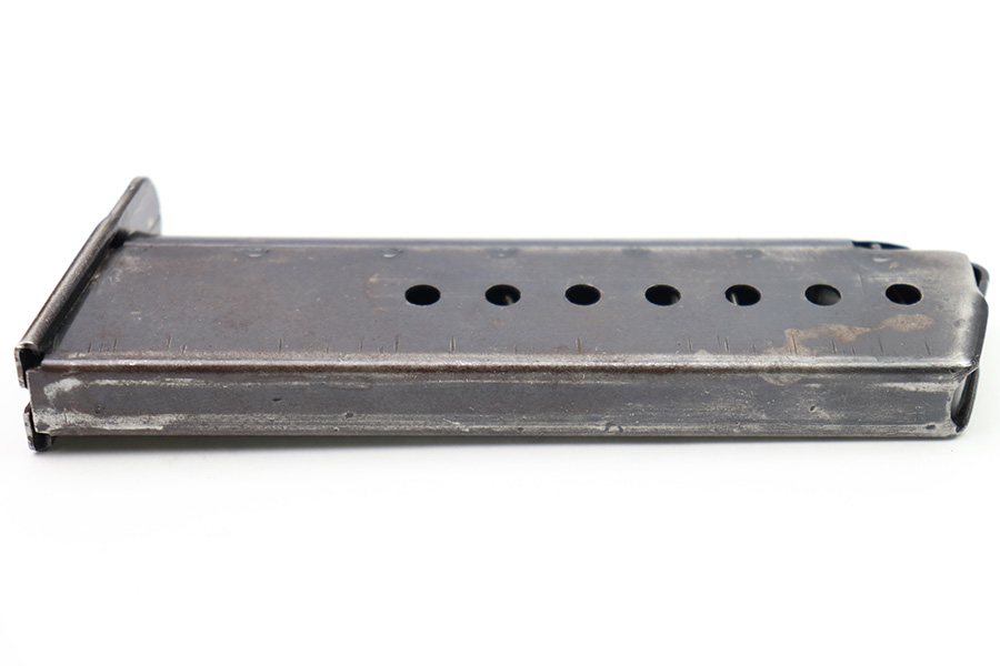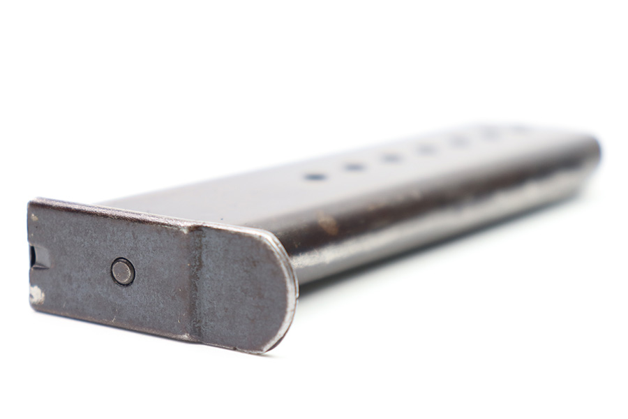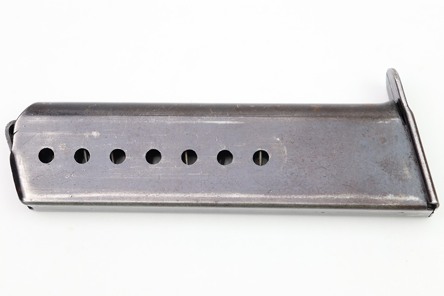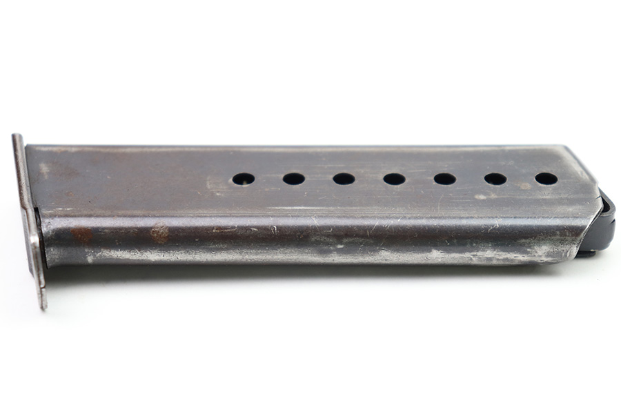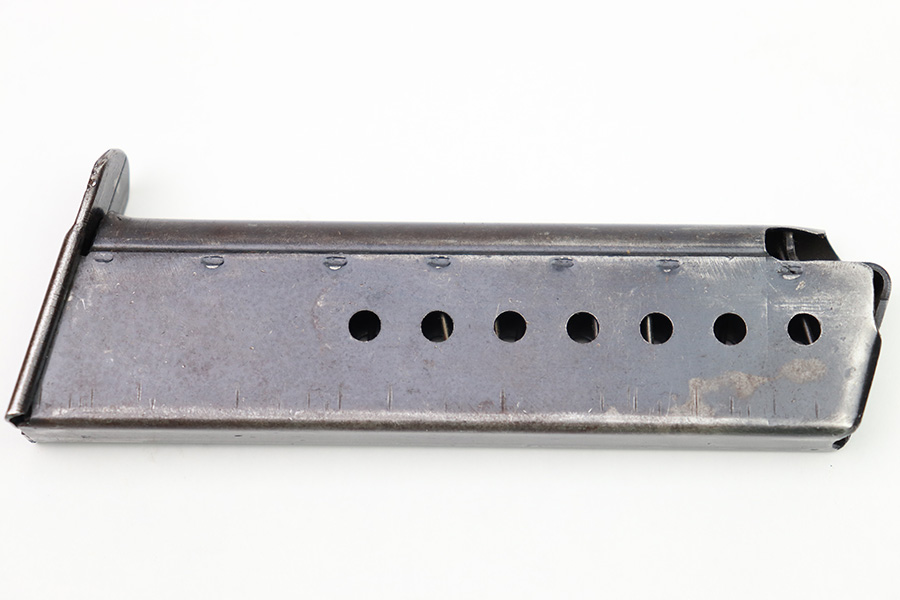 10/6/22 – This is an original WW2 production Spreewerk P.38 magazine. The magazine is stamped on the base of the spine with an eagle/88 military proof stamp from the Spreewerk factory. There’s dark patina throughout the original blued finish and some mild finish loss, but no rust or pitting. Strong, functional spring.