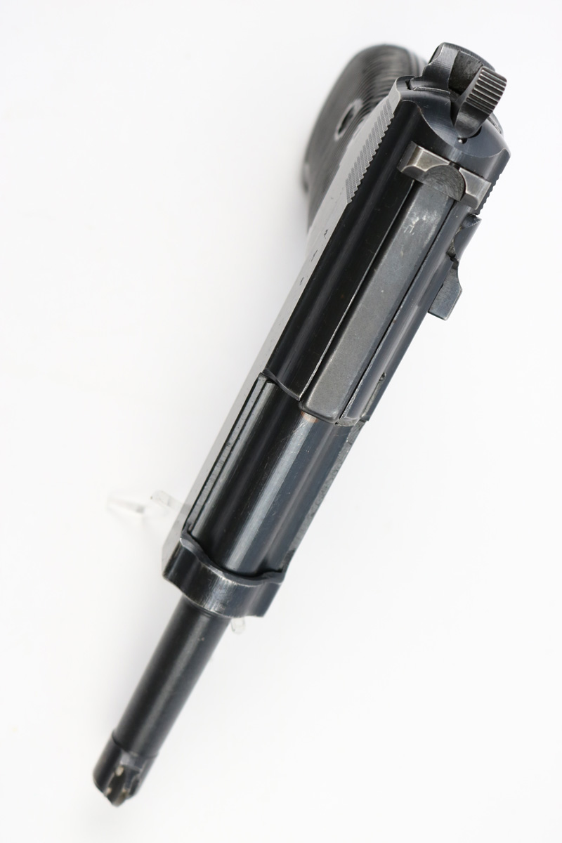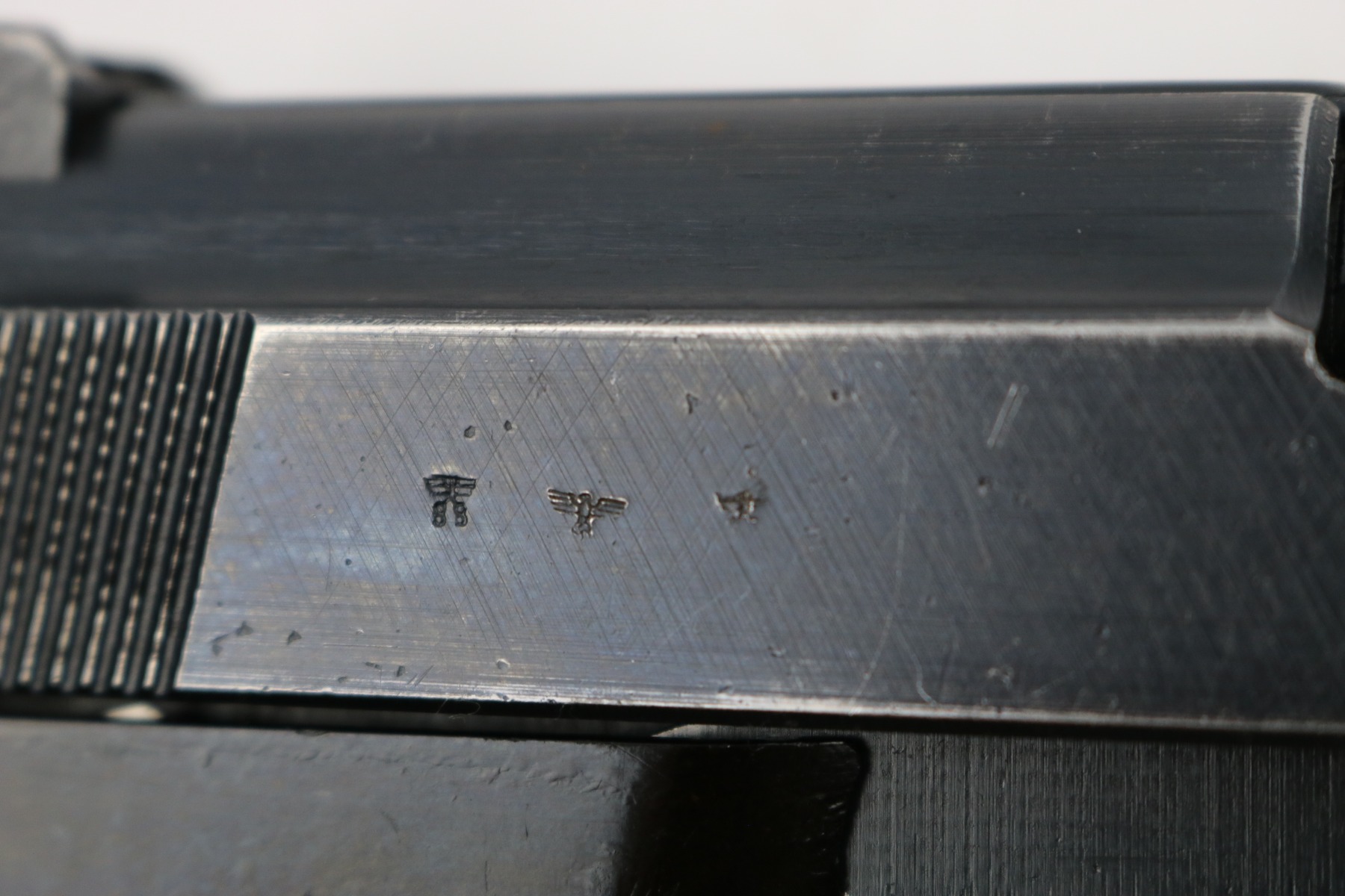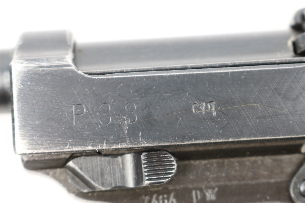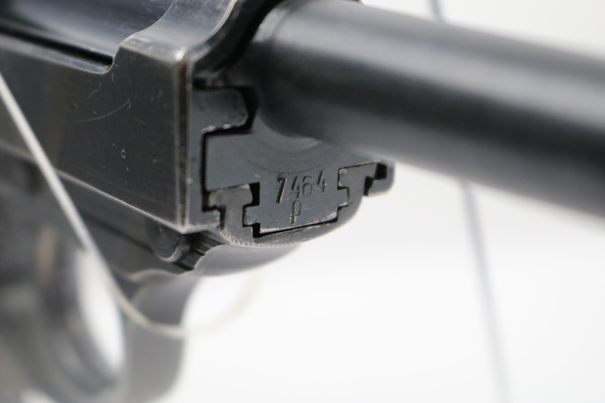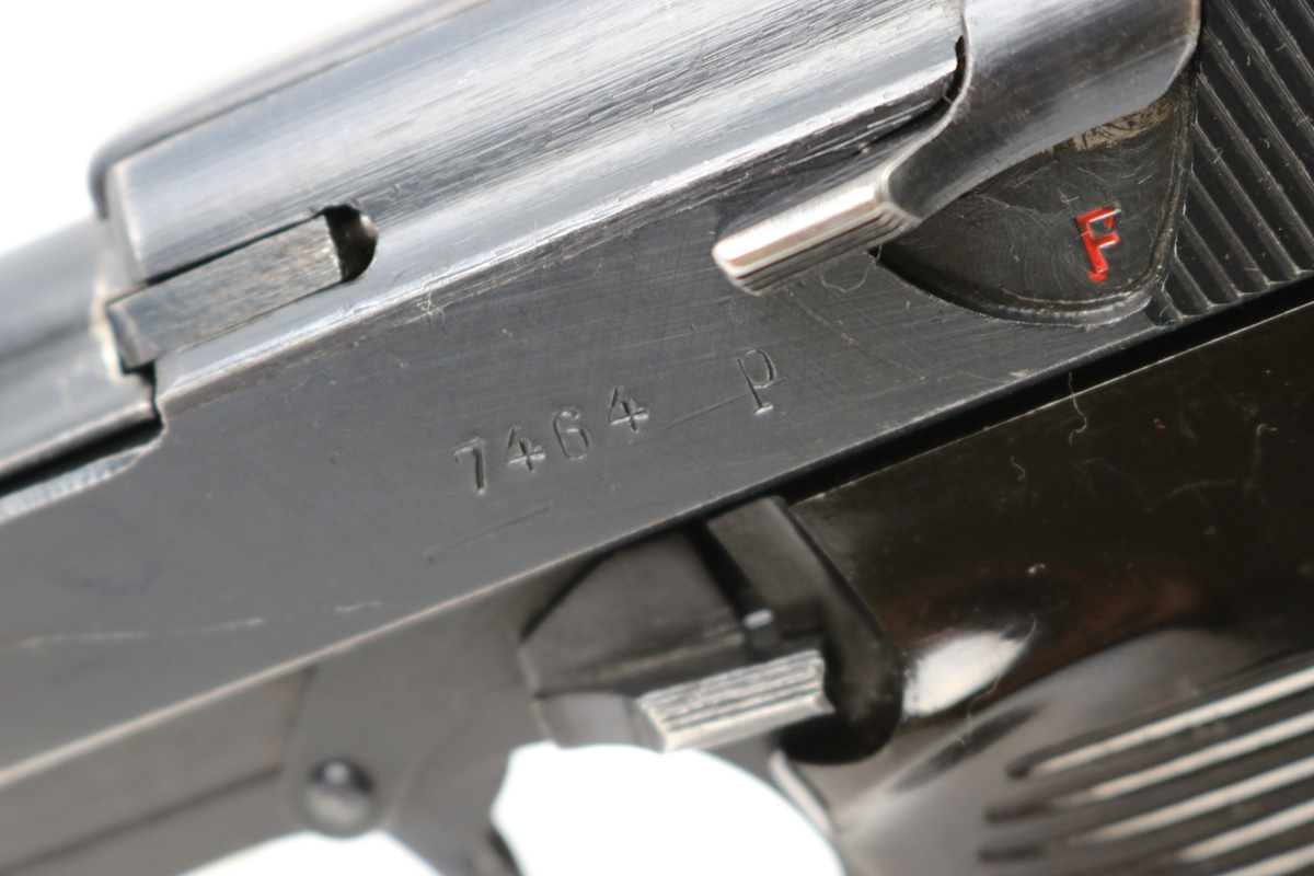 6/20/18 – This is an original WW2 production Spreewerk P.38. The pistol is all correct and original with serial number 7464p. The serial number puts time of production around May of 1943. The slide has some light thinning and edge wear. There’s similar thinning on the barrel as well. The front strap (commonly) has bluing loss throughout. The bore is very clean though with strong rifling and only trace amounts of patina (normal use wear). Comes with period correct and original grips, as well as a waffen 706 jvd magazine.